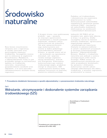 Środowisko naturalne Nasz biznes nieuchronnie związany jest z ingerencją w zasoby naturalne oraz poszczególne elementy środowiska. Szczególnie istotne jest to zwłaszcza w segmencie Poszukiwania i Wydobycie, a odpowiedzialność firmy w tym przypadku polega na minimalizacji wpływu na środowisko naturalne, racjonalnym gospodarowaniu zasobami oraz odpadami, a w razie potrzeby rekompensowaniu skutków naszej ingerencji. Z d r u g i e j s t r o n y, n a s z p o d s t a w o w y produkt – gaz – pozwala na znaczące ograniczenie, w porównaniu z innymi paliwami kopalnymi, wielkości emisji z a n i e c z y s z c z e ń d o a t m o s f e r y. Ta k w i ę c u p o w s z e c h n i e n i e jego wykorzystania jest istotne w dobie globalnego przeciwdziałania zmianom klimatu, w sposób znany od lat – do kuchenek czy ogrzewania mieszkań, jak i poprzez rozwój nowego segmentu naszej działalności, którym jest Energetyka. Elektrownie wykorzystujące gaz zamiast tradycyjnego węgla, produkcja energii w skojarzeniu, OZE i wykorzystanie biomasy będą wpływać korzystnie na poprawę powietrza atmosferycznego. Podobny cel środowiskowy i ekonomiczny ma wspieranie popularyzacji na rynku motoryzacyjnym samochodów napędzanych sprężonym gazem ziemnym (CNG) – począwszy od samochodów osobowych, skończywszy na autobusach i samochodach dostawczych. Jednostki GK PGNiG od lat, wszędzie tam, gdzie były obecne, w kraju i za granicą, kładły szczególny nacisk na kwestie ochrony środowiska, ograniczanie negatywnego wpływu i proekologiczne inwestycje. Znalazło to odzwierciedlenie w celach i działaniach przyjętych w Strategii Zrównoważonego Rozwoju i Odpowiedzialnego Biznesu. Dbałość o środowisko naturalne jest jednym z sześciu strategicznych celów naszej Strategii. PGNiG uznaje, że najważniejszym wyzwaniem jest takie prowadzenie działalności, by sprawnie i efektywnie wykorzystać szeroki zakres swojego oddziaływania dla dobra środowiska, a wszelkie zagrożenia przekształcić w szanse. 7. Prowadzenie działalności biznesowej w sposób odpowiedzialny i z poszanowaniem środowiska naturalnego Cel I Wdrażanie, utrzymywanie i doskonalenie systemów zarządzania środowiskowego (SZŚ) Recertyfikacje w 10 jednostkach GK PGNiG Prowadzenie prac zmierzających do wdrożenia SZS w WSG i MSG 38 PGNiG Zadania 38 zrealizowane 78 w toku 16 opóźnione Grzegorz Sojski Dyrektor, Biuro Ochrony Środowiska, Departament Inwestycji Efekt 75% jednostek GK posiada SZŚ. Pierwszy etap prac zmierzających do ujednolicenia sposobów identyfikacji oraz kryteriów oceny aspektów środowiskowych Odpowiedzialna energia 39 Jednostki GK PGNiG, w których wdrożono: System Zarządzania Środowiskowego ISO 14001 oraz HSE Centrala Spółki i Oddziały PGNiG SA, w tym Oddziały Obrotu Gazem (OOG) Spółki GK PGNiG, w tym Spółki Gazownictwa (SG) System Zarządzania Środowiskowego ISO 14001 Zakłady Gazownicze (ZG) Spółek Gazownictwa Pozostałe jednostki, bez systemów Pomorska SG ZG w Gdańsku Pomorski OOG ZG w Koszalinie ZG w Olsztynie ZG w Szczecinie PNiG Nafta w Pile ZG Białystok ZG w Bydgoszczy Geofizyka Toruń ZG Ciechanów ZG w Poznaniu INVESTGAS Wielkopolska SG Mazowiecka SG CLPB w Warszawie Wielkopolski OOG Geovita BUD-GAZ PN Diament Centrala PGNiG SA Mazowiecki OOG Oddział w Zielonej Górze ZG w Kaliszu ZG Warszawa ZG Mińsk Mazowiecki ZG Łódź Oddział w Odolanowie ZG Radom ZG Zgorzelec BSiPG Gazoprojekt ZG w Lublinie Dolnośląska SG ZG Wrocław Dolnośląski OOG ZG w Kielcach ZG Wałbrzych ZG w Sandomierzu ZG w Opolu Górnośląska SG ZG w Zabrzu Górnośląski OOG BUG Gazobudowa w Zabrzu Geofizyka Kraków ZG w Krakowie GK PNiG Kraków Systemy zarządzania środowiskowego w jednostkach GK PGNiG doskonale służą dobrowolnemu ograniczeniu negatywnego wpływu na środowisko i potwierdzają, że jednostki działają zgodnie z obowiązującymi normami prawa. Zidentyfikowany w danej jednostce aspekt środowiskowy (np. emisja spalin, zużycie wody, czy emisja hałasu), będąc źródłem wpływu na środowisko, może się odnosić do przeszłych, teraźniejszych i przyszłych działań, produktów i usług. Znaczące, tj. wybrane na podstawie stosownych kryteriów, aspekty środowiskowe bezpośrednio przekładają się na pozostałe elementy systemu, tj. politykę środowiskową, cele i zadania, monitorowanie i pomiary oraz sterowanie operacyjne. SZŚ mają bezpośredni wpływ na poprawę wizerunku firmy i wiarygodności wobec administracji publicznej, klientów oraz na kształtowanie świadomości ekologicznej pracowników. Obok korzyści wizerunkowych i podniesienia wiarygodności firmy, można także wymienić wiele przykładów korzyści bezpośrednio przekładających się na efekty ekonomiczne. W wersji elektronicznej niniejszego raportu znajdą Państwo więcej informacji na temat dobrych praktyk w tym zakresie funkcjonujących w GK. 40 PGNiG Karpacka SG Karpacki OOG ZG w Tarnowie ZG w Rzeszowie ZRUG ZG w Jarosławiu Podgórska Wola PNiG Jasło ZUN Naftomet ZG w Jaśle ZRG Krosno Oddział w Sanoku BN Naftomontaż Specjalistyczne szkolenia Wypełnianie wymagań z zakresu ochrony środowiska wymaga szerokiej wiedzy i doświadczenia, przede wszystkim ze względu na zmieniające się prawo ochrony środowiska oraz rosnącą wagę tych zagadnień. GK PGNiG może poszczycić się doskonałą kadrą, posiadającą zarówno kierunkowe wykształcenie, jak i długoletnią praktykę zawodową. PGNiG dba również o edukację wszystkich pracowników GK w zakresie ochrony środowiska. Cel II Wykorzystywanie elementów systemu zarządzania środowiskowego w spełnianiu wymagań HSE Manual HSE w PNiG Nafta Piła Efekt In t e g r a c j a i s t n i e j ą c y c h s y s t e m ó w z a r z ą d z a n i a i i c h e l e m e n t ó w. Program STOP w PNiG Kraków Utrzymanie silnej pozycji i wiarygodności na rynkach zagranicznych wymaga od jednostek GK PGNiG wypełnienia postulatów systemu zarządzania HS