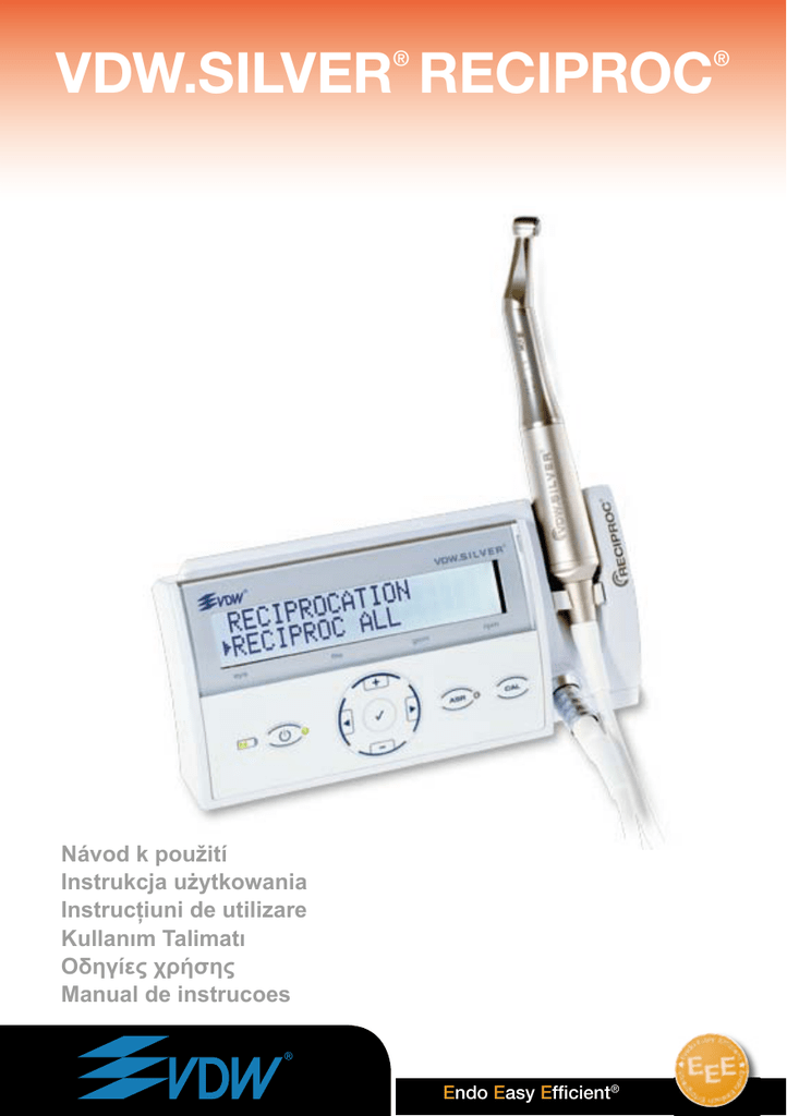 VDW.SILVER RECIPROC ® ® Návod k použití Instrukcja użytkowania Instrucţiuni de utilizare Kullanım Talimatı Oδηγίες χρήσης Manual de instrucoes Endo Easy Efficient® 22 Gratulujemy zakupu endosilnika VDW.SILVER® RECIPROC®. pl W razie wątpliwości lub problemów pojawiających się przy czytaniu tego podręcznika proszę zwrócić się do VDW GmbH. Proszę starannie przechowywać podręcznik. VDV GmbH zastrzega sobie prawo do zmian i danych informacji zawartych w niniejszej instrukcji użytkowania bez uprzedzenia w każdej chwili. Niniejsza instrukcja użytkowania dostępna jest na zapytanie w różnych językach. Podręcznik ten został zestawiony z maksymalną starannością, jednakże mimo naszych wysiłków nie można całkowicie wykluczyć błędów. Propozycje poprawek są bardzo mile widziane. W tej sprawie proszę zwrócić się bezpośrednio do VDW GmbH. VDW GmbH Bayerwaldstr. 15 81737 München Niemcy Telefon +49 89 62734-0 Telefaks +49 89 62734-304 [email protected] www.vdw-dental.com 23 Spis treści 1. 1.1. 1.2. Zastosowane symbole W niniejszej instrukcji użytkowania Na opakowaniu, urządzeniu i elementach urządzenia 24 24 24 2. 25 3. Użytkowanie zgodne z przeznaczeniem Przeciwwskazania 25 4. Wskazówki ostrzegawcze 25 5. Środki ostrożności 27 6. Przeciwreakcje 27 7. 7.1. 7.2. 7.3. 7.3.1. 7.3.2. 7.3.3. 7.4. 7.4.1. 7.4.2. 7.4.3. 7.4.4. 7.4.5. 7.5. 7.5.1. Instrukcja krok po kroku Komponenty standardowe Przygotowanie Uruchomienie Zasilanie energią Mikrosilnik Akumulator Panel sterujący Klawiatura Wyświetlacz Pedał Sygnały akustyczne Biblioteka pilników Praca Włączanie, tryb oczekiwania i wyłączanie Kalibracja ASR: Automatic Stop Reverse (automatyczny stop i zmiana kierunku obrotów) Wybór systemu pilników Tryb rewersyjny Tryb rotacyjny Dr’s Choice (tylko w trybie rotacyjnym) Zmiana momentu obrotowego i prędkości obrotowej (tylko w trybie rotacyjnym) 27 28 28 29 29 29 30 31 31 31 32 32 32 33 33 7.5.2. 7.5.3. 7.6. 7.6.1. 7.6.2. 7.6.3. 7.6.4. 7.7. 7.8. 7.9. 8. Ustawienia fabryczne Konserwacja Czyszczenie, dezynfekcja, sterylizacja Dane techniczne 36 37 37 38 9. Rozwiązywanie problemów 39 10. Gwarancja 40 11. Dr´s Choice 41 Załącznik 126 Electromagnetic Emissions and Immunity (English) 33 34 34 35 35 36 36 Endo Easy Efficient® pl 24 1. Zastosowane symbole 1.1. W niniejszej instrukcji użytkowania pl WSKAZÓWKA OSTRZEGAWCZA W przypadku nieprzestrzegania wskazówek instrukcji, podczas pracy mogą wystąpić zagrożenia dla produktu lub użytkownika/pacjenta. WSKAZÓWKA Dodatkowe informacje, objaśnienia dotyczące pracy i wydajności. 1.2. Na opakowaniu, urządzeniu i elementach urządzenia 0123 Numer seryjny Patrz podręcznik użytkownika Producent Nie utylizować razem z normalnymi odpadami domowymi (zgodnie z dyrektywą 2002/96/EEC z dnia 23.01.2003 r. dot. oddzielnej zbiórki urządzeń elektrycznych i elektronicznych). Data produkcji Przyłącze pedału Urządzenie klasy ochrony II Prąd stały (przyłącze zasilania energią) Część aplikacyjna typu BF Możliwość autoklawowania (przestrzegać temperatury podanej na symbolu) Ostrożnie Symbol GOST, produkt spełnia rosyjskie normy bezpieczeństwa (GOST-R). Oznakowanie CE Numer katalogowy (numer zamówienia dodatkowego) + 50° C Model: TR30RAM120 Ograniczenie temperatury Urządzenie użytkować tylko wraz z przynależną ładowarką. Ograniczenie wilgotności Przechowywać w suchym miejscu! - 20° C 90 % 20 % Przechowywać w suchym miejscu! 25 2. Użytkowanie zgodne z przeznaczeniem TYLKO DO UŻYTKU STOMATOLOGICZNEGO! VDW.SILVER® RECIPROC® jest urządzeniem medycznym, zgodnie z dyrektywą dotyczącą wyrobów medycznych 93/42/EWG, znowelizowaną w dyrektywie 2007/47/WE. Silnik został opracowany z przeznaczeniem do stosowania wyłącznie przez lekarzy stomatologów, w połączeniu z dentystycznymi instrumentami do opracowywania kanałów korzeniowych, wykorzystującymi rotacyjny lub rewersyjny (góra/dół) ruch pilnika. Urządzenie może być stosowane tylko w środowisku szpitalnym, klinikach, gabinetach stomatologicznych, przez wykwalifikowany personel dentystyczny. 3. Przeciwwskazania Urządzenia nie wolno stosować do implantów ani innych zabiegów dentystycznych poza endodoncją. 4. Wskazówki ostrzegawcze Niniejszy rozdział zawiera opis poważnych skutków ubocznych i potencjalnych zagrożeń bezpieczeństwa dla produktu lub użytkownika/ pacjenta. Przed użyciem urządzenia przeczytać poniższe wskazówki ostrzegawcze. WSKAZÓWKI OSTRZEGAWCZE • Urządzeniemożebyćużytkowanetylkow miejscach odpowiednio przystosowanych, przezwyspecjalizowanychizarejestrowanych lekarzystomatologów. • Wprzypadkuwyciekucieczyzurządzenia, prawdopodobnie na skutek nieszczelnego akumulatora, należy niezwłocznie zaprzestać używania urządzenia i odesłać je do autoryzowanegocentrumserwisowegocelemwymianyakumulatora. • Nie narażać urządzenia na działanie bezpośrednichlubpośrednichźródełciepła. Urządzenienależyużytkowaćiprzechowywać wbezpiecznymmiejscu. • Nie dokonywać zmian ani modyfikacji urządzenia;firmaVDWGmbHodrzucaponoszenie jakiejkolwiek odpowiedzialności ztytułudokonywanychzmianimodyfikacji urządzenia. • Urządzenie VDW.SILVER ® RECIPROC ® wymaga stosowania specjalnych środków ostrożnościwodniesieniudokompatybilności elektromagnetycznej (EMV) i musi być instalowaneorazużytkowaneprzyścisłym przestrzeganiuinformacjidotyczącychEMV, zawartych w niniejszym podręczniku użytkownika.Urządzenianiewolnoużywać w szczególności w pobliżu lamp fluorescencyjnych,nadajnikówradiowychipilotówzdalnegosterowania. • Abyuniknąćpotencjalnychzagrożeńspowodowanych przez interferencje elektro- magnetyczne, w pobliżu VDW.SILVER® RECIPROC® nie należy używać innego urządzenia elektromedycznego ani elektrycznego.Emitowaneprzeztourządzenie promieniowanie elektro-magnetyczne jest niższeodzalecanychwartościgranicznych obowiązującychwłaści