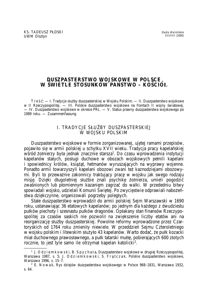 KS. TADEUSZ PŁOSKI UWM Olsztyn Studia Warmińskie XXXVII (2000) DUSZPASTERSTWO WOJSKOWE W POLSCE W ŚWIETLE STOSUNKÓW PAŃSTWO – KOŚCIÓŁ T r e ś ć: — I. Tradycje służby duszpasterskiej w Wojsku Polskim. — II. Duszpasterstwo wojskowe w II Rzeczypospolitej. — III. Polskie duszpasterstwo wojskowe na frontach II wojny światowej. — IV. Duszpasterstwo wojskowe w okresie PRL. — V. Status prawny duszpasterstwa wojskowego po 1989 roku. — Zusammenfassung. I. TRADYCJE SŁUŻBY DUSZPASTERSKIEJ W WOJSKU POLSKIM Duszpasterstwo wojskowe w formie zorganizowanej, uje˛tej ramami przepisów, pojawiło sie˛ w armii polskiej u schyłku XVII wieku. Tradycja pracy kapelańskiej wśród żołnierzy była jednak znacznie starsza1. Do czasu wprowadzenia instytucji kapelanów stałych, posługi duchowe w obozach wojskowych pełnili kapelani i spowiednicy królów, ksia˛ża˛t, hetmanów wyruszaja˛cych na wyprawy wojenne. Ponadto armii towarzyszyli kapelani obozowi zwani też kaznodziejami obozowymi. Byli to przeważnie zakonnicy traktuja˛cy prace˛ w wojsku jak swego rodzaju misje˛. Dzie˛ki długoletniej służbie znali psychike˛ żołnierza, umieli pogodzić zwaśnionych lub płomiennym kazaniem zagrzać do walki. W przededniu bitwy spowiadali wojsko, udzielali Komunii Świe˛tej. Po zwycie˛stwie odprawiali nabożeństwa dzie˛kczynne, organizowali pogrzeby poległych. Stałe duszpasterstwo wprowadził do armii polskiej Sejm Warszawski w 1690 roku, ustanawiaja˛c 36 etatowych kapelanów; po jednym dla każdego z dwudziestu pułków piechoty i szesnastu pułków dragonów. Opłakany stan finansów Rzeczypospolitej za czasów saskich nie pozwolił na zwie˛kszenie liczby etatów ani na reorganizacje˛ służby duszpasterskiej. Powolne reformy wprowadzone przez Czartoryskich od 1764 roku zmieniły niewiele. W przeddzień Sejmu Czteroletniego w wojsku polskim i litewskim służyło 43 kapelanów. Warto dodać, że pułk kozacki miał duchownego prawosławnego, a pułk tatarski mułłe˛, pobieraja˛cych 600 złotych rocznie, to jest tyle samo ile otrzymał kapelan katolicki 2. J. O d z i e m k o w s k i, B. S p y c h a ł a, Duszpasterstwo wojskowe w drugiej Rzeczypospolitej, Warszawa 1987, s. 5; J. O d z i e m k o w s k i, S. F r a˛ t c z a k, Polskie duszpasterstwo wojskowe, Warszawa 1996, s. 15–7. 2 E. N o w a k, Rys dziejów duszpasterstwa wojskowego w Polsce 968–1831, Warszawa 1932, s. 64. 1 580 KS. TADEUSZ PŁOSKI W postanowieniach Sejmu Wielkiego z 30 IV 1791 i 22 V 1792 przewidziano 62 etaty kapelańskie dla pułków piechoty, kawalerii i gwardii. Potrzeby religijne żołnierzy wyznań niekatolickich zaspakajało dwóch duchownych prawosławnych i dwóch mułłów. Duszpasterstwo wojskowe odtworzono w Ksie˛stwie Warszawskim przydzielaja˛c sześćdziesie˛ciotysie˛cznej armii 36 kapelanów. Jeszcze bardziej ustała zreorganizowana i rozbudowana służba duszpasterska w dobie Królestwa Kongresowego. Wydano szczegółowe instrukcje ustalaja˛ce hierarchie˛ i obowia˛zki kapelanów. Duszpasterstwem wojskowym kierował kapelan naczelny. Podlegali mu kapelani dywizyjni i pułkowi. Obok czynności duszpasterskich spadł na kapelanów obowia˛zek wychowania żołnierza poprzez odpowiedni dobór treści kazań, pogadanki etyczne i przykład osobisty. Kapelanom powierzono także prace˛ oświatowa˛; w porozumieniu z dowódcami pułków mogli organizować szkoły dla chca˛cych sie˛ uczyć podoficerów i szeregowców, a także dla dzieci z rodzin wojskowych3. W powstaniu listopadowym wzie˛ło udział 22 kapelanów zawodowych, co przy znacznej rozbudowie armii było liczba˛ daleko niewystarczaja˛ca˛. Kilkudziesie˛ciu ksie˛ży i zakonników zgłosiło sie˛ ochotniczo do szeregów, by pełnić obowia˛zki duszpasterskie na froncie. Literatura pamie˛tnikarska podaje szereg przykładów bohaterstwa duszpasterzy w mundurach. Jednak upadek powstania listopadowego przekreślił nadzieje˛ na rychłe odzyskanie niepodległości i na blisko 90 lat położył kres istnieniu regularnej armii polskiej4. Powstanie styczniowe nie stworzyło warunków do formowania etatowych jednostek wojskowych i zorganizowania stałej służby duszpasterskiej. W rzeczywistości w powstaniu 1863 roku role˛ kapelanów pełniło duchowieństwo cywilne, udzielaja˛c walcza˛cym opieki duszpasterskiej, a cze˛sto i pomocy materialnej. Symbolem kapłana patrioty pozostał w świadomości naste˛pnych pokoleń ksia˛dz Stanisław Brzóska, dowódca partii powstańczej na Podlasiu, mianowany przez Rza˛d Narodowy naczelnym kapelanem powstania5. Ksie˛ża polscy pełnili również służbe˛ kapelańska˛ w siłach zbrojnych państw zaborczych. Najliczniej reprezentowani byli w armii austro-we˛gierskiej. Regulaminy austriackie przewidywały po jednym etacie kapelańskim na każdy pułk, brygade˛, dywizje˛, szpital polowy i forteczny. Kapelan musiał być obecny w każdym znaczniejszym garnizonie. Swoich kapelanów miały także wie˛ksze garnizony cesarstwa niemieckiego natomiast władze carskie utrzymywały w armii około 20 kapelanów katolickich na terenie Rosji oraz 5–9 w Królestwie. Rekrutowali sie˛ oni głównie spośród wychowanków Akademii Duchownej Rzymsko-Katolickiej w Petersburgu. Nominacja zależała od decyzji metropolity mohylewskiego6. 3 J. O d z i e m k o w s k i, jw., Duszpasterstwo wojskowe, jw., s. 7. Zob. E. N o w a k, jw., s. 220–236; S. B a r z y k o w s k i, Historia powstania listopadowego, Poznań 1883/84, t. IV, s. 229; J. Z i ó ł e k, Patriotyczna postawa duchowieństwa w czasie powstania 1830–1831, Roczniki Humanistyczne 28: 1980, z. 2, s. 97. 5 A. G i l l e r, Historia powstania narodu polskiego 1861–1864, Paryż 1867, t. I, s. 252; S. K i e n i e w i c z, Powstanie styczniowe, Warszawa 1983, s. 313–318; J. T o m c z y k, Organizacja cywilno-wojskowa powstania styczniowego w Lubelskiem i na Podlasiu, Rocznik Lubelski 4: 1967, s. 313; S. G ó r a, Partyzantka 