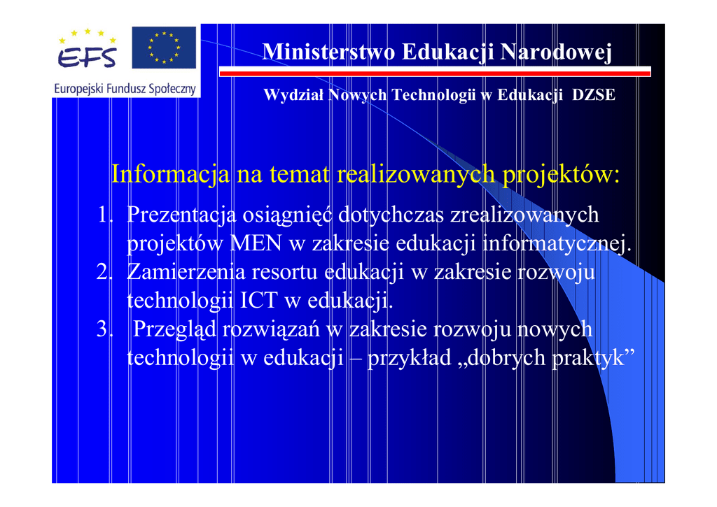 Ministerstwo Edukacji Narodowej Wydzia Nowych Technologii w Edukacji DZSE Informacja na temat realizowanych projektów: 1. Prezentacja osi gni dotychczas zrealizowanych projektów MEN w zakresie edukacji informatycznej. 2. Zamierzenia resortu edukacji w zakresie rozwoju technologii ICT w edukacji. 3. Przegl d rozwi za w zakresie rozwoju nowych technologii w edukacji – przyk ad „dobrych praktyk” Ministerstwo Edukacji Narodowej Wydzia Nowych Technologii w Edukacji DZSE Ad.1. Prezentacja osi gni dotychczas zrealizowanych projektów MEN w zakresie edukacji informatycznej Projekty zrealizowane przez MEN w latach 2004-2008 w ramach dzia ania 2.1. i 2.2. SPO RZL – „Pracownie komputerowe dla szkó ”: 1.Pracownie komputerowe dla szkó 2.Internetowe Centra Informacji Multimedialnej 3.Wyposa enie w sprz t komputerowy centrów kszta cenia ustawicznego i centrów kszta cenia praktycznego 4.Wyposa enie w sprz t komputerowy poradni psychologiczno-pedagogicznych Ministerstwo Edukacji Narodowej Wydzia Nowych Technologii w Edukacji DZSE Ad.1. Prezentacja osi gni dotychczas zrealizowanych projektów MEN w zakresie edukacji informatycznej Wyposa enie szkó i placówek w sprz t komputerowy. Liczba komputerów w szko ach to ponad 575 tys. zestawów komputerowych na ok. 6,2 mln uczniów, z czego w ramach projektów wspó finansowanych z EFS „Pracownie komputerowe dla szkó ” oraz „Internetowe Centra Informacji Multimedialnej” — 334 453 szt. w formie pracowni i centrów multimedialnych na kwot ponad 1,2 mld z . Ministerstwo Edukacji Narodowej Wydzia Nowych Technologii w Edukacji DZSE Ad.1. Prezentacja osi gni dotychczas zrealizowanych projektów MEN w zakresie edukacji informatycznej Wska nik ilo ci uczniów przypadaj cych na 1 komputer w VI 2008 r. wynosi — ok. 11 uczniów na komputer. Stan w 2002 r. – ok. 67 uczniów na komputer. Dost p do Internetu — posiada ponad 90% szkó i placówek. Wszystkie komputery dostarczone w ramach projektów wspó finansowanych przez EFS ma zabezpieczenie przed dost pem do tre ci niepo danych. Ministerstwo Edukacji Narodowej Wydzia Nowych Technologii w Edukacji DZSE Ad.1. Prezentacja osi gni dotychczas zrealizowanych projektów MEN w zakresie edukacji informatycznej Stan wyposa enia w oprogramowanie: systemowe, biurowe i edukacyjne. W ramach projektów wspó finansowanych z EFS szko y i placówki mia y mo liwo wyboru oprogramowanie systemowego i biurowego. •93,5 % szkó wybra o oprogramowanie firmy Microsoft, •3 % oprogramowanie firmy Apple, a •3,5 % szkó wybra o oprogramowanie z grupy OSS (Open Source Software) – Linux (SuSe Novell). Przetarg na oprogramowanie edukacyjne dla szkó z ww. projektów na kwot 147 mln z jest w trakcie realizacji. Ministerstwo Edukacji Narodowej Wydzia Nowych Technologii w Edukacji DZSE Ad.2. Zamierzenia resortu edukacji w zakresie rozwoju technologii ICT w edukacji. Rozwój portalu Scholaris.pl. Zasoby edukacyjne, w tym zaj cia do prowadzenia zaj metod zdalnego nauczania (e-learningu) s gromadzone od 2004 r. na portalu edukacyjnym MEN - Scholaris.pl. Portal jest obecnie rozwijany w zakresie dostosowania tre ci kszta cenia do nowej podstawy programowej, ze szczególnym uwzgl dnieniem potrzeb edukacyjnych na poziomie gimnazjum, w zwi zku z planowanym na rok 2009 wdro eniem projektu KPRM: „Komputer dla ucznia”. Ministerstwo Edukacji Narodowej Wydzia Nowych Technologii w Edukacji DZSE Ad.2. Zamierzenia resortu edukacji w zakresie rozwoju technologii ICT w edukacji. Rada ds. Edukacji Informatycznej i Medialnej przy Ministrze Edukacji Narodowej - opracowanie strategii dzia ania resortu edukacji w zakresie wdra ania nowych technologii Ministerstwo Edukacji Narodowej Wydzia Nowych Technologii w Edukacji DZSE Ad.2. Zamierzenia resortu edukacji w zakresie rozwoju technologii ICT w edukacji. Projektu KPRM „Komputer dla ucznia” 1.Tworzenie kontentu dydaktycznego do zdalnego nauczania ( w tym tworzenie portalu spo eczno ciowego) 2.Szkolenia nauczycieli 3.Doposa enie nauczycieli w nowoczesne rodki dydaktyczne 4.Doposa enie szkó w radiowy dost p do Internetu na terenie szko y. 5.Doposa enie uczniów w mobilny sprz t komputerowy. Ministerstwo Edukacji Narodowej Wydzia Nowych Technologii w Edukacji DZSE Ad.3. Przegl d rozwi za w zakresie rozwoju nowych technologii w edukacji – przyk ad „dobrych praktyk” e-Szko a – Liceum w Otmuchowie Ministerstwo Edukacji Narodowej Wydzia Nowych Technologii w Edukacji DZSE Projekt e- Szko a Wojewódzki O rodek Doskonalenia Informatycznego i Politechnicznego wraz z partnerami realizuje projekt e-Szko a. Partnerami projektu s rodki kszta cenia nauczycieli, wydawnictwa szkolne oraz firmy bran y informatycznej. ówne cele projektu to m.in.: •zaoferowanie nauczycielom dost pu do materia ów dydaktycznych w formie elektronicznej, •generator testów z mo liwo ci przygotowania wersji elektronicznej oraz papierowej, •mo liwo przeprowadzania klasówek oraz testów z automatycznym generowaniem zestawie wyników, •dziennik zaj w formie elektronicznej dla nauczyciela oraz ucznia, •tematyczne forum dyskusyjne dla uczniów oraz nauczycieli, system powiadamiania rodziców o wynikach dzieci (uczniów) poprzez Internet. W pierwszym etapie projektu materia y dydaktyczne obejmowa y materia do nauczania przedmiotów: matematyka, biologia, geografia, fizyka oraz chemia klas 2 gimnazjum oraz obszerny materia nauczania fizyki w szko ach ponadgimnazjalnych. Ministerstwo Edukacji Narodowej Wydzia Nowych Technologii w Edukacji DZSE Projekt Aragonia: • Rozpocz si w 2003 r. we wspó pracy z regionalnym ministerstwem edukacji. •Uruchomiono ten program jako pilota w jednej ze szkó wiejskich w ma ej miejscowo ci Arino w Hiszpanii. •Projekt opiera si na intensywnym u yciu tableta PC w zaj ciach dydaktycznych dzi ki zastosowaniu specjalistycznego oprogramowania edukacyjnego. •Tablety dzia y w rodowisku bezprzewodowego Internetu zainstalowanego w szko ach. •Po tym sukcesie ministerstwo podj o 