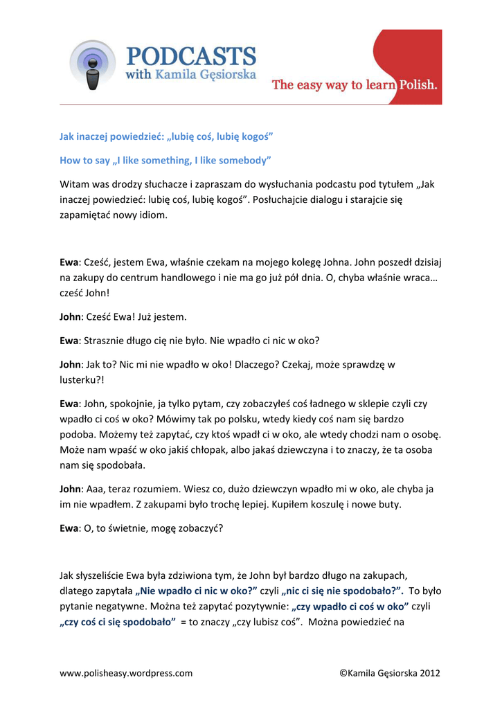 Jak inaczej powiedzieć: „lubię coś, lubię kogoś” How to say „I like something, I like somebody” Witam was drodzy słuchacze i zapraszam do wysłuchania podcastu pod tytułem „Jak inaczej powiedzieć: lubię coś, lubię kogoś”. Posłuchajcie dialogu i starajcie się zapamiętać nowy idiom. Ewa: Cześć, jestem Ewa, właśnie czekam na mojego kolegę Johna. John poszedł dzisiaj na zakupy do centrum handlowego i nie ma go już pół dnia. O, chyba właśnie wraca… cześć John! John: Cześć Ewa! Już jestem. Ewa: Strasznie długo cię nie było. Nie wpadło ci nic w oko? John: Jak to? Nic mi nie wpadło w oko! Dlaczego? Czekaj, może sprawdzę w lusterku?! Ewa: John, spokojnie, ja tylko pytam, czy zobaczyłeś coś ładnego w sklepie czyli czy wpadło ci coś w oko? Mówimy tak po polsku, wtedy kiedy coś nam się bardzo podoba. Możemy też zapytać, czy ktoś wpadł ci w oko, ale wtedy chodzi nam o osobę. Może nam wpaść w oko jakiś chłopak, albo jakaś dziewczyna i to znaczy, że ta osoba nam się spodobała. John: Aaa, teraz rozumiem. Wiesz co, dużo dziewczyn wpadło mi w oko, ale chyba ja im nie wpadłem. Z zakupami było trochę lepiej. Kupiłem koszulę i nowe buty. Ewa: O, to świetnie, mogę zobaczyć? Jak słyszeliście Ewa była zdziwiona tym, że John był bardzo długo na zakupach, dlatego zapytała „Nie wpadło ci nic w oko?” czyli „nic ci się nie spodobało?”. To było pytanie negatywne. Można też zapytać pozytywnie: „czy wpadło ci coś w oko” czyli „czy coś ci się spodobało” = to znaczy „czy lubisz coś”. Można powiedzieć na www.polisheasy.wordpress.com ©Kamila Gęsiorska 2012 przykład „czy wpadła ci w oko ta koszula?” Możemy też zapytać o osobę: „czy wpadł ci ktoś w oko” np. czy wpadła ci w oko Karolina? Kiedy używacie określenia „wpaść komuś w oko”, pamiętajcie że zaimek osobowy jest w celowniku. Dlatego mówimy: wpadł mi w oko, wpadł ci w oko, wpadł mu w oko, wpadł jej w oko, wpadł nam w oko, wpadł wam w oko, wpadł im w oko. To był podcast pod tytułem „Jak inaczej powiedzieć: lubię coś, lubię kogoś”. Jeśli chcecie posłuchać więcej podcastów, zapraszam na stronę www.polisheasy.wordpress.com Zachęcam również do dodawania komentarzy na facebooku. Link znajdziecie na mojej stronie. Cześć! www.polisheasy.wordpress.com ©Kamila Gęsiorska 2012