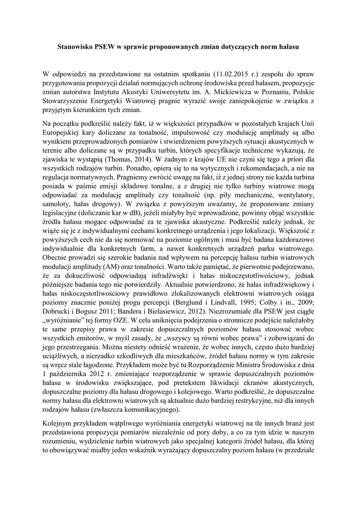 Stanowisko PSEW w sprawie proponowanych zmian dotyczących norm hałasu W odpowiedzi na przedstawione na ostatnim spotkaniu (11.02.2015 r.) zespołu do spraw przygotowania propozycji działań normujących ochronę środowiska przed hałasem, propozycje zmian autorstwa Instytutu Akustyki Uniwersytetu im. A. Mickiewicza w Poznaniu, Polskie Stowarzyszenie Energetyki Wiatrowej pragnie wyrazić swoje zaniepokojenie w związku z przyjętym kierunkiem tych zmian. Na początku podkreślić należy fakt, iż w większości przypadków w pozostałych krajach Unii Europejskiej kary doliczane za tonalność, impulsowość czy modulację amplitudy są albo wynikiem przeprowadzonych pomiarów i stwierdzeniem powyższych sytuacji akustycznych w terenie albo doliczane są w przypadku turbin, których specyfikacje techniczne wykazują, że zjawiska te wystąpią (Thomas, 2014). W żadnym z krajów UE nie czyni się tego a priori dla wszystkich rodzajów turbin. Ponadto, opiera się to na wytycznych i rekomendacjach, a nie na regulacja normatywnych. Pragniemy zwrócić uwagę na fakt, iż z jednej strony nie każda turbina posiada w paśmie emisji składowe tonalne, a z drugiej nie tylko turbiny wiatrowe mogą odpowiadać za modulację amplitudy czy tonalność (np. piły mechaniczne, wentylatory, samoloty, hałas drogowy). W związku z powyższym uważamy, że proponowane zmiany legislacyjne (doliczanie kar w dB), jeżeli miałyby być wprowadzone, powinny objąć wszystkie źródła hałasu mogące odpowiadać za te zjawiska akustyczne. Podkreślić należy jednak, że wiąże się je z indywidualnymi cechami konkretnego urządzenia i jego lokalizacji. Większość z powyższych cech nie da się normować na poziomie ogólnym i musi być badana każdorazowo indywidualnie dla konkretnych farm, a nawet konkretnych urządzeń parku wiatrowego. Obecnie prowadzi się szerokie badania nad wpływem na percepcję hałasu turbin wiatrowych modulacji amplitudy (AM) oraz tonalności. Warto także pamiętać, że pierwotnie podejrzewano, że za dokuczliwość odpowiadają infradźwięki i hałas niskoczęstotliwościowy, jednak późniejsze badania tego nie potwierdziły. Aktualnie potwierdzono, że hałas infradźwiękowy i hałas niskoczęstotliwościowy prawidłowo zlokalizowanych elektrowni wiatrowych osiąga poziomy znacznie poniżej progu percepcji (Berglund i Lindvall, 1995; Colby i in., 2009; Dobrucki i Bogusz 2011; Bandera i Bielasiewicz, 2012). Niezrozumiałe dla PSEW jest ciągłe „wyróżnianie” tej formy OZE. W celu uniknięcia podejrzenia o stronnicze podejście należałoby te same przepisy prawa w zakresie dopuszczalnych poziomów hałasu stosować wobec wszystkich emitorów, w myśl zasady, że „wszyscy są równi wobec prawa” i zobowiązani do jego przestrzegania. Można niestety odnieść wrażenie, że wobec innych, często dużo bardziej uciążliwych, a nierzadko szkodliwych dla mieszkańców, źródeł hałasu normy w tym zakresie są wręcz stale łagodzone. Przykładem może być tu Rozporządzenie Ministra Środowiska z dnia 1 października 2012 r. zmieniające rozporządzenie w sprawie dopuszczalnych poziomów hałasu w środowisku zwiększające, pod pretekstem likwidacji ekranów akustycznych, dopuszczalne poziomy dla hałasu drogowego i kolejowego. Warto podkreślić, że dopuszczalne normy hałasu dla elektrowni wiatrowych są aktualnie dużo bardziej restrykcyjne, niż dla innych rodzajów hałasu (zwłaszcza komunikacyjnego). Kolejnym przykładem wątpliwego wyróżniania energetyki wiatrowej na tle innych branż jest przedstawiona propozycja pomiarów niezależnie od pory doby, a co za tym idzie w naszym rozumieniu, wydzielenie turbin wiatrowych jako specjalnej kategorii źródeł hałasu, dla której to obowiązywać miałby jeden wskaźnik wyrażający dopuszczalny poziom hałasu (w przedziale czasu odniesienia równym 8 najmniej korzystnym godzinom dnia kolejno po sobie następującym lub 1 najmniej korzystnej godzinie nocy). Większość krajów różnicuje dopuszczalne normy hałasu na porę dzienną i nocną, a w niektórych (Bułgaria lub belgijska Flandria) wyróżniono jeszcze dodatkową – porę wieczorną. W związku z faktem, iż normy te w Europie mają charakter emisyjny, uwzględniają więc niekiedy różne źródła hałasu, ale przede wszystkim definiują inne normy dla dnia i nocy oraz inne dla różnego wykorzystania terenu i różnych rodzajów zabudowy (Raport National Association Network, 2012). Kolejną zaproponowaną zmianą jest wprowadzenie dla wszystkich rodzajów terenów zabudowy mieszkaniowej, jednakowej wartości dopuszczalnej. Dotychczasowe różnice między dopuszczalnymi poziomami hałasu między zabudową jednorodzinną, zagrodowa i wielorodzinną ustalone zostały z uwzględnieniem charakteru użytkowania i rodzaj prowadzonej działalności, bytowania oraz hałasu generowanego w otoczeniu tych zabudowań. Nie ma podstaw do zmiany dopuszczalnych poziomów. Wprowadzenie takiego ujednolicenia może z dużym prawdopodobieństwem spowodować, że w obrębie niektórych zabudowań zagrodowych już samo tło będzie powodowało przekroczenie poziomów dopuszczalnych. Ponadto w polskim prawodawstwie, wprowadzony podział charakteru zabudowy wyróżnia tereny mieszkaniowo – usługowe, na których bardzo często lokalizowana jest zabudowa mieszkaniowa z nieuciążliwymi drobnymi usługami. Wprowadzenie dalszego obniżenia poziomu dopuszczalnego dla tych terenów ograniczy możliwości prowadzenia wielu nieuciążliwych usług, które są często źródłem utrzymania mieszkańców tych terenów. PSEW reprezentując branżę energetyki wiatrowej musi postawić pytanie, kto miałby płacić za te proponowane 12-miesięczne pomiary emitowanego hałasu na etapie eksploatacji farm wiatrowych? Prowadzenie pomiarów ciągłych wiąże się z rejestracją wszelkich zakłóceń pochodzących od innych źródeł hałasu i następnie koniecznością podj