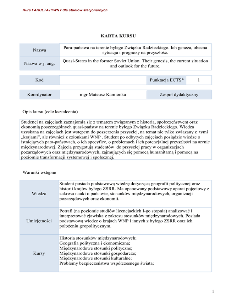 Kurs FAKULTATYWNY dla studiów stacjonarnych KARTA KURSU Nazwa Para-państwa na terenie byłego Związku Radzieckiego. Ich geneza, obecna sytuacja i prognozy na przyszłość. Nazwa w j. ang. Quasi-States in the former Soviet Union. Their genesis, the current situation and outlook for the future. Punktacja ECTS* Kod Koordynator mgr Mateusz Kamionka 1 Zespół dydaktyczny Opis kursu (cele kształcenia) Studenci na zajęciach zaznajomią się z tematem związanym z historią, społeczeństwem oraz ekonomią poszczególnych quasi-państw na terenie byłego Związku Radzieckiego. Wiedza uzyskana na zajęciach jest wstępem do poszerzenia przyszłej, na temat nie tylko związany z tymi „krajami”, ale również z członkami WNP . Student po odbytych zajęciach posiądzie wiedze o istniejących para-państwach, o ich specyfice, o problemach i ich potencjalnej przyszłości na arenie międzynarodowej. Zajęcia przygotują studentów do przyszłej pracy w organizacjach pozarządowych oraz międzynarodowych, zajmujących się pomocą humanitarną i pomocą na poziomie transformacji systemowej i społecznej. Warunki wstępne Wiedza Umiejętności Kursy Student posiada podstawową wiedzę dotyczącą geografii politycznej oraz historii krajów byłego ZSRR. Ma opanowany podstawowy aparat pojęciowy z zakresu nauki o państwie, stosunków międzynarodowych, organizacji pozarządowych oraz ekonomii. Potrafi (na poziomie studiów licencjackich I-go stopnia) analizować i interpretować zjawiska z zakresu stosunków międzynarodowych. Posiada podstawową wiedzę o krajach WNP i innych z byłego ZSRR oraz ich położeniu geopolitycznym. Historia stosunków międzynarodowych; Geografia polityczna i ekonomiczna; Międzynarodowe stosunki polityczne; Międzynarodowe stosunki gospodarcze; Międzynarodowe stosunki kulturalne; Problemy bezpieczeństwa współczesnego świata; 1 Kurs FAKULTATYWNY dla studiów stacjonarnych EFEKTY KSZTAŁCENIA WIEDZA Efekt kształcenia dla kursu Student: W1 zna najnowszą historię omawianych krajów; W2 zna uwarunkowania społeczne, polityczne i ekonomiczne omawianych krajów; W3 zna najważniejsze problemy i wyzwania stające przed regionem; W4 zna mechanizmy i uwarunkowania toczącej się w regionie rywalizacji politycznej, ekonomicznej i militarnej; W5 zna organizacje międzynarodowe oraz podmioty niepaństwowe, działające w regionie; W6 zna potencjał gospodarczy, i militarny demograficzny omawianych państw regionu; W7 zna źródła, w tym internetowe, w których może aktualizować swoją wiedzę dotyczącą przedmiotu kursu, po jego zakończeniu; UMIEJĘTNOŚCI Efekt kształcenia dla kursu Student: U1 potrafi wyjaśnić przyczyny i skutki zróżnicowania kulturowego, ekonomicznego, społecznego i militarnego krajów regionu; U2 potrafi wskazać scenariusze rozwoju sytuacji w punktach zapalnych regionu; U3 potrafi wyjaśnić przyczyny i wskazać potencjalne skutki toczącej się w regionie rywalizacji; U4 potrafi wskazać przyczyny i skutki sukcesu gospodarczego części omawianych krajów, jak i zacofania innych; U5 potrafi omówić, w sposób przyczynowo – skutkowy, zagadnienia poruszane na kursie; U6 na podstawie posiadanej i Efekt kształcenia dla kierunku W11 W11, W13 W11, W13 W11, W12, W13 W4, W6 W12, W13 W15, W16 Efekt kształcenia dla kierunku U1 U3, U9 U1, U4 U1, U3 U1, U3, U4 U2, U9 2 Kurs FAKULTATYWNY dla studiów stacjonarnych uzupełnianej wiedzy potrafi (w stopniu podstawowym)prognozować rozwój wydarzeń w regionie; KOMPETENCJE SPOŁECZNE Efekt kształcenia dla kursu Student: K1 student potrafi w zrozumiały sposób przekazywać nabytą na kursie wiedzę; K2 potrafi samodzielnie uzupełniać nabytą w trakcie kursu wiedzę, korzystając zarówno z literatury, jak i źródeł internetowych; K3 zna, w stopniu podstawowym, oraz szanuje kulturę poszczególnych krajów regionu; ORGANIZACJA FORMA WYKŁAD ZAJĘĆ (W) 15 Efekt kształcenia dla kierunku K5 K1 K9 ZAJĘCIA W GRUPACH A K L S P 10 EL W1 W2 W3 W4 W5 W6 W7 U1 U2 U3 U4 U5 U6 K1 K2 K3 x x x x x x x x x x x x x x x x Inne Egzamin pisemny Egzamin ustny Praca pisemna Referat Udział w dyskusji Projekt grupowy Projekt indywidualn Praca laboratoryjn Zajęcia terenowe Ćwiczenia w szkole Gry dydaktyczne E-learning FORMY SPRAWDZANIA EFEKTÓW KSZTAŁCENIA x x x x x x x x x x x x x x x x 3 Kurs FAKULTATYWNY dla studiów stacjonarnych Organizacja Forma zajęć Liczba godzin Ćwiczenia w grupach Wykład (W) 15 A K L S P E 10 Opis metod prowadzenia zajęć Wykład informacyjny z użyciem prezentacji programu PowerPoint oraz filmów dokumentalnych dotyczących omawianej tematyki. Ponadto prowadzący do większości zajęć przygotowuje autorskie materiały, zebrane przez niego w czasie wizyt w niektórych quasi-państwach, oraz w czasie jego członkostwa w misjach obserwacyjnych w ramach OBWE oraz w innych projektach z zakresu praw człowieka etc. na terenie byłego ZSRR. Obecność na zajęciach studentów oraz/lub zaliczenie ustne/pisemne. Kryteria oceny Uwagi Przepisanie oceny z kursu o tej samej nazwie tylko pod warunkiem ekwiwalentnej liczby godzin i punktów ECTS oraz oceny minimum dobrej. 4 Kurs FAKULTATYWNY dla studiów stacjonarnych Treści merytoryczne (wykaz tematów) 1. Para-państwa w ujęciu teoretycznym. (2 x 45 min.) 2. Naddniestrze – gdzie przepustką przez granicę jest znajomość lokalnego koniaku (2 x 45 min.) 3. Górski Karabach między Erywaniem, a Baku (2 x 45 min.) 4. Osetia Południowa czy może Hussar Iryston (2 x 45 min.) 5. Abchazja- uznawana tylko przez cztery państwa świata (2 x 45 min.) 6. Krym- kość niezgody między Rosjanami, Ukraińcami i Tatarami (2 x 45 min.) 7. Czeczenia- w rękach Ramzana Kadyrowa (2 x 45 min.) 8. Gagauzja- stolica prawosławnych ludów Tureckich (2 x 45 min.) 9. Luhanska i Doniecka Republika Ludowa- w cieniu wojny (2 x 45 min.) 10. Republiki – 22, kraje – 9, obwody – 46, miasta wydzielone – 3, obwody autonomiczne – 1, okręgi autonomiczne 