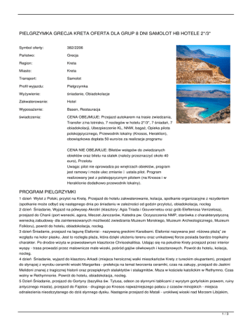 PIELGRZYMKA GRECJA KRETA OFERTA DLA GRUP 8 DNI SAMOLOT HB HOTELE 2*/3* Symbol oferty: 382/2206 Państwo: Grecja Region: Kreta Miasto: Kreta Transport: Samolot Profil wyjazdu: Pielgrzymka Wyżywienie: śniadanie, Obiadokolacje Zakwaterowanie: Hotel Wyposażenie: Basen, Restauracja świadczenia: CENA OBEJMUJE: Przejazd autokarem na trasie zwiedzania, Transfer z/na lotnisko, 7 noclegów w hotelu 2*/3*, 7 śniadań, 7 obiadokolacji, Ubezpieczenie KL, NNW, bagaż, Opieka pilota polskojęzycznego, Przewodnik lokalny (Knosos, Heraklion), obowiązkowa dopłata 50 euro/os za realizacje programu CENA NIE OBEJMUJE: Biletów wstępów do zwiedzanych obiektów oraz biletu na statek (należy przeznaczyć około 40 euro), Przelotu Uwaga: pilot nie oprowadza po wnętrzach obiektów, program jest ramowy i może ulec zmianie ustala pilot. Program realizowany jest z polskojęzycznym pilotem (na Knosos i w Heraklionie dodatkowo przewodnik lokalny). PROGRAM PIELGRZYMKI 1 dzień Wylot z Polski, przylot na Kretę. Przejazd do hotelu zakwaterowanie, kolacja, spotkanie organizacyjne z rezydentem (spotkanie może odbyć się następnego dnia po śniadaniu w zależności od godzin przylotu), obiadokolacja, nocleg 2 dzień Śniadanie, Wyjazd na półwysep Akrotiri (klasztory: Agia Triada i Gouvernetou oraz grób Elefteriosa Venizelosa), przejazd do Chanii (port wenecki, agora, Meczet Janczarów, Katedra pw. Oczyszczenia NMP, starówka z charakterystyczną wenecką zabudową- dla zainteresowanych możliwość zwiedzania Muzeum Morskiego, Muzeum Archeologicznego, Muzeum Folkloru), powrót do hotelu, obiadokolacja, nocleg. 3 dzień Śniadanie, przejazd na lagunę Elafonisi - nazywaną greckimi Karaibami. Elafonisi nazywana jest -różowa plażą” ze względu na kolor piasku. Jest to rozległa plaża, która dzięki ułożeniu terenu oraz unikatowej florze posiada bardzo tropikalny charakter. Po drodze wizyta w prawosławnym klasztorze Chrisoskalitisa. Udając się na południe Krety przejazd przez interior wyspy - trasa prowadzi przez malownicze małe wioski, pośród gajów oliwkowych i kasztanowych. Powrót do hotelu, kolacja, nocleg. 4 dzień Śniadanie, wyjazd do klasztoru Arkadi (miejsca heroicznej walki mieszkańców Krety z tureckim okupantem), przejazd do słynącej z wyrobu ceramiki wioski Margarites - prelekcja na temat tworzenia ceramiki, czas na zakupy, przejazd do Jaskini Melidoni znanej z tragicznej historii oraz przepięknych stalaktytów i stalagmitów. Msza w kościele katolickim w Rethymno. Czas wolny w Rethymnonie. Powrót do hotelu, obiadokolacja, nocleg. 5 Dzień Śniadanie, przejazd do Gortyny (bazylika św. Tytusa, odeon ze słynnymi tablicami z wyrytym gortyńskim prawem, ruiny antycznego miasta), przejazd do Fajstos - drugiego po Knosos najważniejszego pałacu z czasów minojskich - miejsca odnalezienia nieodczytanego do dziś słynnego dysku. Następnie przejazd do Matali - urokliwej wioski nad Morzem Libijskim, 1/3 gdzie w latach 60 i 70-tych zjeżdżali hipisi z całego świata. W Matali czas na plażowanie. Powrót do hotelu, obiadokolacja, nocleg. 6 dzień Śniadanie, przejazd do Heraklionu - zwiedzanie miasta: Loża Wenecka, pierwszy chrześcijański kościół na wyspie św. Tytusa, fontanna Morosiniego, weneckie mury obronne, Muzeum Archeologiczne. Przejazd do Knosos - starożytnego pałacu z czasów kultury minojskiej, wizyta w winiarni w Pezie z degustacją, powrót do hotelu, obiado kolacja, nocleg. 7 dzień Śniadanie, wyjazd do Agios Nikolaos - uroczego miasta słynącego z bezdennego jeziora oraz rejs na wyspę Spinalonga - z zabudowaniami weneckimi, które w XX w posłużyły jako szpital dla trędowatych, powrót do hotelu, obiadokolacja, nocleg. 8 dzień śniadanie, transfer na lotnisko, przylot do Polski. Atrakcje: ELAFONISI - CHANIA - AKROTIRI - JASKINIA MELIDONI - GORTYNA - MATALA - HERAKLION - KNOSSOS - AGIOS NIKOLAOS - RETHYMNO - SPINALONGA TERMINY: od: 2017-05-27 do: 2017-06-03 (8 dni), miejsca: book_K cena od: 1100 PLN od: 2017-09-16 do: 2017-09-23 (8 dni), miejsca: book_K cena od: 1100 PLN CENNIK: Długość pobytu: 8 dni Grupa cenowa: A Ubezpieczenie (obligatoryjne) (*) Ubezpieczenie KL i NNW i bagaż (-) Pobyt w obiekcie (do wyboru) Pokój 3 os standardowo dla osób: 3 minimalnie: 2 (*) Pokój 2 os standardowo dla osób: 2 minimalnie: 1 Rodzaj osoby (do wyboru) (*) uczestnik ubezpieczenie od chorób przewlekłych 70 Ubezpieczenie od kosztów rezygnacji 3% Inne (obligatoryjne) (*) zwiedzanie według programu (-) (*) przewodnik (-) (*) Opieka rezydenta na miejscu (-) (*) transfer z/na lotnisko (-) (*) Wyżywienie HB- śniadania i obiadokolacje Inne (obligatoryjne) (*) 7 noclegów (-) 1100 Ubezpieczenie (opcjonalne) Wyżywienie (opcjonalne) (-) (-) (-) Waluta: PLN Aktualne ceny z systemu S.A.R.T. (-) - cena usługi, podatku kalkulowana przy osobie lub gratis 2/3 (*) - kwota wliczona w cenę standardową 3/3