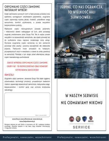 Oryginalne części zamienne naturalny wybór! Dzięki zachowaniu surowych norm w fazie procesu produkcji oraz spełnieniu wymaganych certyfikatami parametrów, oryginalne części zapewniają wysoką jakość, trwałość, prawidłowe osiągi samochodu, komfort użytkowania, a przede wszystkim bezpieczeństwo podróży. jedyne, co nas ogranicza, to wielkość hali serwisowej... Większość części nieoryginalnych posiada parametry i właściwości daleko odbiegające od tych, jakie posiadają oryginały produkowane przez Grupę Fiat. Ma to wpływ przede wszystkim na niezawodność samochodu, ale często prowadzi też do wydłużenia czasu naprawy zwiększając cenę usługi. Wymiana oryginalnej części zamiennej na tani zamiennik powoduje tylko złudną i pozorną oszczędność dla właściciela pojazdu. Faktycznie może prowadzić do kolejnych, przyspieszonych wizyt w warsztacie, a nawet do utraty gwarancji na samochód. Pamiętaj o tym stojąc przed alternatywą zakupu części niewiadomego pochodzenia! ZAWSZE WYBIERAJ ORYGINALNE CZĘŚCI ZAMIENNE GRUPY FIAT – TO BEZPIECZEŃSTWO ORAZ KOMFORT UŻYTKOWANIA SAMOCHODU! Pamiętaj! Oryginalne części zamienne i akcesoria Grupy Fiat dzięki ciągłemu udoskonalaniu technologii produkcji, prowadzonym badaniom i testom, zapewniają niezawodność samochodu, maksymalne osiągi, bezpieczeństwo i komfort jazdy oraz ochronę środowiska naturalnego. w naszym serwisie nie odmawiamy nikomu Miejsce na pieczątkę dealera. www.fiat.pl, www.alfaromeo.pl, www.lancia.pl, www.fiatprofessional.pl, Niniejsza reklama nie jest ofertą w rozumieniu art. 66 i następne kodeksu cywilnego. Wszelkie zawarte w niej dane mają charakter informacyjny i mogą ulec zmianie. Profesjonalni, nowocześni, wszechstronni Profesjonalni, nowocześni, wszechstronni Autoryzowane Serwisy Fiat, Alfa romeo, Lancia, fiat professional ZAPEWNIAJĄ: BEZPIECZEŃSTWO Korzystając z usług autoryzowanego serwisu w czasie podróży samochodem będziesz zawsze czuł się bezpiecznie. PROFESJONALIZM Wykwalifikowani pracownicy serwisu Grupy Fiat wykorzystują najnowocześniejsze urządzenia diagnostyczne i naprawcze, gwarantując najwyższy poziom fachowości. SZYBKOŚĆ Kontrola lub naprawa samochodu w krótkim czasie. W razie potrzeby możemy udostępnić samochód zastępczy. 2/2 PEWNOŚĆ Tylko autoryzowany serwis Grupy Fiat daje pewność, że do naprawy zostaną wykorzystane najwyższej jakości oryginalne części zamienne. OSZCZĘDNOŚĆ Raz, a dobrze! Autoryzowany serwis Grupy Fiat zapewnia wykonanie profesjonalnej usługi za naprawdę rozsądną cenę. GWARANCJA Udzielamy gwarancji na przeprowadzone naprawy i wykorzystane do nich części zamienne. 2/27/12 3:3 Profesjonalni, nowocześni, wszechstronni Profesjonalni, nowocześni, wszechstronni