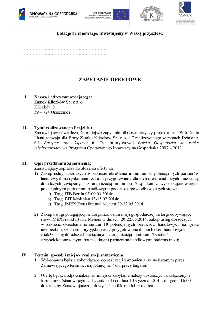 Dotacje na innowacje. Inwestujemy w Waszą przyszłość. …………………………………………………... …………………………………………………... …………………………………………………... …………………………………………………... ZAPYTANIE OFERTOWE I. Nazwa i adres zamawiającego: Zamek Kliczków Sp. z o. o. Kliczków 8 59 – 724 Osiecznica II. Tytuł realizowanego Projektu: Zamawiający oświadcza, że niniejsze zapytanie ofertowe dotyczy projektu pn. „Wdrożenie Planu rozwoju dla firmy Zamku Kliczków Sp. z o. o.” realizowanego w ramach Działania 6.1 Paszport do eksportu 6. Osi priorytetowej Polska Gospodarka na rynku międzynarodowym Programu Operacyjnego Innowacyjna Gospodarka 2007 – 2013. III. Opis przedmiotu zamówienia: Zamawiający zaprasza do złożenia oferty na: 1) Zakup usług doradczych w zakresie określenia minimum 10 potencjalnych partnerów handlowych na rynku niemieckim i przygotowania dla nich ofert handlowych oraz usług doradczych związanych z organizacją minimum 5 spotkań z wyselekcjonowanymi potencjalnymi partnerami handlowymi podczas targów odbywających się w: a) Targi ITB Berlin 05-09.03.2014r. b) Targi BIT Mediolan 13-15.02.2014r. c) Targi IMEX Frankfurt nad Menem 20-22.05.2014 2) Zakup usługi polegającej na zorganizowaniu misji gospodarczej na targi odbywające się w IMEXFrankfurt nad Menem w dniach 20-22.05.2014, zakup usług doradczych w zakresie określenia minimum 10 potencjalnych partnerów handlowych na rynku niemieckim, włoskim i brytyjskim oraz przygotowania dla nich ofert handlowych, a także usług doradczych związanych z organizacją minimum 5 spotkań z wyselekcjonowanymi potencjalnymi partnerami handlowymi podczas misji; IV. Termin, sposób i miejsce realizacji zamówienia: 1. Wykonawca będzie zobowiązany do realizacji zamówienia we wskazanym przez Zamawiającego terminie, najpóźniej na 7 dni przez targami. 2. Ofertę będącą odpowiedzią na niniejsze zapytanie należy dostarczyć na załączonym formularzu (stanowiącym załącznik nr 1) do dnia 10 stycznia 2014r., do godz. 16:00 do siedziby Zamawiającego lub wysłać na faksem lub e-mailem. V. VI. VII. Rodzaje oraz opis kryteriów, którymi będzie się kierował Zamawiający i ich punktacja: Zamawiający ustala, ze jedynym kryterium, którym będzie się kierował jest cena realizacji zamówienia. Oferta o najniższej cenie spełniająca warunki zamówienia zostanie wybrana, chyba że postępowanie zostanie unieważnione. Osoba uprawniona do kontaktów z Wykonawcami: Osobą uprawnioną do kontaktów z Wykonawcami jest Paulina Kapica tel. (75) 734-07-00, fax. (75) 734-07-03, e-mail: [email protected] Klauzule dodatkowe: Zamawiający zastrzega sobie prawo do unieważnienia postępowania z ważnych przyczyn o których będzie zobowiązany powiadomić oferentów. ZAŁĄCZNIKI Załącznik nr 1 – Formularz ofertowy. Zał. Nr 1 FORMULARZ OFERTOWY Nazwa Wykonawcy (nazwa firmy i adres) …………………………………………… …………………………………………… …………………………………………… …………………………………………… Zamek Kliczków Sp. z o. o. Kliczków 8 59-724 Osiecznica Odpowiadając na zapytanie ofertowe na: 1) złożenia oferty na zakup usług doradczych w zakresie określenia minimum 10 potencjalnych partnerów handlowych na rynku niemieckim i przygotowania dla nich ofert handlowych oraz usług doradczych związanych z organizacją minimum 5 spotkań z wyselekcjonowanymi potencjalnymi partnerami handlowymi podczas targów odbywających się w: a) Targi ITB Berlin 05-09.03.2014r. b) Targi BIT Mediolan 13-15.02.2014r. c) Targi IMEX Frankfurt nad Menem 20-22.05 2014 2) Zakup usługi polegającej na zorganizowaniu misji gospodarczej na targachIMEX Frankfurt nad Menem odbywających się w dniach 20-22.05.2014, zakup usług doradczych w zakresie określenia minimum 10 potencjalnych partnerów handlowych na rynku niemieckim, włoskim i brytyjskim oraz przygotowania dla nich ofert handlowych, a także usług doradczych związanych z organizacją minimum 5 spotkań z wyselekcjonowanymi potencjalnymi partnerami handlowymi podczas misji realizowanych w ramach projektu pn. „Wdrożenie Planu rozwoju eksportu dla Zamku Kliczków Sp. z o. o.” realizowanego w ramach Działania 6.1 Paszport do eksportu 6. Osi priorytetowej Polska Gospodarka na rynku międzynarodowym Programu Operacyjnego Innowacyjna Gospodarka 2007-2013, oferuję wykonanie przedmiotu zamówienia, zgodnie z wymogami opisu przedmiotu zamówienia, za kwotę w wysokości: 1a) Targi ITB Berlin 05-09.03.2014r. Cena brutto: 7 835,10 zł Cena brutto słownie: siedem tysięcy osiemset trzydzieści pięć zł 10/100 Cena netto: 6 370,00 zł Cena netto słownie: sześć tysięcy trzysta siedemdziesiąt złotych 00/100 1b) Targi BIT Mediolan 13-15.02.2014r. Cena brutto: 7 835,10 zł Cena brutto słownie: siedem tysięcy osiemset trzydzieści pięć zł 10/100 Cena netto: 6 370,00 zł Cena netto słownie: sześć tysięcy trzysta siedemdziesiąt złotych 00/100 1c) Targi IMEX Frankfurt nad Menem 20-22.05. 2014 Cena brutto: 7 835,10 zł Cena brutto słownie: siedem tysięcy osiemset trzydzieści pięć zł 10/100 Cena netto: 6 370,00 zł Cena netto słownie: sześć tysięcy trzysta siedemdziesiąt złotych 00/100 2) IMEX Frankfurt nad Menem 20-22.05. 2014 Cena brutto: 1 230,00 zł Cena brutto słownie: jeden tysiąc dwieście trzydzieści zł 00/100 Cena netto: 1 000,00 zł Cena netto słownie: jeden tysiąc złotych 00/100 Oświadczam, że zawarte w zapytaniu ofertowym warunki akceptuję i zobowiązuję się, w przypadku przyjęcia mojej oferty, do realizacji zamówienia na w/w warunkach i w terminie wyznaczonym przez Zamawiającego. Oświadczam, że w przypadku przyjęcia mojej oferty dostarczę Zamawiającemu kserokopię aktualnego wpisu do rejestru, uprawniającego mnie do występ
