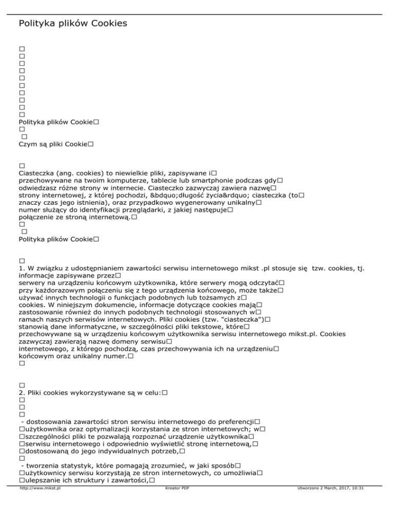 Polityka plików Cookies Polityka plików Cookie Czym są pliki Cookie Ciasteczka (ang. cookies) to niewielkie pliki, zapisywane i przechowywane na twoim komputerze, tablecie lub smartphonie podczas gdy odwiedzasz różne strony w internecie. Ciasteczko zazwyczaj zawiera nazwę strony internetowej, z której pochodzi, „długość życia” ciasteczka (to znaczy czas jego istnienia), oraz przypadkowo wygenerowany unikalny numer służący do identyfikacji przeglądarki, z jakiej następuje połączenie ze stroną internetową. Polityka plików Cookie 1. W związku z udostępnianiem zawartości serwisu internetowego mikst .pl stosuje się tzw. cookies, tj. informacje zapisywane przez serwery na urządzeniu końcowym użytkownika, które serwery mogą odczytać przy każdorazowym połączeniu się z tego urządzenia końcowego, może także używać innych technologii o funkcjach podobnych lub tożsamych z cookies. W niniejszym dokumencie, informacje dotyczące cookies mają zastosowanie również do innych podobnych technologii stosowanych w ramach naszych serwisów internetowych. Pliki cookies (tzw. "ciasteczka") stanowią dane informatyczne, w szczególności pliki tekstowe, które przechowywane są w urządzeniu końcowym użytkownika serwisu internetowego mikst.pl. Cookies zazwyczaj zawierają nazwę domeny serwisu internetowego, z którego pochodzą, czas przechowywania ich na urządzeniu końcowym oraz unikalny numer. 2. Pliki cookies wykorzystywane są w celu: - dostosowania zawartości stron serwisu internetowego do preferencji użytkownika oraz optymalizacji korzystania ze stron internetowych; w szczególności pliki te pozwalają rozpoznać urządzenie użytkownika serwisu internetowego i odpowiednio wyświetlić stronę internetową, dostosowaną do jego indywidualnych potrzeb, - tworzenia statystyk, które pomagają zrozumieć, w jaki sposób użytkownicy serwisu korzystają ze stron internetowych, co umożliwia ulepszanie ich struktury i zawartości, http://www.mikst.pl Kreator PDF Utworzono 2 March, 2017, 10:31 3. W ramach serwisu internetowego mikst.pl możemy stosować następujące rodzaje plików cookies: - pliki cookies służące do zapewnienia bezpieczeństwa, np. wykorzystywane do wykrywania nadużyć w zakresie uwierzytelniania w ramach serwisu, - pliki cookies, umożliwiające zbieranie informacji o sposobie korzystania ze stron internetowych serwisu, - "funkcjonalne" pliki cookies, umożliwiające "zapamiętanie" wybranych przez użytkownika ustawień i personalizację interfejsu użytkownika, np. w zakresie wybranego języka lub regionu, z którego pochodzi użytkownik, rozmiaru czcionki, wyglądu strony internetowej itp., 4. W wielu przypadkach oprogramowanie służące do przeglądania stron internetowych (przeglądarka internetowa) domyślnie dopuszcza przechowywanie plików cookies w urządzeniu końcowym użytkownika. Użytkownicy serwisu mogą dokonać w każdym czasie zmiany ustawień dotyczących plików cookies. Ustawienia te mogą zostać zmienione w szczególności w taki sposób, aby blokować automatyczną obsługę plików cookies w ustawieniach przeglądarki internetowej bądź informować o ich każdorazowym zamieszczeniu w urządzeniu użytkownika serwisu internetowego. Szczegółowe informacje o możliwości i sposobach obsługi plików cookies dostępne są w ustawieniach oprogramowania (przeglądarki internetowej). Niedokonanie zmiany ustawień w zakresie cookies oznacza, że będą one zamieszczone w urządzeniu końcowym użytkownika, a tym samym będziemy przechowywać informacje w urządzeniu końcowym użytkownika i uzyskiwać dostęp do tych informacji. Jak wyłączyć pliki cookie w przeglądarce ? - Przeglądarka Opera - Przeglądarka Firefox - Przeglądarka Chrome http://www.mikst.pl Kreator PDF Utworzono 2 March, 2017, 10:31 - Przeglądarka Internet Explorer - Przeglądarka Safari http://www.mikst.pl Kreator PDF Utworzono 2 March, 2017, 10:31
