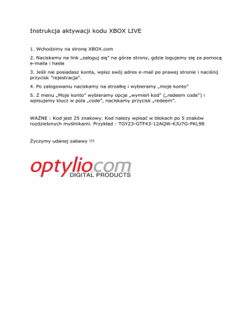 Instrukcja aktywacji kodu XBOX LIVE 1. Wchodzimy na stronę XBOX.com 2. Naciskamy na link „zaloguj się” na górze strony, gdzie logujemy się za pomocą e-maila i hasła 3. Jeśli nie posiadasz konta, wpisz swój adres e-mail po prawej stronie i naciśnij przycisk ”rejestracja”. 4. Po zalogowaniu naciskamy na strzałkę i wybieramy „moje konto” 5. Z menu „Moje konto” wybieramy opcje „wymień kod" („redeem code”) i wpisujemy klucz w pola „code”, naciskamy przycisk „redeem”. WAŻNE : Kod jest 25 znakowy. Kod należy wpisać w blokach po 5 znaków rozdzielonych myślnikami. Przykład : TGY23-GTF43-12AQW-KJU7G-PKL98 Życzymy udanej zabawy !!!