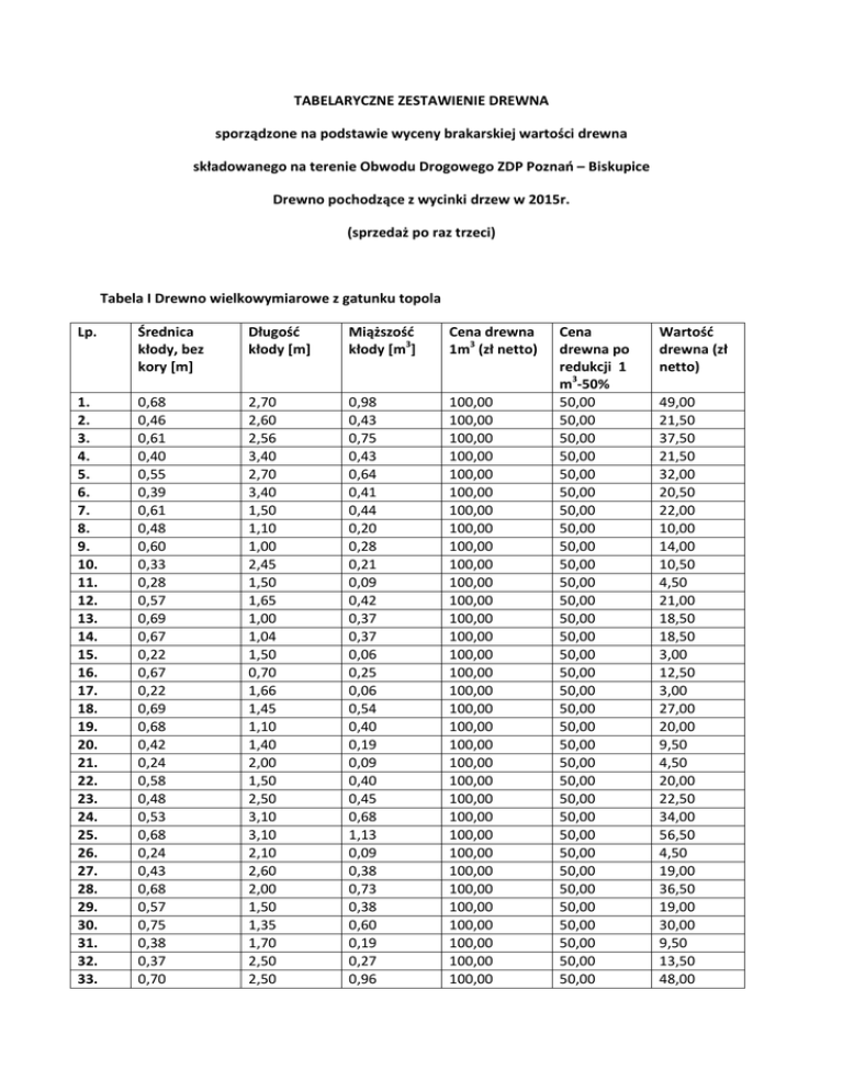 TABELARYCZNE ZESTAWIENIE DREWNA sporządzone na podstawie wyceny brakarskiej wartości drewna składowanego na terenie Obwodu Drogowego ZDP Poznań – Biskupice Drewno pochodzące z wycinki drzew w 2015r. (sprzedaż po raz trzeci) Tabela I Drewno wielkowymiarowe z gatunku topola Lp. Średnica kłody, bez kory [m] Długość kłody [m] Miąższość kłody [m3] Cena drewna 1m3 (zł netto) 1. 2. 3. 4. 5. 6. 7. 8. 9. 10. 11. 12. 13. 14. 15. 16. 17. 18. 19. 20. 21. 22. 23. 24. 25. 26. 27. 28. 29. 30. 31. 32. 33. 0,68 0,46 0,61 0,40 0,55 0,39 0,61 0,48 0,60 0,33 0,28 0,57 0,69 0,67 0,22 0,67 0,22 0,69 0,68 0,42 0,24 0,58 0,48 0,53 0,68 0,24 0,43 0,68 0,57 0,75 0,38 0,37 0,70 2,70 2,60 2,56 3,40 2,70 3,40 1,50 1,10 1,00 2,45 1,50 1,65 1,00 1,04 1,50 0,70 1,66 1,45 1,10 1,40 2,00 1,50 2,50 3,10 3,10 2,10 2,60 2,00 1,50 1,35 1,70 2,50 2,50 0,98 0,43 0,75 0,43 0,64 0,41 0,44 0,20 0,28 0,21 0,09 0,42 0,37 0,37 0,06 0,25 0,06 0,54 0,40 0,19 0,09 0,40 0,45 0,68 1,13 0,09 0,38 0,73 0,38 0,60 0,19 0,27 0,96 100,00 100,00 100,00 100,00 100,00 100,00 100,00 100,00 100,00 100,00 100,00 100,00 100,00 100,00 100,00 100,00 100,00 100,00 100,00 100,00 100,00 100,00 100,00 100,00 100,00 100,00 100,00 100,00 100,00 100,00 100,00 100,00 100,00 Cena drewna po redukcji 1 m3-50% 50,00 50,00 50,00 50,00 50,00 50,00 50,00 50,00 50,00 50,00 50,00 50,00 50,00 50,00 50,00 50,00 50,00 50,00 50,00 50,00 50,00 50,00 50,00 50,00 50,00 50,00 50,00 50,00 50,00 50,00 50,00 50,00 50,00 Wartość drewna (zł netto) 49,00 21,50 37,50 21,50 32,00 20,50 22,00 10,00 14,00 10,50 4,50 21,00 18,50 18,50 3,00 12,50 3,00 27,00 20,00 9,50 4,50 20,00 22,50 34,00 56,50 4,50 19,00 36,50 19,00 30,00 9,50 13,50 48,00 34. 35. 36. 37. 38. 39. 40. 41. 42. 43. 44. 45. 46. 47. 48. 49. 50. 51. 52. 53. 54. 55. 56. 57. 58. 59. 60. 61. 62. 63. 64. 65. 66. 67. Razem 0,34 0,55 0,44 0,34 0,42 0,48 0,26 0,37 0,24 0,17 0,68 0,76 0,73 0,49 0,20 0,80 0,28 0,87 0,79 0,75 0,70 0,50 0,85 0,56 0,22 0,56 0,88 0,51 0,78 0,73 0,27 0,27 0,19 0,18 4,00 1,30 5,90 7,00 7,00 5,70 3,18 7,00 4,80 4,50 1,50 0,63 1,25 2,40 2,21 0,52 2,37 0,50 0,52 1,93 0,50 1,36 0,90 2,42 2,85 3,60 0,70 1,90 0,54 1,04 1,80 1,65 2,16 1,65 0,36 0,31 0,90 0,64 0,97 1,03 0,17 0,75 0,22 0,10 0,54 0,29 0,52 0,45 0,07 0,26 0,15 0,30 0,25 0,85 0,19 0,27 0,51 0,60 0,11 0,89 0,43 0,39 0,26 0,44 0,10 0,09 0,06 0,04 27,38 100,00 100,00 100,00 100,00 100,00 100,00 100,00 100,00 100,00 100,00 100,00 100,00 100,00 100,00 100,00 100,00 100,00 100,00 100,00 100,00 100,00 100,00 100,00 100,00 100,00 100,00 100,00 100,00 100,00 100,00 100,00 100,00 100,00 100,00 50,00 50,00 50,00 50,00 50,00 50,00 50,00 50,00 50,00 50,00 50,00 50,00 50,00 50,00 50,00 50,00 50,00 50,00 50,00 50,00 50,00 50,00 50,00 50,00 50,00 50,00 50,00 50,00 50,00 50,00 50,00 50,00 50,00 50,00 Cena po obniżce 50%: 684,50zł 18,00 15,50 45,00 32,00 48,50 51,50 8,50 37,50 11,00 5,00 27,00 14,50 26,00 22,50 3,50 13,00 7,50 15,00 12,50 42,50 9,50 13,50 25,50 30,00 5,50 44,50 21,50 19,50 13,00 22,00 5,00 4,50 3,00 2,00 1369,00 Tabela II Drewno wielkowymiarowe z gatunku lipa szerokolistna Lp. Średnica kłody, bez kory [m] Długość kłody [m] Miąższość kłody [m3] Cena drewna 1m3 (zł netto) Wartość drewna (zł netto) 100,00 100,00 100,00 100,00 100,00 100,00 100,00 100,00 Cena drewna po redukcji 1 m3-50% 50,00 50,00 50,00 50,00 50,00 50,00 50,00 50,00 1. 2. 3. 4. 5. 6. 7. 8. 0,51 0,96 0,44 0,59 0,46 0,42 0,15 0,14 2,16 2,10 1,85 1,80 2,60 2,85 2,57 3,10 0,44 1,52 0,28 0,49 0,43 0,39 0,05 0,05 9. 0,18 3,10 0,08 100,00 50,00 4,00 10. 0,18 2,05 0,05 100,00 50,00 2,50 11. 0,15 2,60 0,05 100,00 50,00 2,50 12. 0,52 1,10 0,23 100,00 50,00 11,50 13. 0,22 1,80 0,07 100,00 50,00 3,50 14. 0,39 3,10 0,37 100,00 50,00 18,50 15. 0,29 2,38 0,16 100,00 50,00 8,00 16. 0,20 2,34 0,07 100,00 50,00 3,50 17. 0,47 1,06 0,18 100,00 50,00 9,00 Razem 4,91 22,00 76,00 14,00 24,50 21,50 19,50 2,50 2,50 245,50 Cena po obniżce 50%: 122,75zł Tabela III Drewno wielkowymiarowe z gatunku jesion wyniosły Lp. Średnica kłody, bez kory [m] Długość kłody [m] Miąższość kłody [m3] Cena drewna 1m3 (zł netto) Wartość drewna (zł netto) 100,00 100,00 100,00 100,00 100,00 100,00 100,00 100,00 Cena drewna po redukcji 1 m3-50% 50,00 50,00 50,00 50,00 50,00 50,00 50,00 50,00 1. 2. 3. 4. 5. 6. 7. 8. 0,38 0,62 0,29 0,41 0,24 0,59 0,46 0,35 2,70 4,10 2,20 1,65 1,65 4,20 1,80 1,60 0,31 1,24 0,15 0,22 0,07 1,15 0,30 0,15 9. 0,29 2,60 0,17 100,00 50,00 8,50 10. 0,42 2,90 0,40 100,00 50,00 20,00 11. 0,27 2,80 0,16 100,00 50,00 8,00 12. 0,29 2,00 0,13 100,00 50,00 6,50 13. 0,57 2,10 0,54 100,00 50,00 27,00 14. 0,52 2,45 0,52 100,00 50,00 26,00 15. 0,33 2,20 0,19 100,00 50,00 9,50 16. 0,45 2,84 0,45 100,00 50,00 22,50 17. 0,51 2,86 0,58 100,00 50,00 29,00 18. 0,27 2,90 0,17 100,00 50,00 8,50 19. 0,31 2,50 0,19 100,00 50,00 9,50 20. 0,27 2,50 0,14 100,00 50,00 7,00 21. 0,22 3,40 0,13 100,00 50,00 6,50 22. 0,15 2,70 0,05 100,00 50,00 2,50 23. 0,28 4,00 0,25 100,00 50,00 12,50 24. 0,16 3,25 0,07 100,00 50,00 3,50 25. 0,75 2,30 1,02 100,00 50,00 51,00 26. 0,71 3,75 1,48 100,00 50,00 74,00 27. 0,14 3,00 0,05 100,00 50,00 2,50 28. 0,21 2,90 0,10 100,00 50,00 5,00 29. 0,72 1,51 0,61 100,00 50,00 30,50 30. 0,23 1,75 0,07 100,00 50,00 3,50 31. 0,28 2,85 0,18 100,00 50,00 9,00 32. 0,34 2,40 0,22 100,00 50,00 11,00 33. 0,59 3,60 0,98 100,00 50,00 49,00 15,50 62,00 7,50 11,00 3,50 57,50 15,00 7,50 34. 0,61 1,10 0,32 100,00 50,00 16,00 35. 0,46 1,50 0,25 100,00 50,00 12,50 36. 0,56 4,30 1,06 100,00 50,00 53,00 37. 0,73 2,70 1,13 100,00 50,00 56,50 38. 0,41 1,50 0,20 100,00 50,00 10,00 39. 0,62 2,80 0,84 100,00 50,00 42,00 40. 0,57 2,30 0,59 100,00 50,00 29,50 41. 0,31 2,15 0,16 100,00 50,00 8,00 42. 0,33 1,26 0,11 100,00 50,00 5,50 Razem 17,1 855,00 Cena po obniżce 50%: 427,50zł Tabela IV Drewno wielkowymiarowe z gatunku wiąz pospolity Lp. Średnica kłody, bez kory [m] Długość kłody [m] Miąższość kłody [m3] Cena drewna 1m3 (zł netto) 1. 2. 3. 4. 5. 6. 7. 8. 9. 10. 11. 12. 