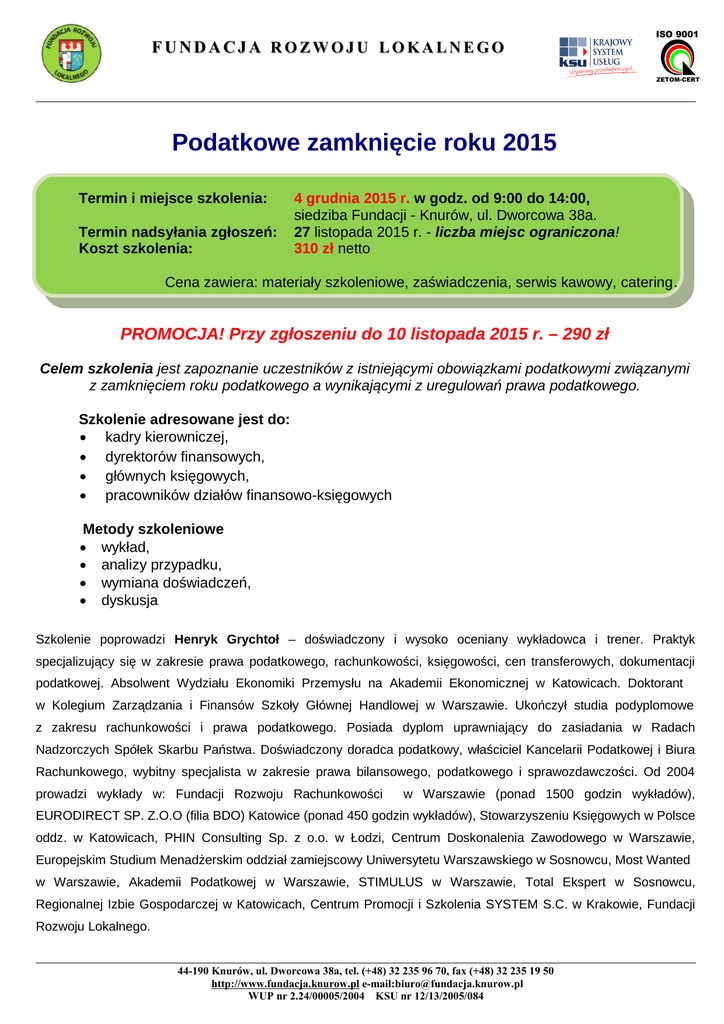 FUNDACJA ROZWOJU LOKALNEGO ISO 9001 ZETOM-CERT Podatkowe zamknięcie roku 2015 Termin i miejsce szkolenia: Termin nadsyłania zgłoszeń: Koszt szkolenia: 4 grudnia 2015 r. w godz. od 9:00 do 14:00, siedziba Fundacji - Knurów, ul. Dworcowa 38a. 27 listopada 2015 r. - liczba miejsc ograniczona! 310 zł netto Cena zawiera: materiały szkoleniowe, zaświadczenia, serwis kawowy, catering. PROMOCJA! Przy zgłoszeniu do 10 listopada 2015 r. – 290 zł Celem szkolenia jest zapoznanie uczestników z istniejącymi obowiązkami podatkowymi związanymi z zamknięciem roku podatkowego a wynikającymi z uregulowań prawa podatkowego. Szkolenie adresowane jest do: kadry kierowniczej, dyrektorów finansowych, głównych księgowych, pracowników działów finansowo-księgowych Metody szkoleniowe wykład, analizy przypadku, wymiana doświadczeń, dyskusja Szkolenie poprowadzi Henryk Grychtoł – doświadczony i wysoko oceniany wykładowca i trener. Praktyk specjalizujący się w zakresie prawa podatkowego, rachunkowości, księgowości, cen transferowych, dokumentacji podatkowej. Absolwent Wydziału Ekonomiki Przemysłu na Akademii Ekonomicznej w Katowicach. Doktorant w Kolegium Zarządzania i Finansów Szkoły Głównej Handlowej w Warszawie. Ukończył studia podyplomowe z zakresu rachunkowości i prawa podatkowego. Posiada dyplom uprawniający do zasiadania w Radach Nadzorczych Spółek Skarbu Państwa. Doświadczony doradca podatkowy, właściciel Kancelarii Podatkowej i Biura Rachunkowego, wybitny specjalista w zakresie prawa bilansowego, podatkowego i sprawozdawczości. Od 2004 prowadzi wykłady w: Fundacji Rozwoju Rachunkowości w Warszawie (ponad 1500 godzin wykładów), EURODIRECT SP. Z.O.O (filia BDO) Katowice (ponad 450 godzin wykładów), Stowarzyszeniu Księgowych w Polsce oddz. w Katowicach, PHIN Consulting Sp. z o.o. w Łodzi, Centrum Doskonalenia Zawodowego w Warszawie, Europejskim Studium Menadżerskim oddział zamiejscowy Uniwersytetu Warszawskiego w Sosnowcu, Most Wanted w Warszawie, Akademii Podatkowej w Warszawie, STIMULUS w Warszawie, Total Ekspert w Sosnowcu, Regionalnej Izbie Gospodarczej w Katowicach, Centrum Promocji i Szkolenia SYSTEM S.C. w Krakowie, Fundacji Rozwoju Lokalnego. 44-190 Knurów, ul. Dworcowa 38a, tel. (+48) 32 235 96 70, fax (+48) 32 235 19 50 http://www.fundacja.knurow.pl e-mail:[email protected] WUP nr 2.24/00005/2004 KSU nr 12/13/2005/084 FUNDACJA ROZWOJU LOKALNEGO ISO 9001 ZETOM-CERT ______________________________________________________________________________________________ Program szkolenia Podatek dochodowy od osób prawnych: 1. Podatek dochodowy od osób prawnych jako podatek rozliczany rocznie; roczne rozliczenie podatku – zmiana i zasady wyznaczania roku podatkowego 2. Zakończenie roku podatkowego i bilansowego a. roczna kalkulacja podatku, b. przejście z wyniku bilansowego na wynik podatkowy, c. ostateczne rozliczenie zaliczek na podatek dochodowy od osób prawnych, d. deklaracja CIT-8 i inne obowiązki informacyjne, e. zatwierdzenie sprawozdania finansowego i sprawozdania zarządu. 3. Przychód podatkowy a przychód finansowy – ujęcie w rocznym sprawozdaniu finansowym. 4. Przychód podatkowy i moment jego uzyskania. a. otwarty katalog przychodów z art. 12 updop (ze szczególnym uwzględnieniem przychodów z nieodpłatnych świadczeń i zasad ustalania ich wartości, umorzonych bądź przedawnionych zobowiązań). b. moment rozpoznania przychodu: - zasada MEMORIAŁOWA jako zasada ogólna, - rozliczanie usług ciągłych oraz metoda kasowa jako wyjątki od „zasady memoriałowej”, c. korekta bieżąca lub wsteczna w zakresie: przyznanych rabatów, premii pieniężnych, otrzymanych próbek, nieodpłatnie otrzymanych towarów, korekt obrotu. d. katalog przysporzeń majątkowych nie stanowiących przychodów, e. pojęcie zapłaty jako momentu rozpoznania przychodu powstającego na zasadzie kasowej (kapitalizacja, potrącenie, kompensata), f. szczególne momenty rozpoznania niektórych przychodów (umorzenie zobowiązania, przedawnienie, zasiedzenie), czy umorzenie odsetek skutkuje powstaniem przychodu, g. moment rozpoznania przychodu lub potrącenia kosztu z tytułu sprzedawanych lub nabywanych usług poręczeń i gwarancji, h. zasady korygowania przychodów z działalności gospodarczej, i. moment powstania przychodu z tytułu otrzymanej premii pieniężnej. 5. Koszty uzyskania przychodu – definicja i zasady rozliczania kosztów w czasie: a. koszty związane z przychodem danego roku, b. koszty dotyczące lat poprzednich, c. koszty przyszłych okresów, d. koszty rozliczane kasowo. 6. Korekta kosztów – zmiana przepisów obowiązujących od 1.01.2015 roku: - zmiany służące zapobieganiu zatorom płatniczym, czyli podatkowe instrumenty przymuszania kontrahentów do unikania opóźnień w płatnościach zobowiązań - charakterystyka nowych instrumentów prawnych, - skutki podatkowe opóźnienia płatności zobowiązania na rzecz kontrahenta - obowiązek zmniejszenia kosztów podatkowych przypadku zaliczenia do kosztów uzyskania przychodów kwoty wynikającej z dokumentów zobowiązaniowych i nieuregulowania należności (terminy), - następcza korekta kosztów - zasady rozliczenia zmniejszonych kosztów podatkowych w sytuacji, gdy po dokonaniu zmniejszenia kosztów podatkowych, zobowiązanie zostanie przez dłużnika uregulowane, - skutki podatkowe opóźnienia płatności na rzecz kontrahenta, w sytuacji wydatków ponoszonych na nabycie lub wytworzenie środków trwałych albo na nabycie lub wytworzenie wartości niematerialnych i prawnych - zasady uznawania za koszt podatkowy odpisów amortyzacyjnych od takich środków trwałych oraz od WniP, - skutki podatkowe opóźnienia płatności zobowiązań a rozliczanie przez podatnika kosztów bezpośrednich, - wierzyciele krajowi i zagraniczni a obowiązek korygowania kosztów, - ustalenia kontraktowe stron zawartej umowy, a przepisy o przeciwdziałaniu zatorom płatniczym, w tym ustal