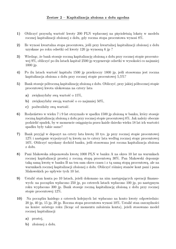 Zestaw 2 – Kapitalizacja złożona z dołu zgodna 1) Obliczyć