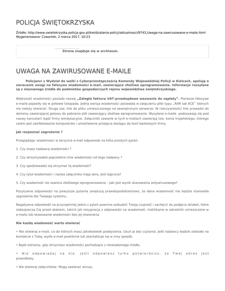 POLICJA ŚWIĘTOKRZYSKA Źródło: http://www.swietokrzyska.policja.gov.pl/kie/dzialania-policji/aktualnosci/9743,Uwaga-na-zawirusowane-e-maile.html Wygenerowano: Czwartek, 2 marca 2017, 10:23 Strona znajduje się w archiwum. UWAGA NA ZAWIRUSOWANE E-MAILE Policjanci z Wydział do walki z Cyberprzestępczością Komendy Wojewódzkiej Policji w Kielcach, apelują o zwracanie uwagi na fałszywe wiadomości e-mail, zawierające złośliwe oprogramowanie. Informacje rozsyłane są z nieznanego źródła do podmiotów gospodarczych rejonu województwa świętokrzyskiego. Większość wiadomości posiada nazwę „Zaległa faktura VAT-przedsądowe wezwanie do zapłaty”. Pierwsze fałszywe e-maile pojawiły się w połowie listopada. Jedna wersja wiadomości posiadała w załączeniu pliki typu ,,RAR lub ACE’’ których nie należy otwierać. Druga zaś, link do pliku umieszczonego na zewnętrznym serwerze. W rzeczywistości link prowadzi do domeny zawierającej gotowy do pobrania plik zawierający złośliwe oprogramowanie. Wysyłane e-maile podszywają się pod nazwy kancelarii bądź firmy windykacyjne. Załączniki zawarte w tych e-mailach zawierają tzw. konia trojańskiego, którego celem jest zainfekowanie komputerów i umożliwienie przejęcia dostępu do kont bankowych firmy. Jak rozpoznać zagrożenie ? Przeglądając wiadomości w skrzynce e-mail odpowiedz na kilka prostych pytań: 1. Czy znasz nadawcę wiadomości ? 2. Czy otrzymywałeś poprzednio inne wiadomości od tego nadawcy ? 3. Czy spodziewałeś się otrzymać tę wiadomość? 4. Czy tytuł wiadomości i nazwa załącznika mają sens, jest logiczna? 5. Czy wiadomość nie zawiera złośliwego oprogramowania – jaki jest wynik skanowania antywirusowego? Pozytywne odpowiedzi na powyższe pytania zwiększą prawdopodobieństwo, że dana wiadomość nie będzie stanowiła zagrożenia dla Twojego systemu. Negatywna odpowiedź na przynajmniej jedno z pytań powinna wzbudzić Twoją czujność i zachęcić do podjęcia działań, które zabezpieczą Cię przed atakiem, takich jak rezygnacja z odpowiedzi na wiadomość, nieklikanie w odnośniki umieszczone w e-mailu lub skasowanie wiadomości bez jej otwierania. Nie każdą wiadomość warto otwierać • Nie otwieraj e-maili, co do których masz jakiekolwiek podejrzenia. Usuń je bez czytania. Jeśli nadawcy będzie zależało na kontakcie z Tobą, wyśle e-mail powtórnie lub skontaktuje się w inny sposób. • Bądź ostrożny, gdy otrzymasz wiadomości pochodzące z niewiadomego źródła. • Nie odpowiadaj na nie. Jeśli odpowiesz prawidłowy. • Nie otwieraj załączników. Mogą zawierać wirusy. tylko potwierdzisz, że Twój adres jest • Nie klikaj w żadne linki zamieszczone w takim e-mailu. Mogą przekierować Cię na fałszywe strony wykorzystujące „niezałatane” luki w Twoim systemie. Mogą też uruchomić pobieranie złośliwego pliku. Zabezpieczenie komputera • Przede wszystkim upewnij się, że Twój system operacyjny jest zabezpieczony programem antywirusowym i firewallem. • Pamiętaj, aby na bieżąco aktualizować oprogramowanie na komputerze, w szczególności system operacyjny, oprogramowanie antywirusowe, firewall, przeglądarki internetowe oraz program pocztowy. • Skanuj programem antywirusowym każdy załącznik, który chcesz pobrać na dysk komputera i otworzyć, nawet pochodzący od osób znajomych. Opr. PN/MB Źródło: KWP w Kielcach Ocena: 5/5 (1) Tweetnij