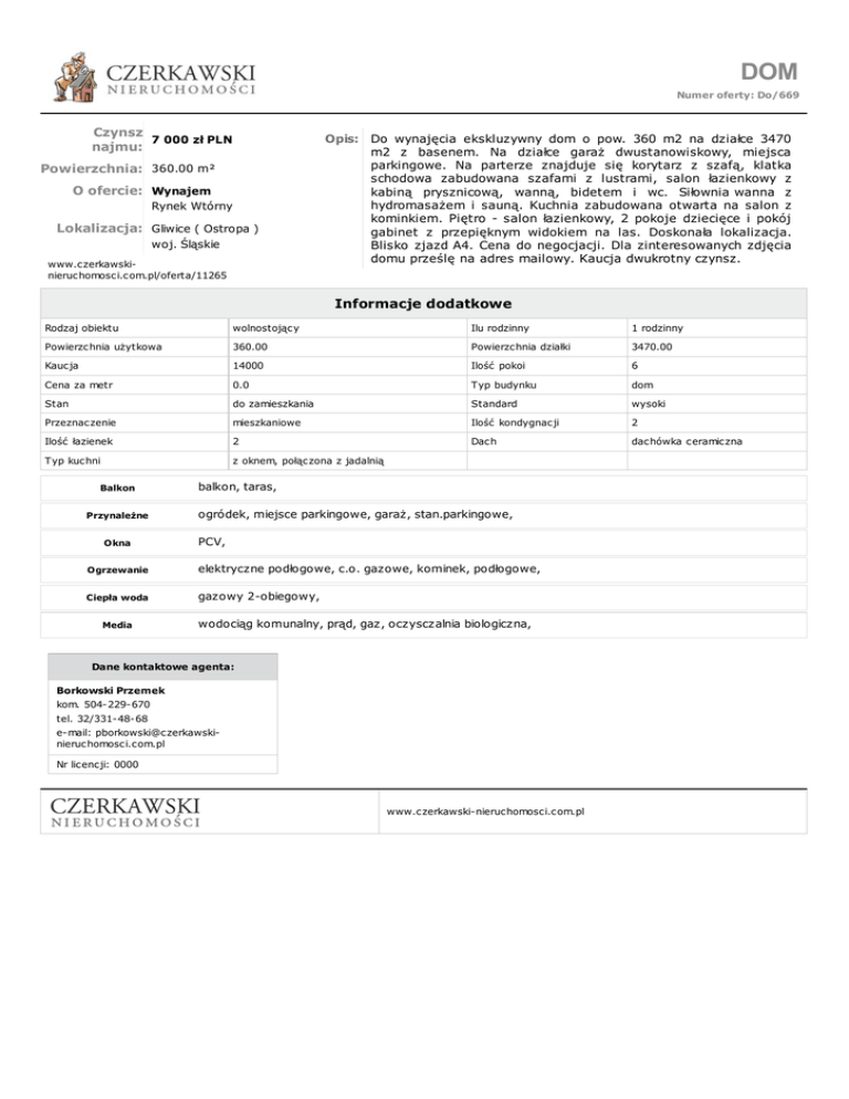 DOM Numer oferty: Do/669 Czynsz 7 000 zł PLN najmu: Powierzchnia: 360.00 m² O ofercie: Wynajem Rynek Wtórny Lokalizacja: Gliwice ( Ostropa ) woj. Śląskie www.czerkawskinieruchomosci.com.pl/oferta/11265 Opis: Do wynajęcia ekskluzywny dom o pow. 360 m2 na działce 3470 m2 z basenem. Na działce garaż dwustanowiskowy, miejsca parkingowe. Na parterze znajduje się korytarz z szafą, klatka schodowa zabudowana szafami z lustrami, salon łazienkowy z kabiną prysznicową, wanną, bidetem i wc. Siłownia wanna z hydromasażem i sauną. Kuchnia zabudowana otwarta na salon z kominkiem. Piętro - salon łazienkowy, 2 pokoje dziecięce i pokój gabinet z przepięknym widokiem na las. Doskonała lokalizacja. Blisko zjazd A4. Cena do negocjacji. Dla zinteresowanych zdjęcia domu prześlę na adres mailowy. Kaucja dwukrotny czynsz. Informacje dodatkowe Rodzaj obiektu wolnostojący Ilu rodzinny 1 rodzinny Powierzchnia użytkowa 360.00 Powierzchnia działki 3470.00 Kaucja 14000 Ilość pokoi 6 Cena za metr 0.0 Typ budynku dom Stan do zamieszkania Standard wysoki Przeznaczenie mieszkaniowe Ilość kondygnacji 2 Ilość łazienek 2 Dach dachówka ceramiczna Typ kuchni z oknem, połączona z jadalnią Balkon Przynależne Okna balkon, taras, ogródek, miejsce parkingowe, garaż, stan.parkingowe, PCV, Ogrzewanie elektryczne podłogowe, c.o. gazowe, kominek, podłogowe, Ciepła woda gazowy 2-obiegowy, Media wodociąg komunalny, prąd, gaz, oczysczalnia biologiczna, Dane kontaktowe agenta: Borkowski Przemek kom. 504-229-670 tel. 32/331-48-68 e-mail: [email protected] Nr licencji: 0000 www.czerkawski-nieruchomosci.com.pl