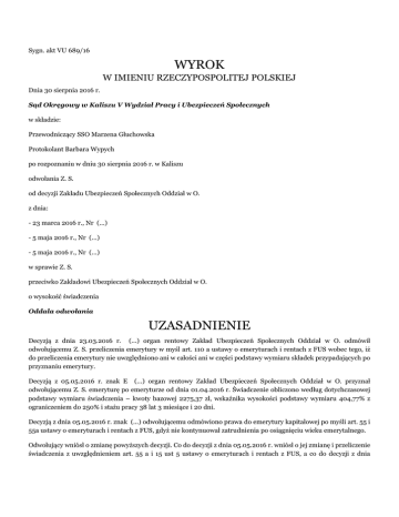 Sygn. akt VU 689/16 WYROK W IMIENIU RZECZYPOSPOLITEJ POLSKIEJ Dnia 30 sierpnia 2016 r. Sąd Okręgowy w Kaliszu V Wydział Pracy i Ubezpieczeń Społecznych w składzie: Przewodniczący SSO Marzena Głuchowska Protokolant Barbara Wypych po rozpoznaniu w dniu 30 sierpnia 2016 r. w Kaliszu odwołania Z. S. od decyzji Zakładu Ubezpieczeń Społecznych Oddział w O. z dnia: - 23 marca 2016 r., Nr (...) - 5 maja 2016 r., Nr (...) - 5 maja 2016 r., Nr (...) w sprawie Z. S. przeciwko Zakładowi Ubezpieczeń Społecznych Oddział w O. o wysokość świadczenia Oddala odwołania UZASADNIENIE Decyzją z dnia 23.03.2016 r. (...) organ rentowy Zakład Ubezpieczeń Społecznych Oddział w O. odmówił odwołującemu Z. S. przeliczenia emerytury w myśl art. 110 a ustawy o emeryturach i rentach z FUS wobec tego, iż do przeliczenia emerytury nie uwzględniono ani w całości ani w części podstawy wymiaru składek przypadających po przyznaniu emerytury. Decyzją z 05.05.2016 r. znak E (...) organ rentowy Zakład Ubezpieczeń Społecznych Oddział w O. przyznał odwołującemu Z. S. emeryturę po emeryturze od dnia 01.04.2016 r. Świadczenie obliczono według dotychczasowej podstawy wymiaru świadczenia – kwoty bazowej 2275,37 zł, wskaźnika wysokości podstawy wymiaru 404,77% z ograniczeniem do 250% i stażu pracy 38 lat 3 miesiące i 20 dni. Decyzją z dnia 05.05.2016 r. znak (...) odwołującemu odmówiono prawa do emerytury kapitałowej po myśli art. 55 i 55a ustawy o emeryturach i rentach z FUS, gdyż nie kontynuował zatrudnienia po osiągnięciu wieku emerytalnego. Odwołujący wniósł o zmianę powyższych decyzji. Co do decyzji z dnia 05.05.2016 r. wniósł o jej zmianę i przeliczenie świadczenia z uwzględnieniem art. 55 a i 15 ust 5 ustawy o emeryturach i rentach z FUS, a co do decyzji z dnia 23.03.2016 r. odwołujący wniósł o jej zmianę także powołując się na przepisy art. 55a i 15 ust 5 ustawy o emeryturach i rentach z FUS. Organ rentowy wniósł o oddalenie odwołania. Sąd ustalił i zważył co następuje. Odwołujący jest rocznik 1945. Od stycznia 1999 r. do marca 2003 r. odwołujący pobierał rentę z tytułu niezdolności do pracy. Następnie pobierał świadczenie przedemerytalne. W listopadzie 2007 r. odwołujący wniósł o przyznanie emerytury. Liczył wtedy 62 lata. Odmówiono przyznania świadczenia. W maju 2008 r. odwołujący wniósł o przyznanie emerytury z racji przepracowania 35 lat. Decyzją z dnia 06.06.2008 r. odwołującemu przyznano emeryturę obliczoną według wskaźnika wysokości podstawy wymiaru z 10 lat 1989-1998 – 404,77% ograniczonego do 250%, kwoty bazowej 2275,37 zł i stażu pracy 38 lat. Emeryturę tę odwołujący pobierał. Po przyznaniu świadczenia odwołujący nie kontynuował ubezpieczenia. Nie kontynuował także ubezpieczenia w dacie osiągnięcia powszechnego wieku emerytalnego – (...) r. i w dacie wystąpienia o ponowne ustalenie świadczenia- w lutymi kwietniu 2016 r., który to wniosek potraktowano jako wniosek o emeryturę w wieku powszechnym. Decyzją z dnia 23.03.2016 r. odwołującemu odmówiono ponownego ustalenia emerytury w oparciu o art. 110 ustawy o emeryturach i rentach z FUS wobec nie wskazania zarobków przypadających co najmniej w części po przyznaniu emerytury. Decyzją z dnia 05.05.2016 r. odwołującemu przyznano emeryturę od dnia 01.04.2016 r., obliczając ją według kwoty bazowej 2275,37 zł i wskaźnika wysokości podstawy wymiaru 250% i przyznania emerytury kapitałowej w myśl art. 55 i 55 a ustawy o emeryturach i rentach z FUS. Emerytura kapitałowa, której przyznania odwołujący żąda przewidziana jest w art. 24 i 26 cytowanej ustawy, które to przepisy znajdują się w Dziale II rozdział 1 cyt. ustawy z dnia 17.12.1998 r. o emeryturach i rentach z FUS – emerytura dla ubezpieczonych urodzonych po dniu 31.12.1948 r. Z zasady przepisy te nie dotyczą osób urodzonych przed 31.12.1948 r. Przepisy te nie dotyczą odwołującego, który jest rocznik 1945. Jako wyjątek od tej zasady przewidziano regulację zawartą w art. 55 ustawy o emeryturach i rentach z FUS. Regulacja ta mieści się w Dziale II rozdział 4 - ustalanie wysokości emerytur, o których mowa w art. 27-50 e. W myśl art. 55 ustawy z dnia 17.12.1998 r. o emeryturach i rentach z Funduszu Ubezpieczeń Społecznych (Dz. U. z 2015 r. poz. 748) ubezpieczonemu spełniającemu warunki do uzyskania emerytury na podstawie art. 27, który kontynuował ubezpieczenie po osiągnięciu wieku emerytalnego i wystąpił z wnioskiem o przyznanie emerytury po dniu 31.12.2008 r., może być obliczona emerytura na podstawie art. 26 cyt. ustawy. Dla skorzystania z możliwości przewidzianej w tym przepisie konieczne jest spełnienie łącznie kilku warunków. Przepis dotyczy ubezpieczonego spełniającego warunki do uzyskania emerytury na podstawie art. 27. Emerytura w myśl art. 27 to emerytura w wieku podstawowym, a więc dla odwołującego emerytura po osiągnięciu 65 lat. Odwołujący wiek 65 lat osiągnął w dniu (...) r. Drugim warunkiem zastosowania tego przepisu jest złożenie wniosku o emeryturę po 31.12.2008 r. Z wnioskiem o emeryturę w wieku podstawowym odwołujący wystąpił 2016 r. Emeryturę taką odwołującemu przyznano w maju 2016 r. od dnia 01.04.2016. Kolejnym warunkiem jest kontynuowanie ubezpieczenie po osiągnięciu wieku emerytalnego podstawowego. Odwołujący nie kontynuował ubezpieczenia po osiągnięciu podstawowego wieku emerytalnego. Odwołujący nie spełnia więc warunków do obliczenia mu emerytury zgodnie z art. 26 ustawy o emeryturach i rentach z FUS. Nie znajduje więc do niego zastosowania art. 55 ustawy o emeryturach i rentach z FUS. Podobnie nie znajduje do niego zastosowania art. 55 a wymienionej ustawy obowiązujący od 01.05.2015 r., który wprowadza możliwość obliczenia emerytury zgodnie z art. 26 ustawy o emeryturach i rentach z FUS, dla emerytów pobierających wcześniejsze emerytury, ale takż
