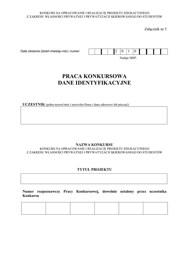 KONKURS NA OPRACOWANIE I REALIZACJĘ PROJEKTU EDUKACYJNEGO Z ZAKRESU WŁASNOŚCI PRYWATNEJ I PRYWATYZACJI SKIEROWANEGO DO STUDENTÓW Załącznik nr 5 Data złożenia (dzień-miesiąc-rok) i numer: 2 0 1 0 Nadaje MSP: PRACA KONKURSOWA DANE IDENTYFIKACYJNE UCZESTNIK (pełna nazwa/imie i nazwisko/firma i dane adresowe lub pieczęć) NAZWA KONKURSU KONKURS NA OPRACOWANIE I REALIZACJĘ PROJEKTU EDUKACYJNEGO Z ZAKRESU WŁASNOŚCI PRYWATNEJ I PRYWATYZACJI SKIEROWANEGO DO STUDENTÓW TYTUŁ PROJEKTU Numer rozpoznawczy Pracy Konkursowej, dowolnie ustalony przez uczestnika Konkursu