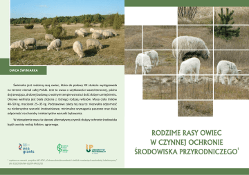 owca świniarka Świniarka jest rodzimą rasą owiec, która do połowy XX stulecia występowała na terenie niemal całej Polski. Jest to owca o użytkowości wszechstronnej, późno dojrzewająca, drobnej budowy, o wolnym tempie wzrostu i dość słabym umięśnieniu. Okrywa wełnista jest biała złożona z różnego rodzaju włosów. Masa ciała tryków 40–50 kg, maciorek 25–35 kg. Podstawowe zalety tej rasy to: niezwykła odporność na niekorzystne warunki środowiskowe, minimalne wymagania paszowe oraz duża odporność na choroby i niekorzystne warunki bytowania. W ekosystemie owca ta stanowi alternatywny czynnik służący ochronie środowiska bądź swoisty rodzaj folkloru agrarnego. Rodzime rasy owiec w czynnej ochronie środowiska przyrodniczego wydano w ramach projektu MF EOG ,,Ochrona bioróżnorodności siedlisk trawiastych wschodniej Lubelszczyzny” (Nr 520/2014/Wn-03/OP-XN-02/D) 1 1 Brak użytkowania runi w siedliskach objętych ochroną przyrody jest m.in. przyczyną sukcesji wtórnej, która objawia się wzrostem udziału krzewów oraz drzew, zubożeniem różnorodności biologicznej i tym samym zachwianiem równowagi ekologicznej wymienionych terenów. Niekontrolowane zarastanie siedlisk przyczynia się bowiem do ginięcia wielu cennych gatunków roślin i zwierząt oraz powoduje nieodwracalne zmiany w krajobrazie. W celu zapobieżenia opisanym zjawiskom zalecany jest kontrolowany wypas owiec. Pozytywnymi przykładami promującymi wprowadzanie owiec na obszary, w których niegdyś bytowały jest prowadzony obecnie wypas owiec m.in. na halach i polanach górskich w obrębie Tatrzańskiego Parku Narodowego, w Roztoczańskim Parku Narodowym, na obszarze Jury Krakowsko-Częstochowskiej czy też w Parku Krajobrazowym – Podlaski Przełom Bugu. W ramach niniejszego Projektu1 wypas prowadzony jest na obszarach Natura 2000 zlokalizowanych w województwie lubelskim w rezerwatach Stawska Góra, Gródek k/Hrubieszowa oraz Kąty k/Zamościa. Główne korzyści z wypasu owiec na terenach przyrodniczo cennych to: utrzymanie, a następnie zwiększenie różnorodności biologicznej środowiska powstrzymanie sukcesji wtórnej drzew i krzewów zwiększenie ilość światła docierającego do gleby (wzrost jej temperatury) wzbogacenie gleby w substancje odżywcze bez zmiany jej odczynu (odchody owiec) powstrzymanie erozji poprzez wzmocnienie systemu korzeniowego roślin (ugniatanie gleby) przywrócenie i zachowanie regionalnego krajobrazu ze zwierzętami gospodarskimi. Istotną decyzją przy wypasie jest dobór odpowiedniej rasy zwierząt. Uwzględniając główne uwarunkowania i dotychczasowe doświadczenia z tego zakresu wybór pada na rodzime populacje co przyczynia się do utrzymywania bioróżnorodności wśród zwierząt gospodarskich. Na terenie Polski środkowo-wschodniej takimi rodzimymi populacjami są owce uhruskie oraz świniarki. owca uhruska Owca uhruska będąca odmianą polskiej owcy nizinnej to rodzima populacja wytworzona na potrzeby środkowo-wschodniej Polski. Zwierzęta te charakteryzują się wełną białą jednolitą o sortymencie BC–C i wydajności około 5,5 kg u maciorek oraz 9–10 kg u tryków. Pod względem budowy są to owce średniej wielkości osiągające masę ciała 60–80 kg maciorki i 95–110 kg tryki. Jagnięta charakteryzują się dobrym tempem wzrostu i wysokimi parametrami użytkowości mięsnej. Dojrzałość rozpłodową owce uzyskują już w pierwszym roku życia, a ich plenność życiowa oscyluje w granicach 140–160 %. Jako zwierzęta wytworzone na Lubelszczyźnie i utrzymywane tu od wielu lat, doskonale przystosowane są do warunków panującego klimatu dobrze znosząc zarówno alkierzowy jak i pastwiskowy system utrzymania. Wspomniane zalety owiec uhruskich sprawiają, że zwierzęta te mogą być wykorzystywane do czynnej ochrony przyrody.