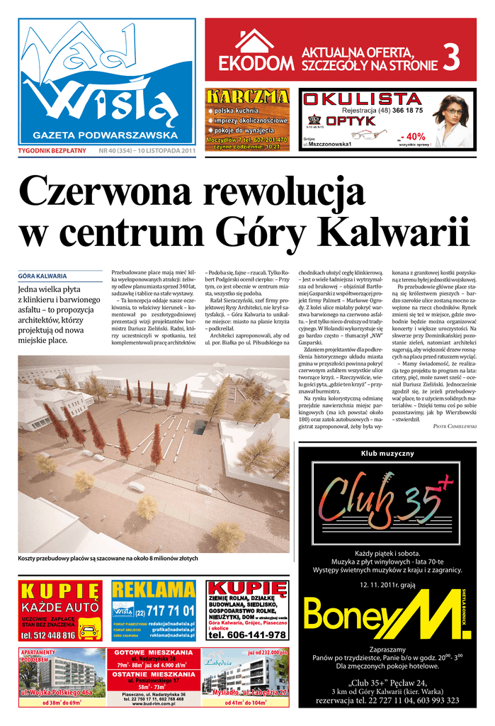 EKODOM tygodnik BEZPŁATNy AKTUALNA OFERTA, SZCZEGÓŁY NA STRONIE 3 NR 40 (354) – 10 listopada 2011 Czerwona rewolucja w centrum Góry Kalwarii góra kalwaria Jedna wielka płyta z klinkieru i barwionego asfaltu – to propozycja architektów, którzy projektują od nowa miejskie place. Przebudowane place mają mieć kilka wyeksponowanych atrakcji: żeliwny odlew planu miasta sprzed 340 lat, sadzawkę i tablice na stałe wystawy. – Ta koncepcja oddaje nasze oczekiwania, to właściwy kierunek – komentował po zeszłotygodniowej prezentacji wizji projektantów burmistrz Dariusz Zieliński. Radni, którzy uczestniczyli w spotkaniu, też komplementowali pracę architektów. – Podoba się, fajne – rzucali. Tylko Robert Podgórski ocenił cierpko: – Przy tym, co jest obecnie w centrum miasta, wszystko się podoba. Rafał Sieraczyński, szef firmy projektowej Rysy Architekci, nie krył satysfakcji. – Góra Kalwaria to unikalne miejsce: miasto na planie krzyża – podkreślał. Architekci zaproponowali, aby od ul. por. Białka po ul. Piłsudskiego na chodnikach ułożyć cegłę klinkierową. – Jest o wiele ładniejsza i wytrzymalsza od brukowej – objaśniał Bartłomiej Gasparski z współtworzącej projekt firmy Palmett – Markowe Ogrody. Z kolei ulice miałaby pokryć warstwa barwionego na czerwono asfaltu. – Jest tylko nieco droższy od tradycyjnego. W Holandii wykorzystuje się go bardzo często – tłumaczył „NW” Gasparski. Zdaniem projektantów dla podkreślenia historycznego układu miasta gmina w przyszłości powinna pokryć czerwonym asfaltem wszystkie ulice tworzące krzyż. – Rzeczywiście, wielu gości pyta, „gdzie ten krzyż” – przyznawał burmistrz. Na rynku kolorystyczną odmianę przejdzie nawierzchnia miejsc parkingowych (ma ich powstać około 180) oraz zatok autobusowych – magistrat zaproponował, żeby była wy- konana z granitowej kostki pozyskaną z terenu byłej jednostki wojskowej. Po przebudowie główne place staną się królestwem pieszych – bardzo szerokie ulice zostaną mocno zawężone na rzecz chodników. Rynek zmieni się też w miejsce, gdzie swobodnie będzie można organizować koncerty i większe uroczystości. Na skwerze przy Dominikańskiej pozostanie zieleń, natomiast architekci sugerują, aby większość drzew rosnących na placu przed ratuszem wyciąć. – Mamy świadomość, że realizacja tego projektu to program na lata: cztery, pięć, może nawet sześć – oceniał Dariusz Zieliński. Jednocześnie zgodził się, że jeżeli przebudowywać place, to z użyciem solidnych materiałów. – Dzięki temu coś po sobie pozostawimy, jak bp Wierzbowski – stwierdził. Piotr Chmielewski Klub muzyczny Każdy piątek i sobota. Muzyka z płyt winylowych - lata 70-te Występy świetnych muzyków z kraju i z zagranicy. Koszty przebudowy placów są szacowane na około 8 milionów złotych KUPIĘ 12. 11. 2011r. grają ZIEMIĘ ROLNĄ, DZIAŁKĘ BUDOWLANĄ, SIEDLISKO, GOSPODARSTWO ROLNE, NIEUŻYTKI, DOM w atrakcyjnej cenie Góra Kalwaria, Grójec, Piaseczno i okolice tel.0-604-122-688 606-141-978 tel. Zapraszamy Panów po trzydziestce, Panie b/o w godz. 2000- 300 Dla zmęczonych pokoje hotelowe. „Club 35+” Pęcław 24, 3 km od Góry Kalwarii (kier. Warka) rezerwacja tel. 22 727 11 04, 603 993 323 2 ~ NadWisłą ~ gmina grójec WIADOMOŚCI GRÓJECKIE INFORMACJE URZĘDU GMINY I MIASTA GRÓJEC Nowy asfalt w Lesznowoli W październiku odbył się odbiór końcowy i przekazanie do eksploatacji ulicy Wojska Polskiego. Zakres robót w Lesznowoli obejmował wykonanie nawierzchni asfaltowej na odcinku 400 metrów z częściową wymianą podbudowy oraz jej wzmocnienie. Dodatkowo utwardzono pobocza destruktem, który wykorzystano z frezowania ulic Żeromskiego i Jana Pawła II w Grójcu. Przy drodze przeprowadzono również czyszczenie rowów odwadniających i wykonano przepusty. Prace prowadził Zakład Produkcyj- Gmina zapłaciła za remont ponad 175 tys. zł no-Usługowy Drogbud sp.j. Tomasz Brok i Andrzej Osiński z Radomia. Ich całkowity koszt wyniósł 175 357 zł. – Wykonanie drogi w Lesznowoli było sprawą priorytetową. Po okre- ~ NadWisłą ~ „Nad Wisłą” – bezpłatny tygodnik założony w 1994 r. Zasięg: 16 gmin powiatów piaseczyńskiego i grójeckiego, Janki, Powsin. Adres: 05-530 Góra Kalwaria, ul. Pijarska 44, lok. 5. Strona internetowa: Nadwisla.pl. Telefon: 22 717-71-01. Faks: 22 717-71-02. E-mail: [email protected]. Telefon interwencyjny: 603 807 458. sie zimowym ulica się rozpadała i wymagała naprawy z uwagi na brak podbudowy. W związku z tym podjęliśmy decyzję o jej remoncie. Następnie ogłosiliśmy przetarg i wybraliśmy wykonawcę. Roboty przeprowadzono bardzo sprawnie, a dowodem tego jest ładny dywanik asfaltowy – mówi wiceburmistrz Janusz Gaweł. Nowa nawierzchnia w Lesznowo- li to kolejna inwestycja zrealizowana w gminie, która ma na celu poprawę bezpieczeństwa oraz ułatwienie mieszkańcom wsi dojazdu do posesji. Karol Biedrzycki Wydawca, redaktor naczelny: Mateusz Baj. Zespół: Piotr Chmielewski (zastępca red. naczelnego), Robert Korczak (sekretarz redakcji), Mateusz Adamski, Karol Stróż. Dział reklamy: Anna Mentlak (tel. 665 292 444), Aneta OłtarzewskaWroniewicz (603 807 459). Nakład: 30 tys. egz. Druk: Polskapresse. ISSN: 1232-4868. Redakcja zastrzega sobie prawo do adiustacji, skracania i tytułowania nadesłanych tekstów. Nie ponosi odpowiedzialności za treść ogłoszeń. Z ogromnym smutkiem i żalem przyjęliśmy wiadomość o śmierci ŚP. Henryka Szumigaja Działacza Społecznego, Radnego Rady Miejskiej w Piasecznie w latach1998 – 2002, 2002 – 2006 Rodzinie oraz Najbliższym składamy wyrazy głębokiego współczucia Burmistrz Miasta i Gminy Piaseczno Rada Miejska w Piasecznie Pracownicy Urzędu Miasta i Gminy Piaseczno Uroczystości pogrzebowe odbędą się dnia 10 listopada ( czwartek) o godz. 12.00. w Kościele p.w. Zesłania Ducha Świętego w