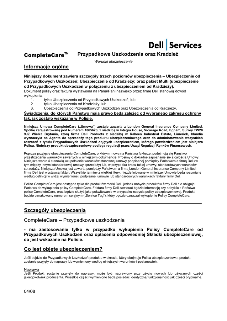 CompleteCare™ Przypadkowe Uszkodzenia oraz Kradzież Warunki ubezpieczenia Informacje ogólne Niniejszy dokument zawiera szczegóły trzech poziomów ubezpieczenia – Ubezpieczenie od Przypadkowych Uszkodzeń; Ubezpieczenie od Kradzieży; oraz pakiet Multi (ubezpieczenie od Przypadkowych Uszkodzeń w połączeniu z ubezpieczeniem od Kradzieży). Dokument polisy oraz faktura wystawiona na Pana/Pani nazwisko przez firmę Dell stanowią dowód wykupienia: 1. tylko Ubezpieczenia od Przypadkowych Uszkodzeń, lub 2. tylko Ubezpieczenia od Kradzieży, lub 3. Ubezpieczenia od Przypadkowych Uszkodzeń oraz Ubezpieczenia od Kradzieży. Świadczenia, do których Państwo mają prawo będą zależeć od wybranego zakresu ochrony tak, jak zostało wskazane w Polisie. Niniejsza Umowa CompleteCare („Umowa”) zostaje zawarta z London General Insurance Company Limited, Spółkę zarejestrowaną pod Numerem 1865673, z siedzibą w Integra House, Vicarage Road, Egham, Surrey TW20 9JZ Wielka Brytania, którą firma Dell Products z siedzibą w Raheen Industrial Estate, Limerick, Irlandia wyznaczyła na Agenta do sprzedaży tego produktu ubezpieczeniowego oraz do administrowania wszystkich roszczeń z tytułu Przypadkowych Uszkodzeń objętych ubezpieczeniem, którego potwierdzeniem jest niniejsza Polisa. Niniejszy produkt ubezpieczeniowy podlega regulacji przez Urząd Regulacji Rynków Finansowych. Poprzez przyjęcie ubezpieczenia CompleteCare, o którym mowa na Państwa fakturze, podejmują się Państwo przestrzegania warunków zawartych w niniejszym dokumencie. Prosimy o dokładne zapoznanie się z całością Umowy. Niniejsze warunki stanowią uzupełnienie warunków stosownej umowy podpisanej pomiędzy Państwem a firmą Dell (w tym między innymi standardowej umowy sprzedaży) lub, w przypadku braku takiej umowy, standardowych warunków sprzedaży. Niniejsza Umowa jest zawarta pomiędzy Państwem a firmą London General Insurance Company Limited; firma Dell jest wystawcą faktur. Wszystkie terminy z wielkiej litery, niezdefiniowane w niniejszej Umowie będą rozumiane według definicji w wyżej wymienionej, podpisanej umowie lub standardowych warunkach faktury firmy Dell. Polisa CompleteCare jest dostępna tylko dla produktów marki Dell, jednak nabycie produktów firmy Dell nie obliguje Państwa do wykupienia polisy CompleteCare. Faktura firmy Dell zawierać będzie informację czy nabyliście Państwo polisę CompleteCare, oraz będzie służyć jako pokwitowanie w przypadku nabycia polisy ubezpieczeniowej. Produkt będzie oznakowany numerem seryjnym („Service Tag”), który będzie oznaczał wykupienie Polisy CompleteCare. Szczegóły ubezpieczenia CompleteCare – Przypadkowe uszkodzenia - ma zastosowanie tylko w przypadku wykupienia Polisy CompleteCare od Przypadkowych Uszkodzeń oraz opłacenia odpowiedniej Składki ubezpieczeniowej, co jest wskazane na Polisie. Co jest objęte ubezpieczeniem? Jeśli dojdzie do Przypadkowych Uszkodzeń produktu w okresie, który obejmuje Polisa ubezpieczeniowa, produkt zostanie przyjęty do naprawy lub wymieniony według niniejszych warunków i postanowień. Naprawa Jeśli Produkt zostanie przyjęty do naprawy, może być naprawiony przy użyciu nowych lub używanych części jakiegokolwiek producenta. Wszelkie części wymienione będą posiadać identyczną funkcjonalność jak części oryginalne. 04/08 Wymiana Jeśli Nasz agent zdecyduje, że należy wymienić Produkt, produkt zamienny będzie posiadał specyfikacje równe lub lepsze w porównaniu z oryginalnym Produktem zakupionym w firmie Dell. Jesli wymiana przedmiotu ubezpieczenia nie jest mozliwa z powodu jego braku w ofercie handlowej, zaproponowac odszkodowanie w formie gotówki w wysokosci wartosci zakupu. mozemy Ubezpieczenie na całym świecie Niniejsza Umowa zapewnia Ubezpieczenie od wszelkich Przypadkowych Uszkodzeń mających miejsce gdziekolwiek na świecie, jednak w przypadku, gdy (i) (ii) wymagana jest naprawa, Produkt będzie jej poddany tylko w następujących krajach: Austrii, Belgii, Czechach, Danii, Finlandii, Francji, Niemiec, Grecji, Irlandii, Włochach, Luksemburgu, Holandii, Norwegii, Polsce, Portugalii, Hiszpanii, Republice Południowej Afryki, Slowacja, Szwecji, Szwajcarii lub Wielkiej Brytanii wymagana jest wymiana, produkt zamienny zostanie dostarczony tylko do jednego z następujących krajów - Austrii, Belgii, Czech, Danii, Finlandii, Francji, Niemiec, Grecji, Irlandii, Włoch, Luksemburgu, Holandii, Norwegii, Polski, Portugalii, Hiszpanii, Republiki Południowej Afryki, Slowacja, Szwecji, Szwajcarii lub Wielkiej Brytanii. W przypadku przebywania w kraju niewymienionym na powyższej liście i sytuacja wymaga zgłoszenia roszczenia, należy skontaktować się z krajem, w którym zakupiony został Produkt lub z krajem przebywania (o ile znajduje się na powyższej liście). Ograniczenia Roszczenia są ograniczone do trzech zatwierdzonych roszczeń tytułem Przypadkowego Uszkodzenia w okresie obowiązywania Polisy. Niniejsza polisa będzie obejmować tylko fizyczny sprzęt komputerowy. Co nie jest objęte ubezpieczeniem Niniejsza Umowa nie obejmuje: 1. Przypadkowych Uszkodzeń urządzeń zewnętrznych takich jak stacje dokujące, modemy zewnętrzne, urządzania do gier, dyski z grami, dodatkowe monitory, zewnętrzne klawiatury i myszy (dla Notebooków lub mobilnych stacji roboczych, nawet, jeżeli były opisane na fakturze jako część kompletu), obudowy, lub przedmioty zakwalifikowane jako „akcesoria” lub „towary konsumpcyjne”, w tym, ale nie wyłączając innych: baterii, żarówek, lamp do rzutników, wymienialnych wkładów od tuszu, papieru do druku i do zdjęć, dysków z pamięcią, urządzeń z pamięcią jednorazowego użytku, pokrowców i toreb, piór typu „stylus”, zewnętrznych głośników, jakichkolwiek innych części/komponentów wymagających regularnego serwisowania przez użytkownika oraz jakiekolwiek inne komponenty komputerowe, które nie 