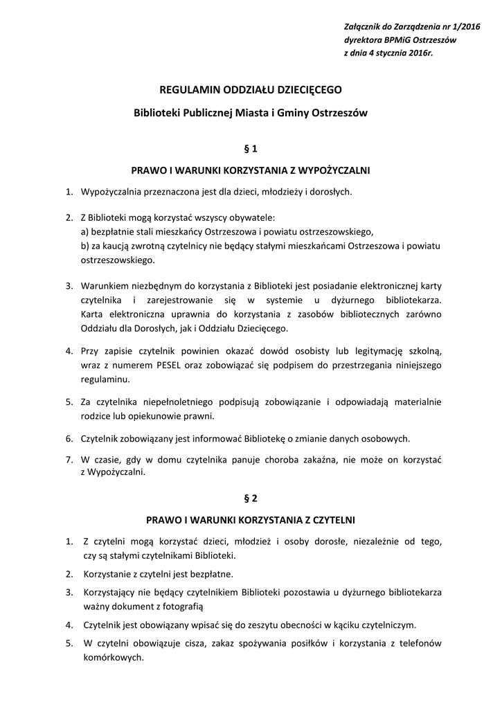 Załącznik do Zarządzenia nr 1/2016 dyrektora BPMiG Ostrzeszów z dnia 4 stycznia 2016r. REGULAMIN ODDZIAŁU DZIECIĘCEGO Biblioteki Publicznej Miasta i Gminy Ostrzeszów §1 PRAWO I WARUNKI KORZYSTANIA Z WYPOŻYCZALNI 1. Wypożyczalnia przeznaczona jest dla dzieci, młodzieży i dorosłych. 2. Z Biblioteki mogą korzystać wszyscy obywatele: a) bezpłatnie stali mieszkańcy Ostrzeszowa i powiatu ostrzeszowskiego, b) za kaucją zwrotną czytelnicy nie będący stałymi mieszkańcami Ostrzeszowa i powiatu ostrzeszowskiego. 3. Warunkiem niezbędnym do korzystania z Biblioteki jest posiadanie elektronicznej karty czytelnika i zarejestrowanie się w systemie u dyżurnego bibliotekarza. Karta elektroniczna uprawnia do korzystania z zasobów bibliotecznych zarówno Oddziału dla Dorosłych, jak i Oddziału Dziecięcego. 4. Przy zapisie czytelnik powinien okazać dowód osobisty lub legitymację szkolną, wraz z numerem PESEL oraz zobowiązać się podpisem do przestrzegania niniejszego regulaminu. 5. Za czytelnika niepełnoletniego podpisują zobowiązanie i odpowiadają materialnie rodzice lub opiekunowie prawni. 6. Czytelnik zobowiązany jest informować Bibliotekę o zmianie danych osobowych. 7. W czasie, gdy w domu czytelnika panuje choroba zakaźna, nie może on korzystać z Wypożyczalni. §2 PRAWO I WARUNKI KORZYSTANIA Z CZYTELNI 1. Z czytelni mogą korzystać dzieci, młodzież i osoby dorosłe, niezależnie od tego, czy są stałymi czytelnikami Biblioteki. 2. Korzystanie z czytelni jest bezpłatne. 3. Korzystający nie będący czytelnikiem Biblioteki pozostawia u dyżurnego bibliotekarza ważny dokument z fotografią 4. Czytelnik jest obowiązany wpisać się do zeszytu obecności w kąciku czytelniczym. 5. W czytelni obowiązuje cisza, zakaz spożywania posiłków i korzystania z telefonów komórkowych. 6. W czytelni można korzystać z księgozbioru podręcznego oraz całego dostępnego księgozbioru wypożyczalni oddziału dziecięcego. 7. Korzystający może wybrać samodzielnie interesujący go materiał biblioteczny lub skorzystać z pomocy bibliotekarza. Wybrane materiały korzystający oddaje bibliotekarzowi w celu dokonania ewidencji udostępnień. 8. Z księgozbioru podręcznego korzysta się tylko na miejscu, w siedzibie Biblioteki. 9. W uzasadnionych przypadkach bibliotekarz może wypożyczyć książkę z księgozbioru podręcznego. Termin i warunki wypożyczenia określa każdorazowo bibliotekarz. 10. Przed opuszczeniem czytelni czytelnik zwraca książki i otrzymuje pozostawiony dokument. 11. W czasie, gdy w domu czytelnika panuje choroba zakaźna, nie może on korzystać z czytelni. §3 WYPOŻYCZENIA ZBIORÓW BIBLIOTECZNYCH 1. Przy wypożyczaniu książek, czytelnik zobowiązany jest do okazania elektronicznej karty czytelnika. W razie zagubienia lub zniszczenia karty czytelnik otrzymuje duplikat, za który uiszcza opłatę w wysokości 10 zł. 2. Karta nie może być udostępniana innym osobom. Udostępnienie karty bibliotecznej innej osobie jest równoznaczne z wzięciem przez właściciela karty odpowiedzialności za wypożyczone na nią materiały. 3. Udostępnienie karty bibliotecznej innej osobie jest równoznaczne z wzięciem przez właściciela karty odpowiedzialności za wypożyczone na nią materiały. 4. Jednorazowo można wypożyczyć 7 książek na okres 30 dni kalendarzowych. 5. Biblioteka może przedłużyć o kolejne 30 dni kalendarzowych termin zwrotu książek, jeśli nie ma zapotrzebowania ze strony innych czytelników (nie zostały zamówione). Prolongaty wypożyczeń dokonuje się osobiście, telefonicznie lub drogą internetową. 6. Biblioteka może zażądać zwrotu książek, jeśli stanowią one szczególnie poszukiwane pozycje, przed upływem terminu ustalonego w §2 pkt. 4 i 5. 7. Na prośbę czytelnika Biblioteka może zarezerwować materiały biblioteczne na okres 7 dni kalendarzowych. W przypadku nieodebrania materiałów bibliotecznych, po upływie tego okresu wracają one na półkę lub przechodzą na konto kolejnego zamawiającego. 8. Czytelnik może zamówić materiały biblioteczne, które aktualnie znajdują się w wypożyczeniu. 9. Wybrane książki czytelnik rejestruje u bibliotekarza. Jemu też zwraca wypożyczone książki. 10. Od czytelników nie będących stałymi mieszkańcami Ostrzeszowa i powiatu ostrzeszowskiego pobiera się kaucję w wysokości 20,00 zł. Przy wypożyczeniu szczególnie cennych książek wysokość kaucji ustala bibliotekarz. 11. Kaucja jest zwracana z chwilą oddania książki. Po upływie roku od zaprzestania korzystania z Biblioteki, kaucje nieodebrane przechodzą na rzecz Biblioteki z przeznaczeniem na zakup zbiorów bibliotecznych. §4 PRZETRZYMYWANIE KSIĄŻEK 1. Za przetrzymanie książek ponad terminy określone w § 2 pkt 2 i 3, pobiera się opłatę karną: 1) I upomnienie – 3,00 zł, 2) II upomnienie – 4,00 zł, 3) III upomnienie – 5,00 zł, 4) IV upomnienie – 7,00 zł, 5) powiadomienie V za potwierdzeniem odbioru – 9,00 zł + koszty opłaty pocztowej. 2. Koszty kolejnych upomnień ulegają sumowaniu. Biblioteka wysyła upomnienia cztery razy w roku. 3. Jeżeli czytelnik mimo upomnień wysłanych przez Bibliotekę odmawia zwrotu książek lub uiszczenia należnych opłat Biblioteka dochodzi swoich roszczeń zgodnie z przepisami prawa. 4. Z Biblioteki mogą korzystać tylko czytelnicy stosujący się do postanowień regulaminu. §5 POSZANOWANIE KSIĄŻEK 1. Czytelnik winien szanować wypożyczone książki. 2. Czytelnik i bibliotekarz powinni zwrócić uwagę na stan książki przed jej wypożyczeniem. 3. Obowiązkiem czytelnika jest zgłoszenie bibliotekarzowi przy zwrocie książki dostrzeżonych przez niego braków i uszkodzeń. 4. Za szkody wynikłe z zagubienia, uszkodzenia lub zniszczenia materiałów bibliotecznych odpowiada czytelnik. 5. Czytelnik zobowiązany jest odkupić zagubioną, zniszczoną lub uszkodzoną książkę. W zamian za odkupienie zagubionej książki czy