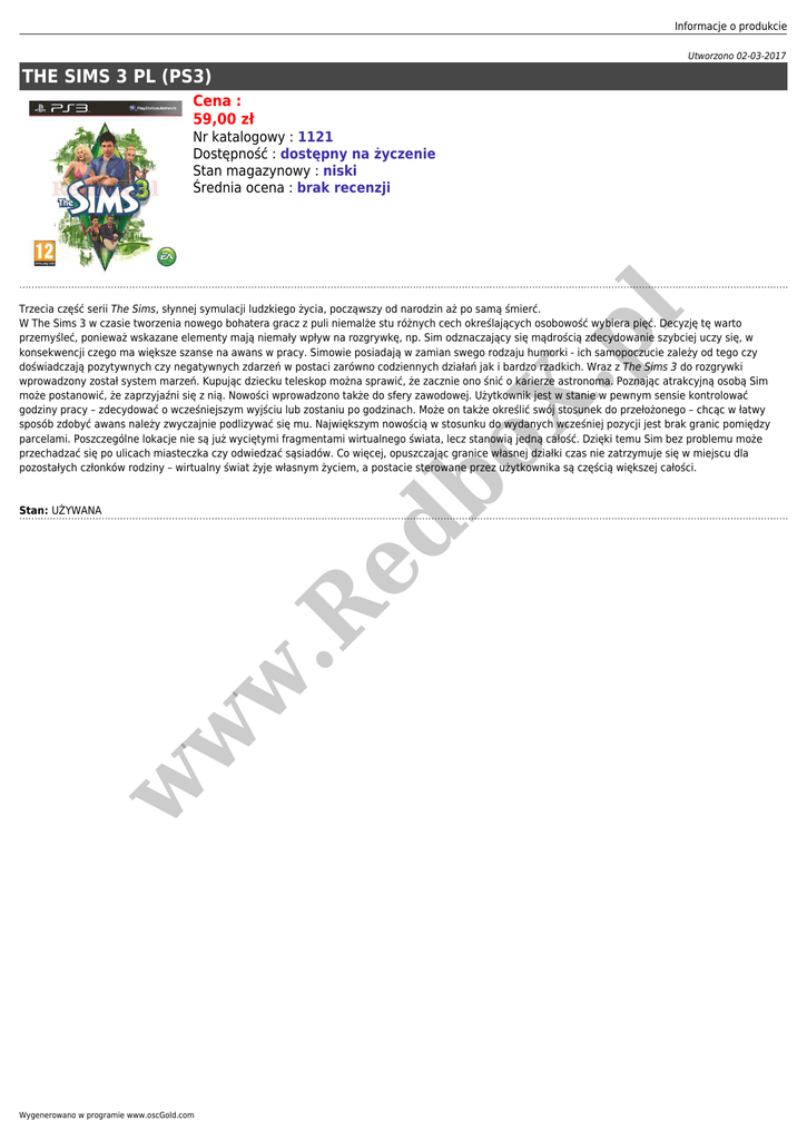 Informacje o produkcie Utworzono 02-03-2017 THE SIMS 3 PL (PS3) Cena : 59,00 zł Nr katalogowy : 1121 Dostępność : dostępny na życzenie Stan magazynowy : niski Średnia ocena : brak recenzji ed b oX .p l Trzecia część serii The Sims, słynnej symulacji ludzkiego życia, począwszy od narodzin aż po samą śmierć. W The Sims 3 w czasie tworzenia nowego bohatera gracz z puli niemalże stu różnych cech określających osobowość wybiera pięć. Decyzję tę warto przemyśleć, ponieważ wskazane elementy mają niemały wpływ na rozgrywkę, np. Sim odznaczający się mądrością zdecydowanie szybciej uczy się, w konsekwencji czego ma większe szanse na awans w pracy. Simowie posiadają w zamian swego rodzaju humorki - ich samopoczucie zależy od tego czy doświadczają pozytywnych czy negatywnych zdarzeń w postaci zarówno codziennych działań jak i bardzo rzadkich. Wraz z The Sims 3 do rozgrywki wprowadzony został system marzeń. Kupując dziecku teleskop można sprawić, że zacznie ono śnić o karierze astronoma. Poznając atrakcyjną osobą Sim może postanowić, że zaprzyjaźni się z nią. Nowości wprowadzono także do sfery zawodowej. Użytkownik jest w stanie w pewnym sensie kontrolować godziny pracy – zdecydować o wcześniejszym wyjściu lub zostaniu po godzinach. Może on także określić swój stosunek do przełożonego – chcąc w łatwy sposób zdobyć awans należy zwyczajnie podlizywać się mu. Największym nowością w stosunku do wydanych wcześniej pozycji jest brak granic pomiędzy parcelami. Poszczególne lokacje nie są już wyciętymi fragmentami wirtualnego świata, lecz stanowią jedną całość. Dzięki temu Sim bez problemu może przechadzać się po ulicach miasteczka czy odwiedzać sąsiadów. Co więcej, opuszczając granice własnej działki czas nie zatrzymuje się w miejscu dla pozostałych członków rodziny – wirtualny świat żyje własnym życiem, a postacie sterowane przez użytkownika są częścią większej całości. w w w .R Stan: UŻYWANA Wygenerowano w programie www.oscGold.com