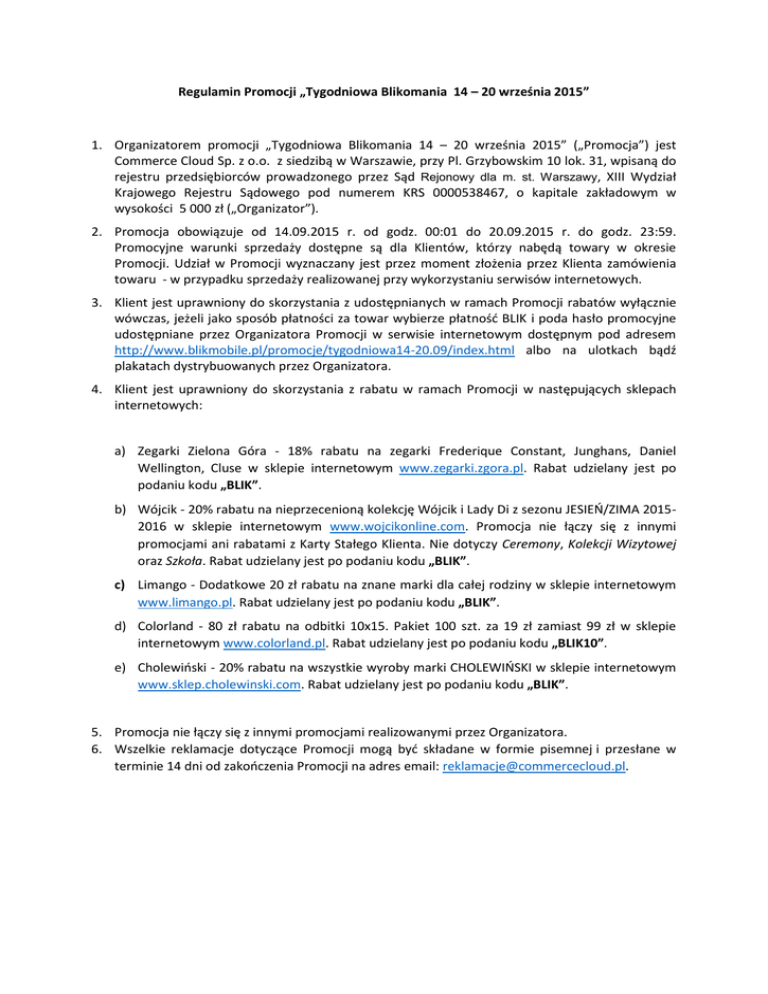 Regulamin Promocji „Tygodniowa Blikomania 14 – 20 września 2015” 1. Organizatorem promocji „Tygodniowa Blikomania 14 – 20 września 2015” („Promocja”) jest Commerce Cloud Sp. z o.o. z siedzibą w Warszawie, przy Pl. Grzybowskim 10 lok. 31, wpisaną do rejestru przedsiębiorców prowadzonego przez Sąd Rejonowy dla m. st. Warszawy, XIII Wydział Krajowego Rejestru Sądowego pod numerem KRS 0000538467, o kapitale zakładowym w wysokości 5 000 zł („Organizator”). 2. Promocja obowiązuje od 14.09.2015 r. od godz. 00:01 do 20.09.2015 r. do godz. 23:59. Promocyjne warunki sprzedaży dostępne są dla Klientów, którzy nabędą towary w okresie Promocji. Udział w Promocji wyznaczany jest przez moment złożenia przez Klienta zamówienia towaru - w przypadku sprzedaży realizowanej przy wykorzystaniu serwisów internetowych. 3. Klient jest uprawniony do skorzystania z udostępnianych w ramach Promocji rabatów wyłącznie wówczas, jeżeli jako sposób płatności za towar wybierze płatność BLIK i poda hasło promocyjne udostępniane przez Organizatora Promocji w serwisie internetowym dostępnym pod adresem http://www.blikmobile.pl/promocje/tygodniowa14-20.09/index.html albo na ulotkach bądź plakatach dystrybuowanych przez Organizatora. 4. Klient jest uprawniony do skorzystania z rabatu w ramach Promocji w następujących sklepach internetowych: a) Zegarki Zielona Góra - 18% rabatu na zegarki Frederique Constant, Junghans, Daniel Wellington, Cluse w sklepie internetowym www.zegarki.zgora.pl. Rabat udzielany jest po podaniu kodu „BLIK”. b) Wójcik - 20% rabatu na nieprzecenioną kolekcję Wójcik i Lady Di z sezonu JESIEŃ/ZIMA 20152016 w sklepie internetowym www.wojcikonline.com. Promocja nie łączy się z innymi promocjami ani rabatami z Karty Stałego Klienta. Nie dotyczy Ceremony, Kolekcji Wizytowej oraz Szkoła. Rabat udzielany jest po podaniu kodu „BLIK”. c) Limango - Dodatkowe 20 zł rabatu na znane marki dla całej rodziny w sklepie internetowym www.limango.pl. Rabat udzielany jest po podaniu kodu „BLIK”. d) Colorland - 80 zł rabatu na odbitki 10x15. Pakiet 100 szt. za 19 zł zamiast 99 zł w sklepie internetowym www.colorland.pl. Rabat udzielany jest po podaniu kodu „BLIK10”. e) Cholewiński - 20% rabatu na wszystkie wyroby marki CHOLEWIŃSKI w sklepie internetowym www.sklep.cholewinski.com. Rabat udzielany jest po podaniu kodu „BLIK”. 5. Promocja nie łączy się z innymi promocjami realizowanymi przez Organizatora. 6. Wszelkie reklamacje dotyczące Promocji mogą być składane w formie pisemnej i przesłane w terminie 14 dni od zakończenia Promocji na adres email: [email protected].