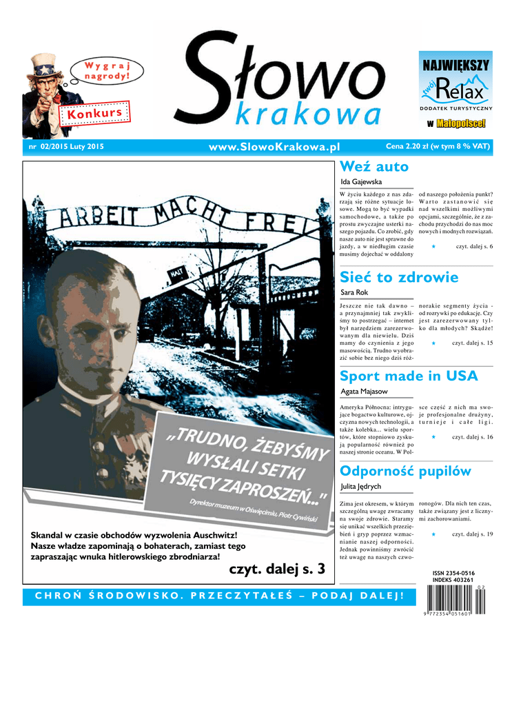 Słowo numeru str 1 NAJWIĘKSZY Konkurs nr 02/2015 Luty 2015 D o dat e k T u ry s t yc z n y w Małopolsce! www.SlowoKrakowa.pl Cena 2.20 zł (w tym 8 % VAT) Weź auto Ida Gajewska W życiu każdego z nas zdarzają się różne sytuacje losowe. Mogą to być wypadki samochodowe, a także po prostu zwyczajne usterki naszego pojazdu. Co zrobić, gdy nasze auto nie jest sprawne do jazdy, a w niedługim czasie musimy dojechać w oddalony od naszego położenia punkt? Warto zastanowić się nad wszelkimi możliwymi opcjami, szczególnie, że z zachodu przychodzi do nas moc nowych i modnych rozwiązań. czyt. dalej s. 6 Sieć to zdrowie Sara Rok Jeszcze nie tak dawno – a przynajmniej tak zwykliśmy to postrzegać – internet był narzędziem zarezerwowanym dla niewielu. Dziś mamy do czynienia z jego masowością. Trudno wyobrazić sobie bez niego dziś róż- norakie segmenty życia od rozrywki po edukację. Czy jest zarezerwowany tylko dla młodych? Skądże! czyt. dalej s. 15 Sport made in USA Agata Majasow Ameryka Północna: intrygu- sce część z nich ma swojące bogactwo kulturowe, oj- je profesjonalne drużyny, czyzna nowych technologii, a t u r n i e j e i c a ł e l i g i . także kolebka... wielu sporczyt. dalej s. 16 tów, które stopniowo zyskują popularność również po naszej stronie oceanu. W Pol- Odporność pupilów Julita Jędrych Skandal w czasie obchodów wyzwolenia Auschwitz! Nasze władze zapominają o bohaterach, zamiast tego zapraszając wnuka hitlerowskiego zbrodniarza! czyt. dalej s. 3 Zima jest okresem, w którym ronogów. Dla nich ten czas, szczególną uwagę zwracamy także związany jest z licznyna swoje zdrowie. Staramy mi zachorowaniami. się unikać wszelkich przezięczyt. dalej s. 19 bień i gryp poprzez wzmacnianie naszej odporności. Jednak powinniśmy zwrócić też uwagę na naszych czwo- C H R O Ń Ś R O D OW I S KO. P R Z E C Z Y TA Ł E Ś – P O DA J DA L E J ! Słowo Krakowa Gazeta lokalna ISSN 2354-0516 INDEKS 403261 czwartek, 24 marca 2011 Wstępniak Spis treści str 2 Luty Obchody ze skandalami w tle Temat numeru Marcin Bartnicki - Obchody ze skandalami w tle - s. 2 Marcin Bartnicki Co się działo W Krakowie – s. 4 W Polsce – s. 5 W Gospodarce – s.5 Za nami uroczystości z okazji siedemdziesiątej rocznicy wyzwolenia obozu KL „Auschwitz”, które dokonało się 27 stycznia 1945 r. „Okrągła” rocznica to zawsze okazja do sporego ceremoniału i zapraszania licznych zagranicznych gości. Tak było i tym razem. Motoryzacja Ida Gajewska – Weź auto – s. 6 Publicystyka Marek Natusiewicz – Dlaczego nam się nie udaje? Twój Relax Karolina Kowalska – Serki i oscypki – s. 11 Sara Rok – Zima i polskie góry – s. 12 Sara Rok – Karkonoski czar – s. 14 Tego dnia w Oświęcimiu obecnych było pięćdziesięciu przedstawicieli różnych państw – w tym prezydenci Francji, Niemiec, Polski, Litwy oraz Ukrainy. Wszystko to, by wspomnieć gehennę, jaka rozegrała się w tym miejscu przed kilkoma dekadami, kiedy niemiecki okupant, który we wrześniu 1939 r. napadł na Polskę, założył tutaj obóz koncentracyjny w roku 1940. Pierwotnie przeznaczony był on dla Sport Agata Majasow – Sport made in USA – s. 16 Twój Dom Marian Bąk – Okienne Wizje – s. 17 Styl Życia Marcin Bartnicki – Niezależność – s. 18 Agata Kuczmaszewska – Hobby dla dużych chłopców – s. 18 Agata Bobrowska – Walentynkowy czar miłości – s. 19 Sara Rok – Weselny klimat – s. 22 skalę. Tym bardziej szkoda, że wobec pamięci o wielkiej tragedii nie potrafią zachować stosownej postawy. Ochotnik Pamięć o tej postaci jest wśród Polaków coraz bardziej żywa – i całe szczęście, bo naprawdę mamy z kogo być dumni. Od kilku lat organizowane są nawet w naszym kraju oddolne marsze pamięci jego imienia. Chodzi oczywiście o rotmistrza Witold Pileckiego – postać legendarną REKLAMA Będzie się działo luty/marzec 2014 - s. 22 - 23 Polaków, natomiast dwa lata później założono drugą część „kompleksu śmierci” – „Auschwitz – Bierkenau”, który zorganizowano z myślą o zagładzie Żydów. Badania są różnorodne, natomiast obecnie zwykło się przyjmować, że w obozie życie straciło ok. 1,1 mln osób, w tym m.in. Żydzi, Polacy, Romowie oraz jeńcy z Armii Czerwonej. Miejsce to było świadkiem hekatomby na nieznaną wcześniej Dziwnie i dziwniej Mikołaj Kamiński Nowy rok rozpoczął się już na dobre. Mając nadzieję, że noworoczne postanowienia, które stały się Państwa celem AD 2015, nie zostały już ostatecznie zarzucone, poddaję Czytelnikom pod uwagę najnowszy numer naszego Słowa Krakowa, w którym jak zwykle moc interesujących treści. Oby dostarczyły one zarówno rozrywki, jak i pożytecznej wiedzy. W skali ogólnopolskiej styczeń upłynął pod znakiem strajku górników na Górnym Śląsku, ale także w Małopolsce. Wszystko zaczęło się od ogłoszenia specjalnego planu „naprawczego” rządu Ewy Kopacz dla Kompanii Węglowej. Restrukturyzacja katowickiego holdingu miałaby wiązać się m.in. z likwidacją 4 kopalń – w Brzeszczach, Zabrzu-Gliwicach, Bytomiu i Rudzie Śląskiej. Taki rządowy plan spowodował gwałtowną reakcję. W kopalniach rozpoczęto podziemne strajki, zakończone uzgodnieniem planu porozumienia ze związkami. No cóż… Na tym etapie wszyscy są zadowoleni – tylko na jak długo? A skoro premier Kopacz odesłała Polaków „na skoki”, to wydaje się, że właśnie tam nasi rodacy znaleźli ukojenie dla swoich codziennych problemów. Duma polskiego sportu, dwukrotny medalista Igrzysk Olimpijskich w Soczi, Kamil Stoch, nie zawiódł zgromadzonych przed telewizorami i pod Wielka Krokwią, odnosząc kolejne wspaniałe zwycięstwo. A więc już wszystko w porządku! Pani Ewa poleciła skoki, a tam Polacy odnoszą ciągłe sukcesy, więc o co ten cały hałas? Po co to ciągłe podpalanie Polski? Pod względem polityczno-celebryckim hitem os