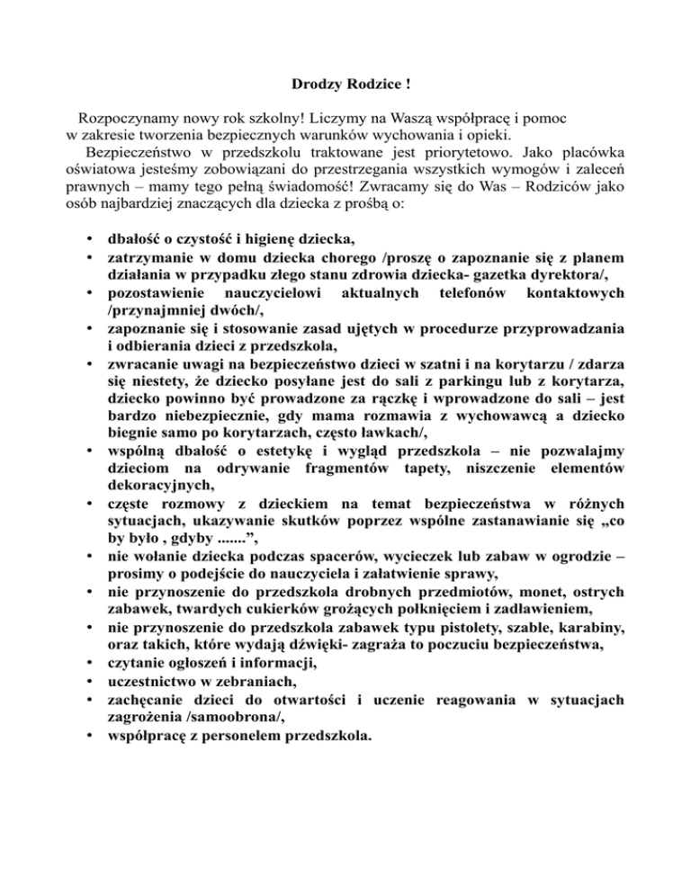 Drodzy Rodzice ! Rozpoczynamy nowy rok szkolny! Liczymy na Waszą współpracę i pomoc w zakresie tworzenia bezpiecznych warunków wychowania i opieki. Bezpieczeństwo w przedszkolu traktowane jest priorytetowo. Jako placówka oświatowa jesteśmy zobowiązani do przestrzegania wszystkich wymogów i zaleceń prawnych – mamy tego pełną świadomość! Zwracamy się do Was – Rodziców jako osób najbardziej znaczących dla dziecka z prośbą o: • dbałość o czystość i higienę dziecka, • zatrzymanie w domu dziecka chorego /proszę o zapoznanie się z planem działania w przypadku złego stanu zdrowia dziecka- gazetka dyrektora/, • pozostawienie nauczycielowi aktualnych telefonów kontaktowych /przynajmniej dwóch/, • zapoznanie się i stosowanie zasad ujętych w procedurze przyprowadzania i odbierania dzieci z przedszkola, • zwracanie uwagi na bezpieczeństwo dzieci w szatni i na korytarzu / zdarza się niestety, że dziecko posyłane jest do sali z parkingu lub z korytarza, dziecko powinno być prowadzone za rączkę i wprowadzone do sali – jest bardzo niebezpiecznie, gdy mama rozmawia z wychowawcą a dziecko biegnie samo po korytarzach, często ławkach/, • wspólną dbałość o estetykę i wygląd przedszkola – nie pozwalajmy dzieciom na odrywanie fragmentów tapety, niszczenie elementów dekoracyjnych, • częste rozmowy z dzieckiem na temat bezpieczeństwa w różnych sytuacjach, ukazywanie skutków poprzez wspólne zastanawianie się „co by było , gdyby .......”, • nie wołanie dziecka podczas spacerów, wycieczek lub zabaw w ogrodzie – prosimy o podejście do nauczyciela i załatwienie sprawy, • nie przynoszenie do przedszkola drobnych przedmiotów, monet, ostrych zabawek, twardych cukierków grożących połknięciem i zadławieniem, • nie przynoszenie do przedszkola zabawek typu pistolety, szable, karabiny, oraz takich, które wydają dźwięki- zagraża to poczuciu bezpieczeństwa, • czytanie ogłoszeń i informacji, • uczestnictwo w zebraniach, • zachęcanie dzieci do otwartości i uczenie reagowania w sytuacjach zagrożenia /samoobrona/, • współpracę z personelem przedszkola.
