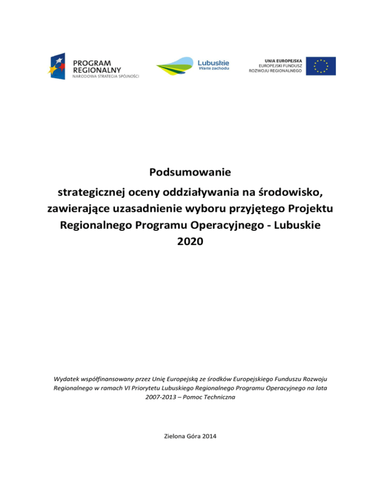 Podsumowanie strategicznej oceny oddziaływania na środowisko, zawierające uzasadnienie wyboru przyjętego Projektu Regionalnego Programu Operacyjnego - Lubuskie 2020 Wydatek współfinansowany przez Unię Europejską ze środków Europejskiego Funduszu Rozwoju Regionalnego w ramach VI Priorytetu Lubuskiego Regionalnego Programu Operacyjnego na lata 2007-2013 – Pomoc Techniczna Zielona Góra 2014 Zespół autorski: mgr inż. Karolina Gwizdak mgr Marta Jamontt-Skotis ATMOTERM® S.A. Inteligentne rozwiązania, aby chronić środowisko Podsumowanie strategicznej oceny oddziaływania na środowisko, zawierające uzasadnienie wyboru przyjętego dokumentu Regionalnego Programu Operacyjnego Lubuskie 2020 SPIS TREŚCI 1. Wstęp................................................................................................................................................4 2. Ramowy przebieg strategicznej oceny oddziaływania na środowisko .............................................4 3. Uzgodnienie stopnia szczegółowości informacji zawartych w prognozie ........................................4 4. Sporządzenie prognozy oddziaływania na środowisko ....................................................................5 5. Uzyskanie wymaganych opinii ..........................................................................................................5 6. Zapewnienie udziału społeczeństwa w opiniowaniu........................................................................5 7. Podsumowanie i wnioski z przebiegu postępowania w sprawie strategicznej oceny oddziaływania na środowisko ...................................................................................................................................6 7.1 Ustalenia zawarte w prognozie oddziaływania na środowisko ........................................................6 7.2 Zgłoszone uwagi i wnioski ................................................................................................................7 8. Wyniki postępowania dotyczącego transgranicznego oddziaływania na środowisko ...................15 9. Propozycje dotyczące metod i częstotliwości przeprowadzania monitoringu skutków realizacji postanowień dokumentu ...............................................................................................................15 10. Uzasadnienie wyboru przyjętego dokumentu w odniesieniu do rozpatrywanych rozwiązań alternatywnych ...............................................................................................................................16 3 Podsumowanie strategicznej oceny oddziaływania na środowisko, zawierające uzasadnienie wyboru przyjętego dokumentu Regionalnego Programu Operacyjnego Lubuskie 2020 1. WSTĘP Podstawę prawną do przeprowadzenia strategicznej oceny oddziaływania na środowisko stanowią dyrektywa nr 2001/42/WE Parlamentu Europejskiego i rady z dnia 27 czerwca 2001 r. w sprawie oceny wpływu niektórych planów i programów na środowisko (Dz. Urz. WE L 197 z 21.7.2001, str. 30—37)oraz ; ustawa z dnia 3 października 2008 r. o udostępnianiu informacji o środowisku i jego ochronie, udziale społeczeństwa w ochronie środowiska oraz o ocenach oddziaływania na środowisko (Dz. U. z 2013 r., poz. 1235). Zgodnie z art. 55 ust. 3 ww. ustawy do przyjętego dokumentu załącza się pisemne podsumowanie zawierające uzasadnienie wyboru przyjętego dokumentu w odniesieniu do rozpatrywanych rozwiązań alternatywnych, a także informację, w jaki sposób zostały wzięte pod uwagę i w jakim zakresie zostały uwzględnione: ustalenia zawarte w prognozie oddziaływania na środowisko; opinie właściwych organów (Regionalnego Dyrektora Ochrony Środowiska oraz Państwowego Wojewódzkiego Inspektora Sanitarnego); zgłoszone uwagi i wnioski; wyniki postępowania dotyczącego transgranicznego oddziaływania na środowisko, jeżeli zostało przeprowadzone; propozycje dotyczące metod i częstotliwości przeprowadzania monitoringu skutków realizacji postanowień dokumentu. Przedmiotem oceny oddziaływania na środowisko był projekt Regionalnego Programu Operacyjnego Lubuskie 2020 (dalej: RPO Lubuskie 2020), którego przygotowanie wynika z art. 18 pkt 2 ustawy o zasadach prowadzenia polityki i rozwoju (Dz. U. 2009 r. Nr 84, poz. 712 z późn. zm.), i który swym zakresem obejmuje wsparcie finansowane z Europejskiego Funduszu Rozwoju Regionalnego oraz Europejskiego Funduszu Społecznego. 2. RAMOWY PRZEBIEG STRATEGICZNEJ OCENY ODDZIAŁYWANIA NA ŚRODOWISKO Postępowanie w sprawie strategicznej oceny oddziaływania na środowisko przebiegało w czterech etapach: uzgodnienie stopnia szczegółowości informacji zawartych w prognozie oddziaływania na środowisko, sporządzenie prognozy oddziaływania na środowisko, uzyskanie wymaganych opinii oraz zapewnienie udziału społeczeństwa w opiniowaniu. 3. UZGODNIENIE STOPNIA SZCZEGÓŁOWOŚCI INFORMACJI ZAWARTYCH W PROGNOZIE W dniu 24 kwietnia 2013 r. Urząd Marszałkowski Województwa Lubuskiego w Zielonej Górze wystąpił do Regionalnego Dyrektora Ochrony Środowiska w Gorzowie Wielkopolskim oraz do Lubuskiego Państwowego Wojewódzkiego Inspektora Sanitarnego w Gorzowie Wielkopolskim o uzgodnienie 4 Podsumowanie strategicznej oceny oddziaływania na środowisko, zawierające uzasadnienie wyboru przyjętego dokumentu Regionalnego Programu Operacyjnego Lubuskie 2020 zakresu i stopnia szczegółowości informacji zawartych w prognozie oddziaływania na środowisko sporządzanej dla projektu RPO Lubuskie 2020. 4. SPORZĄDZENIE PROGNOZY ODDZIAŁYWANIA NA ŚRODOWISKO W lutym 2014 r. przystąpiono do opracowania prognozy oddziaływania na środowisko projektu RPO Lubuskie 2020. Opracowaniu Prognozy towarzyszyło 1 spotkanie z ewaluatorem ex-ante w celu uspójnienia wniosków i rekomendacji. 5. UZYSKANIE WYMAGANYCH OPINII Zgodnie z art. 54. ust. 1 ww. ustawy Urząd Marszałkowski Województwa Lubuskiego poddał projekt RPO Lubus