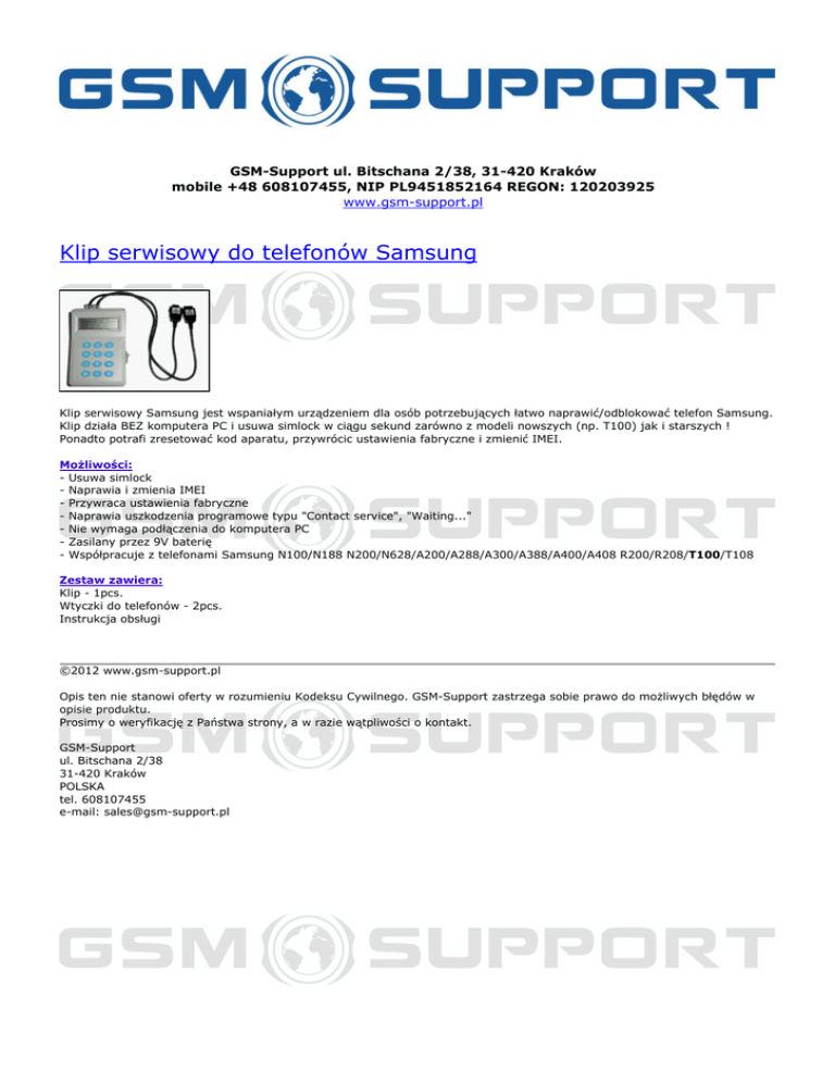 GSM-Support ul. Bitschana 2/38, 31-420 Kraków mobile +48 608107455, NIP PL9451852164 REGON: 120203925 www.gsm-support.pl Klip serwisowy do telefonów Samsung Klip serwisowy Samsung jest wspaniałym urządzeniem dla osób potrzebujących łatwo naprawić/odblokować telefon Samsung. Klip działa BEZ komputera PC i usuwa simlock w ciągu sekund zarówno z modeli nowszych (np. T100) jak i starszych ! Ponadto potrafi zresetować kod aparatu, przywrócic ustawienia fabryczne i zmienić IMEI. Możliwości: - Usuwa simlock - Naprawia i zmienia IMEI - Przywraca ustawienia fabryczne - Naprawia uszkodzenia programowe typu "Contact service", "Waiting..." - Nie wymaga podłączenia do komputera PC - Zasilany przez 9V baterię - Współpracuje z telefonami Samsung N100/N188 N200/N628/A200/A288/A300/A388/A400/A408 R200/R208/T100/T108 Zestaw zawiera: Klip - 1pcs. Wtyczki do telefonów - 2pcs. Instrukcja obsługi ©2012 www.gsm-support.pl Opis ten nie stanowi oferty w rozumieniu Kodeksu Cywilnego. GSM-Support zastrzega sobie prawo do możliwych błędów w opisie produktu. Prosimy o weryfikację z Państwa strony, a w razie wątpliwości o kontakt. GSM-Support ul. Bitschana 2/38 31-420 Kraków POLSKA tel. 608107455 e-mail: [email protected] Powered by TCPDF (www.tcpdf.org)