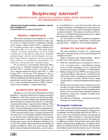 INFORMACJE § OPINIE § PROPOZYCJE 1/2013 Bezpieczny internet? ZABEZPIECZANIE SZKOLNYCH KOMPUTERÓW PRZED DOSTÊPEM DO NIEPO¯¥DANYCH TRECI Wzmacnianie bezpieczeñstwa w szko³ach i placówkach owiatowych Priorytet MEN na rok szkolny 2012/2013 PRAWO i OBOWI¥ZEK Obowi¹zek zabezpieczenia komputerów w szkole przed dostêpem do niebezpiecznych treci wynika z art. 4a. ustawy o systemie owiaty ze zmianami wynikaj¹cymi z ustawy z dnia 19 marca 2009 r. o zmianie ustawy o systemie owiaty oraz o zmianie niektórych innych ustaw (Dz. U. nr 56, poz. 458), który brzmi: Szko³y i placówki zapewniaj¹ce uczniom dostêp do Internetu s¹ obowi¹zane podejmowaæ dzia³ania zabezpieczaj¹ce uczniów przed dostêpem do treci, które mog¹ stanowiæ zagro¿enie dla ich prawid³owego rozwoju, w szczególnoci zainstalowaæ i aktualizowaæ oprogramowanie zabezpieczaj¹ce. Po raz pierwszy wprowadzono obowi¹zek filtrowania treci w szkolnych komputerach ustaw¹ z 11 kwietnia 2007 r. o zmianie ustawy o systemie owiaty oraz o zmianie niektórych innych ustaw (Dz. U. z dnia 9 maja 2007 r., Nr 80, poz. 542). Zapisano w niej, ¿e Rada Ministrów okreli katalog szkodliwych treci, a Ministerstwo Edukacji Narodowej dostarczy szko³om oprogramowanie umo¿liwiaj¹ce skuteczne filtrowanie treci w wielu systemach operacyjnych. MEN wybra³o wtedy jeszcze bezp³atny program Beniamin. K£OPOTLIWY BENIAMIN Okaza³o siê, ¿e u¿ytkowanie Beniamina by³o doæ k³opotliwe. Nale¿a³o zainstalowaæ program na ka¿dym komputerze. Doæ ³atwo uczniowie usuwali jego pliki, co z kolei powodowa³o zablokowanie dzia³ania przegl¹darki internetowej i koniecznoæ naprawy systemu operacyjnego lub prociej jego ponown¹ instalacjê. W tej walce nauczyciel, czy te¿ administrator sieci, byli bez szans. Z czasem Beniamin przesta³ byæ programem bezp³atnym! Niezmiennie jednak ustawa o systemie owiaty z 2009 roku utrzymuje ci¹¿¹cy na szkole obowi¹zek filtrowania treci, nie wskazuj¹c podmiotu zobowi¹zanego do dostarczenia szko³om gotowego rozwi¹zania (oprogramowania). Nadal popularne s¹ programy zabezpieczaj¹ce stacje robocze: Beniamin, Opiekun, Cenzor, itd. Ich wspóln¹ wad¹ jest koniecznoæ instalacji na ka¿dym komputerze. Poza tym, je¿eli chcemy dodaæ jak¹ witrynê do bia³ej lub czarnej listy, znowu koniecz- 48 ne s¹ modyfikacje we wszystkich stacjach roboczych w szkole. Programy te obs³uguj¹ tylko system operacyjny Windows i nie dzia³aj¹, je¿eli uruchomimy komputer z pendrive lub p³yty. Nie mamy te¿ mo¿liwoci filtrownia treci w urz¹dzeniach przy³¹czanych do sieci, takich jak: notebooki, tablety, smartfony. Nie ma obecnie na rynku bezp³atnych programów filtruj¹cych treci tego typu, a odnawianie co roku licencji generuje koszty rednio ok. 30 z³ na ka¿dy komputer. POMOCNY DANSGUARDIAN Jak zatem najlepiej wywi¹zaæ siê z ustawowego obowi¹zku zabezpieczenia uczniów przed dostêpem do szkodliwych treci? Takie rozwi¹zanie daje DansGuardian darmowy filtr treci. Najwa¿niejsze cechy programu: · Musi byæ zainstalowany na komputerze serwerowym z systemem Linux, a jego filtracja rozci¹ga siê na wszystkie komputery w sieci, niezale¿nie od systemu operacyjnego (Windows czy Macintosh). · Blokuje dostêp do stron WWW zawieraj¹cych treci pornograficzne, obsceniczne, rasistowskie itp. Filtrowanie odbywa siê poprzez przeszukanie tekstu zawartego na stronie. Mo¿na tworzyæ grupy u¿ytkowników z ró¿nymi kategoriami blokowanych stron. · Filtruje treci niezale¿nie od u¿ywanego przez u¿ytkownika systemu operacyjnego oraz przegl¹darki internetowej. Filtr instaluje siê tylko na jednym komputerze, serwerze ustawionym pomiêdzy bram¹ internetow¹ a reszt¹ sieci, chroni¹c wszystkie komputery uczniowskie. · Jest ca³kowicie bezp³atny zarówno do u¿ytku domowego, jak i komercyjnego. Wymagania techniczne Do zainstalowania DansGuardiana nie potrzebujemy bardzo zaawansowanego komputera. Regenerowane jednostki centralne dostêpne dla szkó³ bez VAT w cenie ok. 700 z³ z powodzeniem obs³u¿¹ sieæ najwiêkszej nawet szko³y. Nale¿y pamiêtaæ o wyposa¿eniu takiego komputera w dodatkow¹ kartê sieciow¹. Do jednej karty pod³¹czymy modem, którym dostarczany jest do szko³y internet, do drugiej karty pod³¹czamy sieæ szkoln¹. Komputer z powodzeniem spe³ni rolê routera. Podczas instalacji bêdziemy potrzebowali monitora, myszy i klawiatu- INFORMATOR OSWIATOWY 1/2013 INFORMACJE § OPINIE § PROPOZYCJE uczycieli do otwierania poczty bezporednio z adresu http:// Filtr Rodzinny poczta.interia.pl/, któDansGuardian rego filtr nigdy nie blofirewal port 80-> przekierowuje na 8080 (DansGuardian) kuje, bo nie ma ku DansGuardian -> Squid port 3128 temu powodów. PoSquid -> www.nasza-klasa.pl 80 s³u¿y³em siê tutaj przyk³adem portalu interia.pl, ale z podobnych Klient -> www.nasza-klasa.pl 80 przyczyn, choæ rzadziej, s¹ blokowane przez DansGuardiana portale wp.pl czy te¿ onet.pl. Je¿eli bypass i prostota obs³ugi nas przekonuj¹, wybierzCzy strona zawiera pornografiê? my Smoothwall. TAK - zablokuj i wywietl ostrze¿enie IPCop ma barNIE - pozwól wywietliæ dziej rozbudowany interfejs administratora i z pewnoci¹ ród³o: Wikipedia wymaga wiêcej czasu na poznanie, ale w zamian za to zapewni bardziej ry. Póniej bêdziemy mieli do niego dostêp zdalny po zaawansowanemu administratorowi wiêcej mo¿liwoci wpisaniu adresu IP w przegl¹darce. monitorowania tego, co dzieje siê w sieci. Najpierw Linux Zanim rozpoczniemy instalacjê filtra, nale¿y zainstalowaæ Linuxa. Do wyboru mamy dwa sposoby: 1) Smoothwall experss (sposób instalacji dostêpny pod adresem: http://www.smoothwall.org/download/), 2) IPCop (sposób instalacji dostêpny pod adresem: http://ipcop.elektroda.eu/instalacja.php). Któr¹ dystrybucjê/sposób wybraæ? Smothwall wydaje siê ³atwiejszy w administrowaniu. Ma predefiniowane poziomy filtrowania, odpowiadaj¹ce poziomom kszta³cenia (od przedszkolaków po doros³ych). Ma te¿ bypass