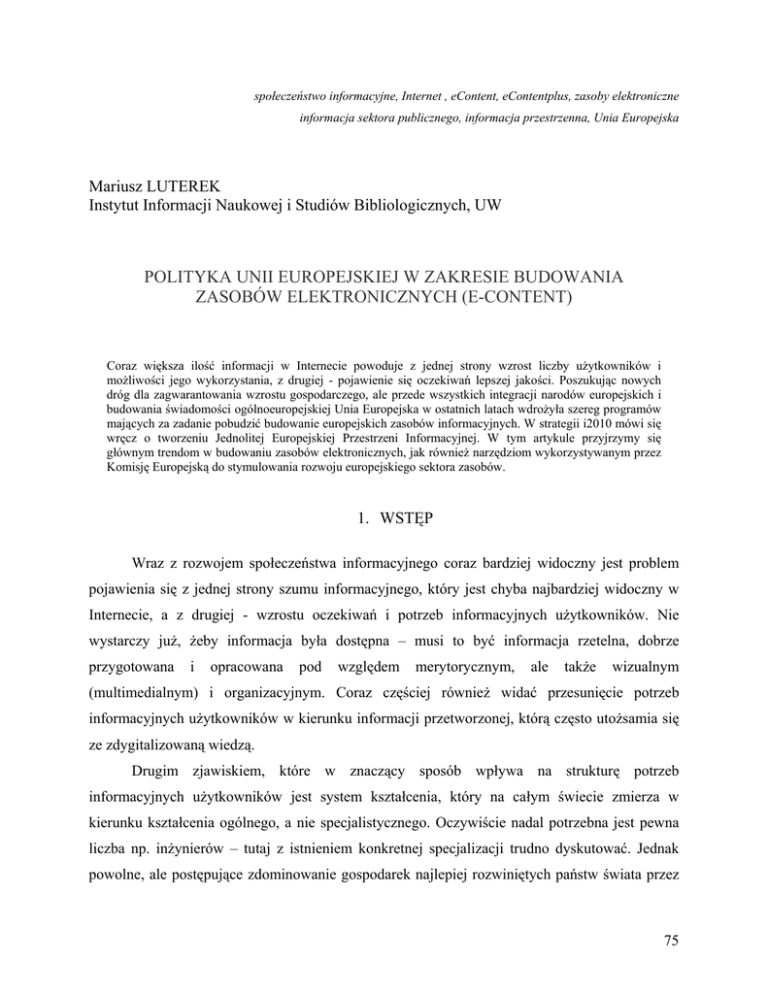 społeczeństwo informacyjne, Internet , eContent, eContentplus, zasoby elektroniczne informacja sektora publicznego, informacja przestrzenna, Unia Europejska Mariusz LUTEREK Instytut Informacji Naukowej i Studiów Bibliologicznych, UW POLITYKA UNII EUROPEJSKIEJ W ZAKRESIE BUDOWANIA ZASOBÓW ELEKTRONICZNYCH (E-CONTENT) Coraz większa ilość informacji w Internecie powoduje z jednej strony wzrost liczby użytkowników i możliwości jego wykorzystania, z drugiej - pojawienie się oczekiwań lepszej jakości. Poszukując nowych dróg dla zagwarantowania wzrostu gospodarczego, ale przede wszystkich integracji narodów europejskich i budowania świadomości ogólnoeuropejskiej Unia Europejska w ostatnich latach wdrożyła szereg programów mających za zadanie pobudzić budowanie europejskich zasobów informacyjnych. W strategii i2010 mówi się wręcz o tworzeniu Jednolitej Europejskiej Przestrzeni Informacyjnej. W tym artykule przyjrzymy się głównym trendom w budowaniu zasobów elektronicznych, jak również narzędziom wykorzystywanym przez Komisję Europejską do stymulowania rozwoju europejskiego sektora zasobów. 1. WSTĘP Wraz z rozwojem społeczeństwa informacyjnego coraz bardziej widoczny jest problem pojawienia się z jednej strony szumu informacyjnego, który jest chyba najbardziej widoczny w Internecie, a z drugiej - wzrostu oczekiwań i potrzeb informacyjnych użytkowników. Nie wystarczy już, żeby informacja była dostępna – musi to być informacja rzetelna, dobrze przygotowana i opracowana pod względem merytorycznym, ale także wizualnym (multimedialnym) i organizacyjnym. Coraz częściej również widać przesunięcie potrzeb informacyjnych użytkowników w kierunku informacji przetworzonej, którą często utożsamia się ze zdygitalizowaną wiedzą. Drugim zjawiskiem, które w znaczący sposób wpływa na strukturę potrzeb informacyjnych użytkowników jest system kształcenia, który na całym świecie zmierza w kierunku kształcenia ogólnego, a nie specjalistycznego. Oczywiście nadal potrzebna jest pewna liczba np. inżynierów – tutaj z istnieniem konkretnej specjalizacji trudno dyskutować. Jednak powolne, ale postępujące zdominowanie gospodarek najlepiej rozwiniętych państw świata przez 75 sektor usług siłą rzeczy wymusza kształcenie, które pozwoli absolwentom znaleźć się na żywym, ewoluującym rynku pracy. W ten sposób otrzymujemy dużą grupę użytkowników, którym wiedza i doświadczenie pozwala na przyswajanie sobie informacji z różnych dziedzin. W rezultacie, obserwując kierunek przemian gospodarczych, można śmiało powiedzieć, że zapotrzebowanie na informację przetworzoną będzie rosnąć. Stymulowanie dostępu do wiedzy (również wiedzy zdygitalizowanej) od kilku lat jest jednym z priorytetów Unii Europejskiej. W niniejszym artykule przyjrzymy się niektórym programom, realizowanym przez Wspólnoty, a także przeanalizujemy powody, dla których w ostatnich latach szczególnie ważnym priorytetem dla Unii stała się promocja tworzenia tzw. treści europejskich (ang. European e-content) w Internecie. 2. GŁÓWNE TRENDY W BUDOWANIU ZASOBÓW ELEKTRONICZNYCH Rozwój społeczeństwa informacyjnego jest silnie związany z pojęciem globalizacji – ekonomicznej, kulturalnej, społecznej. Z kolei pojęcie globalizacji jest często, pejoratywnie, utożsamiane z terminem „amerykanizacja”, który jest dla wielu synonimem komercjalizacji rozumianej w najbardziej brutalny, twardy, kapitalistyczny sposób. Podobnie jak w gospodarce, tak i w budowaniu zasobów elektronicznych mówimy o globalizacji, która wyrażają się między innymi: ponadnarodowym charakterem wielu serwisów (informacji, usług) – np. Yahoo, eBay, budowaniem zintegrowanych punktów dostępu do zasobów informacyjnych w różnych miejscach świata, dominacją elementów amerykańskich, czy mówiąc szerzej – anglosaskich. Ta ostatnia uwarunkowana jest wieloma czynnikami gospodarczymi (rankingi największych firm międzynarodowych zdominowane są przez koncerny amerykańskie), społecznymi (kraje anglosaskie to są z reguły kraje z lepiej wykształconym – wysoki stopień scholaryzacji – i bardziej dostatnim społeczeństwem), kulturowymi (państwa te tworzą uwspólnioną przestrzeń kulturową, język angielski ma status języka międzynarodowego), czy nawet historycznymi (Internet powstał w Stanach Zjednoczonych, tak więc pierwsze treści były produkowane głównie w języku angielskim). 76 Obok globalizacji (i związanej z nią pewnej homogenizacji zasobów) obserwowany jest proces odwrotny – tzw. lokalizacji treści, która często bywa mylnie rozumiana jako zwykłe przetłumaczenie strony z języka oryginalnego na język grupy docelowej. Tymczasem właściwa lokalizacja treści wychodzi daleko poza kryterium językowe i dotyka zarówno kwestii kulturalnych, społecznych jak i gospodarczych, właściwych dla danej grupy docelowej 1 . Oba te procesy, globalizacji i lokalizacji treści, najlepiej obrazują badania przeprowadzone na potrzeby programu eContent w latach 2001-2002. Autorzy badania dokonali analizy 50 najbardziej popularnych stron, z punktu widzenia pochodzenia oraz zasięgu, we wszystkich krajach tzw. starej Unii (UE-15) i Norwegii oraz w Stanach Zjednoczonych. Pochodzenie zdefiniowano jako: strony własne (stworzone przez instytucje, których główna siedziba znajduje się w danym kraju), strony innych krajów Unii Europejskiej (stworzone przez instytucje, których główna siedziba znajduje się w innym kraju UE) oraz pozostałe (stworzone przez instytucje, których główne siedziby znajdują się poza krajami UE). Z kolei kryterium zasięgu obejmowało trzy podkryteria: narodowe (strony, których grupą docelową jest społeczność danego kraju), ponadnarodowe (strony, które nie są budowane w oparciu o kryteria narodowe, mają charakter globalny) oraz strony zlokalizowane (strony, których treści, pierwotnie przeznaczone