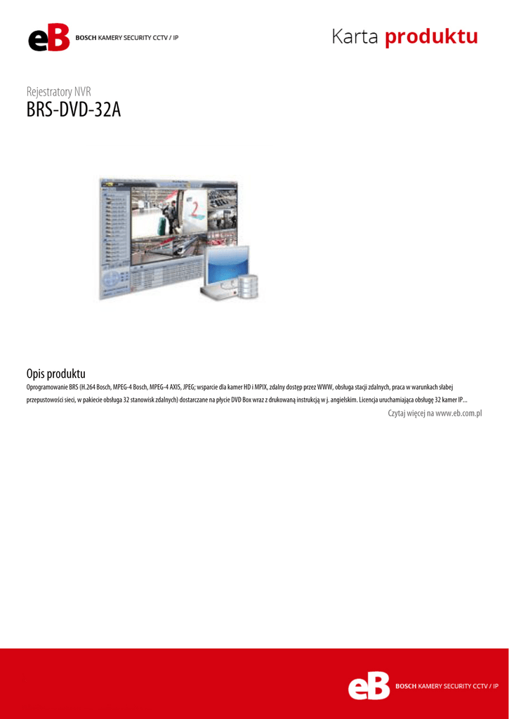 Rejestratory NVR BRS-DVD-32A Opis produktu Oprogramowanie BRS (H.264 Bosch, MPEG-4 Bosch, MPEG-4 AXIS, JPEG; wsparcie dla kamer HD i MPIX, zdalny dostęp przez WWW, obsługa stacji zdalnych, praca w warunkach słabej przepustowości sieci, w pakiecie obsługa 32 stanowisk zdalnych) dostarczane na płycie DVD Box wraz z drukowaną instrukcją w j. angielskim. Licencja uruchamiająca obsługę 32 kamer IP... Czytaj więcej na www.eb.com.pl
