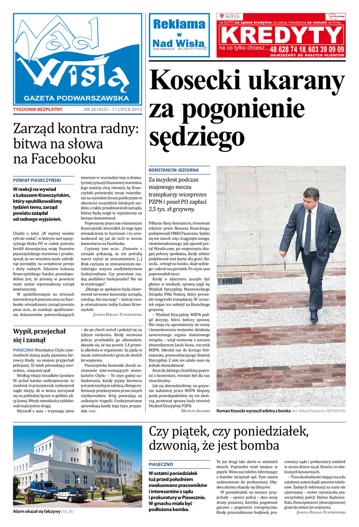 Reklama w www.nadwisla.pl tygodnik BEZPŁATNy NR 26 (433) – 11 lipca 2013 Zarząd kontra radny: bitwa na słowa na Facebooku powiat piaseczyński W reakcji na wywiad z Łukaszem Krawczyńskim, który opublikowaliśmy tydzień temu, zarząd powiatu zażądał od radnego wyjaśnień. Chodzi o tekst „W mętnej wodzie ryb nie widać”, w którym szef opozycyjnego klubu PO w radzie powiatu kreślił dramatyczną wizję finansów piaseczyńskiego starostwa i przekonywał, że we wrześniu może zabraknąć pieniędzy na urzędnicze pensje i diety radnych. Zdaniem Łukasza Krawczyńskiego bardzo prawdopodobne jest, że jesienią w powiecie może zostać wprowadzony zarząd komisaryczny. W opublikowanym na stronach internetowych powiatu oraz na Facebooku oświadczeniu zarząd powiatu pisze m.in., że oczekuje upublicznienia dokumentów potwierdzających Wypił, przejechał się i zasnął Piaseczno. Mieszkańcy Chylic uniemożliwili dalszą jazdę pijanemu kierowcy. Kiedy na miejsce przyjechali policjanci, 55-latek prowadzący mercedesa... smacznie spał. Według relacji świadków Jarosław W. jechał bardzo niebezpiecznie: to zwalniał, to przyspieszał, wykonywał nagłe skręty. Aż w końcu zatrzymał się na pobliskiej łączce w pobliżu ulicy Jasnej. Wtedy mieszkańcy zablokowali mężczyźnie drogę. Wyszedł z auta – trzymając piwo stawiane w wywiadzie tezy o dramatycznej sytuacji finansowej starostwa. Jego autorzy chcą również, by Krawczyński potwierdzi swoje twierdzenia na szerokim forum publicznym w obecności wszystkich lokalnych mediów, a także przedstawicieli zarządu, którzy będą mogli te wyjaśnienia na bieżąco komentować. Poproszony przez nas o komentarz Krawczyński stwierdził, że tego typu oświadczenia to kuriozum i że ustosunkował się już do nich w swoim komentarzu na Facebooku. Czytamy tam m.in.: „Panowie z zarządu pokazują, że nie potrafią nawet czytać ze zrozumieniem. [...] Brak czytania ze zrozumieniem metodologia nazywa analfabetyzmem funkcjonalnym. Czy powiatem rządzą analfabeci funkcjonalni? Nie mi to rozstrzygać”. „Dlatego ze spokojem będę obserwował nerwowe konwulsje zarządu, wiedząc, kto ma rację” – kończy swoje oświadczenie radny Łukasz Krawczyński. Joanna Ferlian-Tchórzewska – ale po chwili wrócił i położył się na tylnym siedzeniu. Kiedy wezwana policja przebadała go alkomatem, okazało się, że ma prawie 3,4 promila alkoholu w organizmie. Za jazdę w stanie nietrzeźwości grozi do dwóch lat więzienia. Piaseczyńska komenda chwali zachowanie interweniujących mieszkańców Chylic: – To czyn godny naśladowania. Każdy pijany kierowca jest potencjalnym zabójcą, dlatego informacje przekazywane przez innych użytkowników dróg pozwalają na uniknięcie tragedii. Funkcjonariusze sprawdzają każdy tego typu przypadek. (mb) tel. (22) 717 71 01 Kosecki ukarany za pogonienie sędziego konstancin-jeziorna Za incydent podczas majowego meczu trampkarzy wiceprezes PZPN i poseł PO zapłaci 2,5 tys. zł grzywny. Piłkarze Kosy Konstancin, trenowani właśnie przez Romana Koseckiego, podejmowali UMKS Piaseczno. Sędzia się nie stawił, więc ściągnięto innego, niedoświadczonego. Jak ujawnił portal Weszlo.com, po rozpoczęciu drugiej połowy spotkania, kiedy arbiter podyktował rzut karny dla gości, Kosecki... wbiegł na boisko, sklął sędziego i zabrał mu gwizdek. Po czym sam poprowadził mecz. Kiedy o zdarzeniu zaczęło być głośno w mediach, sprawą zajął się Wydział Dyscypliny Mazowieckiego Związku Piłki Nożnej, który prowadzi rozgrywki trampkarzy. W czwartek organ ten nałożył na Koseckiego grzywnę. – Wydział Dyscypliny MZPN podjął decyzję, która kończy sprawę. Nie czuję się upoważniony do oceny i komentowania motywów działania suwerennego organu statutowego związku – uciął rozmowę z naszym dziennikarzem Jacek Sowa, rzecznik MZPN. Odesłał nas do Jerzego Stelmaszuka, przewodniczącego Komisji Dyscypliny. Z nim nie udało nam się jednak skontaktować. Kosecki, którego chcieliśmy poprosić o komentarz, również był dla nas nieuchwytny. Jak się dowiedzieliśmy, na grzywnie nałożonej przez MZPN kłopoty posła prawdopodobnie się nie skończą, ponieważ sprawę bada również Wydział Dyscypliny PZPN. Mateusz Adamski Czy piątek, czy poniedziałek, dzwonią, że jest bomba piaseczno Alarm okazał się fałszywy (fot. jft) Roman Kosecki wyrzucił arbitra z boiska (fot. Witold Rozbicki/ REPORTER) W ostatni poniedziałek tuż przed południem ewakuowano pracowników i interesantów z sądu i prokuratury w Piasecznie. W gmachu miała być podłożona bomba. To już drugi taki alarm w ostatnich dniach. Poprzedni miał miejsce w piątek. Wówczas telefon informujący o bombie otrzymał sąd. Tym razem zadzwoniono do prokuratury. Obydwa alarmy okazały się fałszywe. W poniedziałek na miejsce przyjechały – oprócz policji – dwa wozy straży pożarnej, karetka, pogotowie gazowe i pogotowie energetyczne. Kiedy przeszukiwano budynek, pra- cownicy sądu i prokuratury siedzieli w cieniu drzew na pl. Kisiela i w okolicznych kawiarniach. – Trwa dochodzenie mające na celu ustalenie autora bądź autorów telefonów. Żadnych informacji na razie nie ujawniamy – mówi rzeczniczka piaseczyńskiej policji Halina KędzioraKula. Dowcipnisiowi (dowcipnisiom) grozi do ośmiu lat więzienia. Joanna Ferlian-Tchórzewska 2 reklama ~ NadWisłą ~ nr 26/2013 wydarzenia Kolarze mieli pod górkę góra kalwaria Blisko 650 zawodników stanęło na starcie niedzielnego V etapu LOTTO Poland Bike Marathon. Kolarze górscy rywalizowali na trzech dystansach. Dorośli mieli do pokonania 53 lub 35 km, a dzieci – 6. Dwie pierwsze trasy wiodły m.in. przez Lasy Chojnowskie, wiślanym wałem i wokół zamku w Czersku, a finisz rozegrał się w mieście na prowadzącej stromo pod górę, wyboistej uliczce św. Antoniego. Start i metę usytuowano przy placu Piłsudskiego, tam t