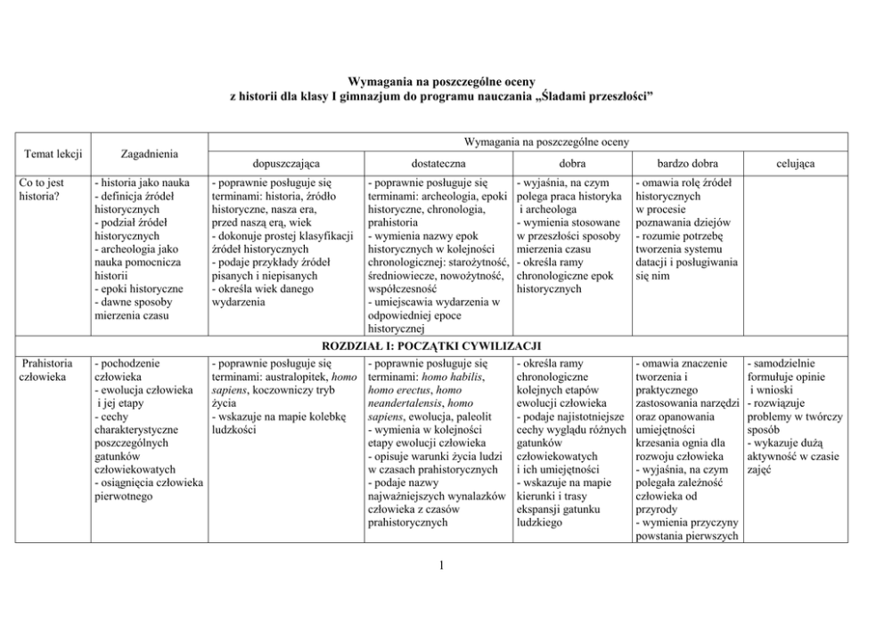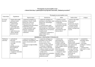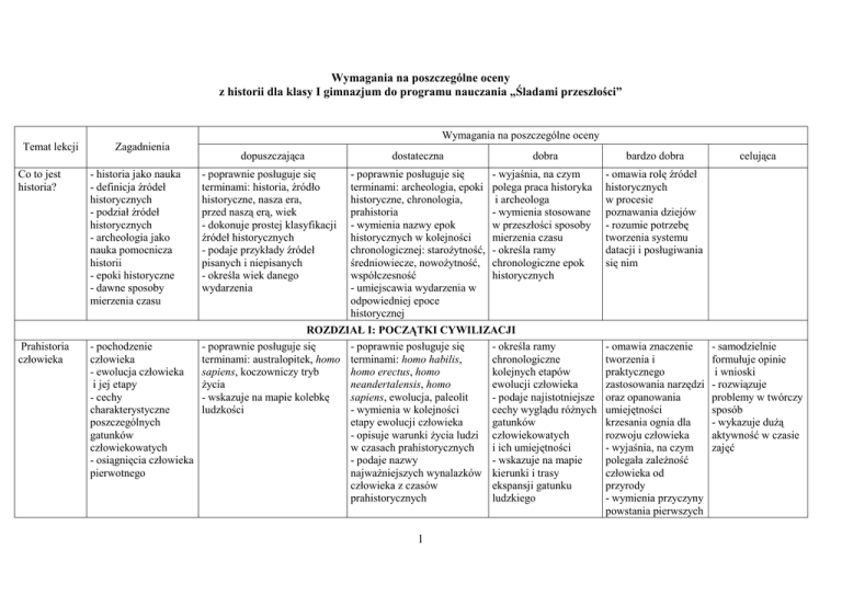 Wymagania na poszczególne oceny z historii dla klasy I gimnazjum do programu nauczania „Śladami przeszłości” Wymagania na poszczególne oceny Temat lekcji Co to jest historia? Prahistoria człowieka Zagadnienia - historia jako nauka - definicja źródeł historycznych - podział źródeł historycznych - archeologia jako nauka pomocnicza historii - epoki historyczne - dawne sposoby mierzenia czasu dopuszczająca - poprawnie posługuje się terminami: historia, źródło historyczne, nasza era, przed naszą erą, wiek - dokonuje prostej klasyfikacji źródeł historycznych - podaje przykłady źródeł pisanych i niepisanych - określa wiek danego wydarzenia dostateczna dobra bardzo dobra - poprawnie posługuje się terminami: archeologia, epoki historyczne, chronologia, prahistoria - wymienia nazwy epok historycznych w kolejności chronologicznej: staroŜytność, średniowiecze, nowoŜytność, współczesność - umiejscawia wydarzenia w odpowiedniej epoce historycznej - wyjaśnia, na czym polega praca historyka i archeologa - wymienia stosowane w przeszłości sposoby mierzenia czasu - określa ramy chronologiczne epok historycznych - omawia rolę źródeł historycznych w procesie poznawania dziejów - rozumie potrzebę tworzenia systemu datacji i posługiwania się nim ROZDZIAŁ I: POCZĄTKI CYWILIZACJI - określa ramy - pochodzenie - poprawnie posługuje się - poprawnie posługuje się chronologiczne terminami: australopitek, homo terminami: homo habilis, człowieka kolejnych etapów - ewolucja człowieka sapiens, koczowniczy tryb homo erectus, homo Ŝycia neandertalensis, homo ewolucji człowieka i jej etapy - podaje najistotniejsze - cechy - wskazuje na mapie kolebkę sapiens, ewolucja, paleolit - wymienia w kolejności cechy wyglądu róŜnych charakterystyczne ludzkości gatunków etapy ewolucji człowieka poszczególnych - opisuje warunki Ŝycia ludzi człowiekowatych gatunków człowiekowatych w czasach prahistorycznych i ich umiejętności - wskazuje na mapie - osiągnięcia człowieka - podaje nazwy najwaŜniejszych wynalazków kierunki i trasy pierwotnego człowieka z czasów ekspansji gatunku prahistorycznych ludzkiego 1 - omawia znaczenie tworzenia i praktycznego zastosowania narzędzi oraz opanowania umiejętności krzesania ognia dla rozwoju człowieka - wyjaśnia, na czym polegała zaleŜność człowieka od przyrody - wymienia przyczyny powstania pierwszych celująca - samodzielnie formułuje opinie i wnioski - rozwiązuje problemy w twórczy sposób - wykazuje duŜą aktywność w czasie zajęć dzieł sztuki praludzi Tajemnice sprzed wieków – Jak zbadano pochodzenie człowieka? - teorie dotyczące powstania człowieka - Karol Darwin i jego odkrycie - zadania antropologii Czas wielkich - wpływ zmian klimatu przemian na Ŝycie człowieka - rewolucja neolityczna - początki rolnictwa i hodowli - pierwsze osady - budowle megalityczne - początek metalurgii - przedstawia główne załoŜenia teorii Karola Darwina - wymienia teorie dotyczące powstania człowieka - poprawnie posługuje się terminami: rewolucja neolityczna, osiadły tryb Ŝycia, osada, epoka brązu, epoka Ŝelaza - przedstawia zmiany, które zaszły w Ŝyciu człowieka w okresie neolitu - podaje nazwy metali wykorzystywanych przez praludzi do wytopu broni, narzędzi, ozdób - poprawnie posługuje się terminami: ewolucjonizm, antropologia - opisuje, czym zajmuje się antropolog - omawia sposoby ustalania wieku znalezisk - omawia teorię ewolucji Karola Darwina - wyjaśnia róŜnice między teorią kreacjonizmu a ewolucjonizmu - przedstawia znaczenie badań naukowych oraz wykorzystania róŜnych technologii dla poznania historii człowieka - poprawnie posługuje się terminami: neolit, megalit - określa ramy chronologiczne rewolucji neolitycznej - opisuje Ŝycie codzienne ludzi przed rewolucją neolityczną - omawia sposób wytopu brązu i Ŝelaza - przedstawia wpływ zmian klimatycznych na tryb Ŝycia człowieka pierwotnego - omawia tryb Ŝycia i zajęcia ludzi epoki neolitu - nazywa i lokalizuje na mapie pozostałości najstarszej znanej osady ludzkiej - wskazuje na mapie miejsce połoŜenia najbardziej znanej - omawia tryb Ŝycia i zajęcia ludzi epoki neolitu - charakteryzuje wygląd osad neolitycznych - opisuje wygląd i funkcje budowli megalitycznych 2 - prezentuje argumenty zwolenników i przeciwników ewolucjonizmu Ponadto: - samodzielnie formułuje opinie i wnioski - rozwiązuje problemy w twórczy sposób - wykazuje duŜą aktywność w czasie zajęć - uzasadnia słuszność określenia rewolucja dla zmian, które zaszły w Ŝyciu człowieka w okresie neolitu Ponadto: - samodzielnie formułuje opinie i wnioski - rozwiązuje problemy w twórczy sposób W kraju Sumerów Babilonia i Asyria budowli megalitycznej - wyjaśnia, jakie zmiany nastąpiły w Ŝyciu człowieka dzięki opanowaniu umiejętności wytopu metali - poprawnie posługuje się - podaje ramy chronologiczne - charakteryzuje - połoŜenie istnienia cywilizacji oddziaływanie geograficzne i warunki terminami: cywilizacja, sumeryjskiej warunków naturalnych naturalne Mezopotamii Mezopotamia, system na Ŝycie mieszkańców - powstanie pierwszych irygacyjny, Sumerowie, miasto- - poprawnie posługuje się państwo terminami: śyzny PółksięŜyc, Mezopotamii państw król-kapłan, zikkurat - organizacja państwa - lokalizuje na mapie - określa rolę rzek w Sumerów Mezopotamię - omawia połoŜenie staroŜytnej Mezopotamii - osiągnięcia - opisuje wygląd miast cywilizacji geograficzne i warunki sumeryjskiej naturalne panujące w sumeryjskich Mezopotamii - wymienia osiągnięcia Sumerów - państwo babilońskie - Hammurabi i jego kodeks prawny - Babilon - państwo asyryjskie - organizacja armii asyryjskiej - poprawnie posługuje się terminami: Babilon, Kodeks Hammurabiego, politeizm - określa, kim był i czym zasłynął Hammurabi - lokalizuje na mapie państwo babilońskie i asyryjskie - omawia najwaŜniejsze zasady pra