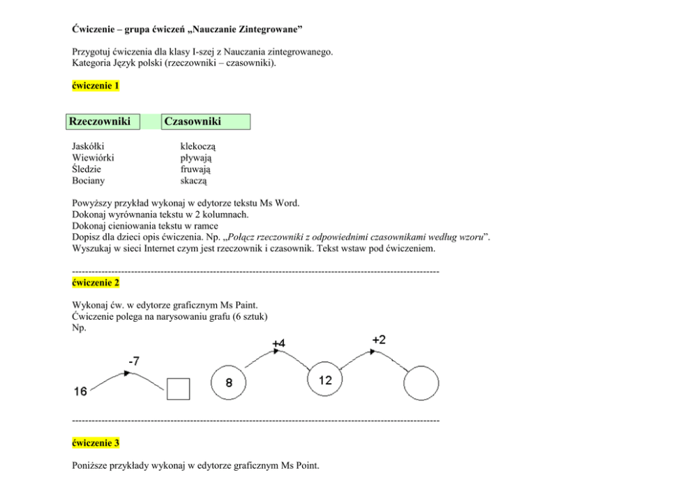 Ćwiczenie – grupa ćwiczeń „Nauczanie Zintegrowane” Przygotuj ćwiczenia dla klasy I-szej z Nauczania zintegrowanego. Kategoria Język polski (rzeczowniki – czasowniki). ćwiczenie 1 Rzeczowniki Jaskółki Wiewiórki Śledzie Bociany Czasowniki klekoczą pływają fruwają skaczą Powyższy przykład wykonaj w edytorze tekstu Ms Word. Dokonaj wyrównania tekstu w 2 kolumnach. Dokonaj cieniowania tekstu w ramce Dopisz dla dzieci opis ćwiczenia. Np. „Połącz rzeczowniki z odpowiednimi czasownikami według wzoru”. Wyszukaj w sieci Internet czym jest rzeczownik i czasownik. Tekst wstaw pod ćwiczeniem. ---------------------------------------------------------------------------------------------------------------ćwiczenie 2 Wykonaj ćw. w edytorze graficznym Ms Paint. Ćwiczenie polega na narysowaniu grafu (6 sztuk) Np. ---------------------------------------------------------------------------------------------------------------ćwiczenie 3 Poniższe przykłady wykonaj w edytorze graficznym Ms Point. Następnie skopiuj te przykłady do edytora Ms Word i dokonaj opisu ćwiczenia. ---------------------------------------------------------------------------------------------------------------- ćwiczenie 4 W edytorze tekstu Ms Word wykonaj ćwiczenie dla klasy I-szej Ciszej którym nauczamy zasad odmiany liczby mnogiej Wóz-wozy pokoje-pokój Dół - ………………….. roje - ……………… Stół - …………………. Słoje - ……………. Rów - ……………….. bobry - …………… Dziób - ……………….. gwoździe - ……….. Łódź - ……………….. noże - …………… Pod przykładem opis zasady odmiany liczba pojedyncza-liczba mnoga. Zasady skopiuj z sieci Internet. ---------------------------------------------------------------------------------------------------------------ćwiczenie 5 Wykonaj ćwiczenie w edytorze tekstu Ms Word, w którym przygotuj działania matematyczne. Znak mniejszości znak większości oraz równości. 27……3 6……21 0…….24 30……9 4……29 28……5 23……32 28…..82 30…..30 Opisz jaki znak odpowiada za mniejszość a jaki za większość. Po prostu dodaj pod ćwiczeniem opis znaków: < > = ---------------------------------------------------------------------------------------------------------------- ćwiczenie 6 Wykonaj ćwiczenie w edytorze tekstu Ms Word, w którym przygotuj działania matematyczne 9 + 1 + 5 = C 9 + 1 + 0 = K 9 + 1 + 6 = P 9 + 1 + 8 = A 9 + 1 + 4 = E 9 + 1 + 1 = O 9 + 1 + 10 = Y 9 + 1 + 7 = R 9 + 1 + 3 = I 9 + 1 + 2 = N 9 + 1 + 9 = C Uporządkuj wyniki od najmniejszego do największego i zapisz w poniższej tabeli wraz z literami obok. Odczytaj hasło. < Liczba Litera ----------------------------------------------------------------------------------------------------------------