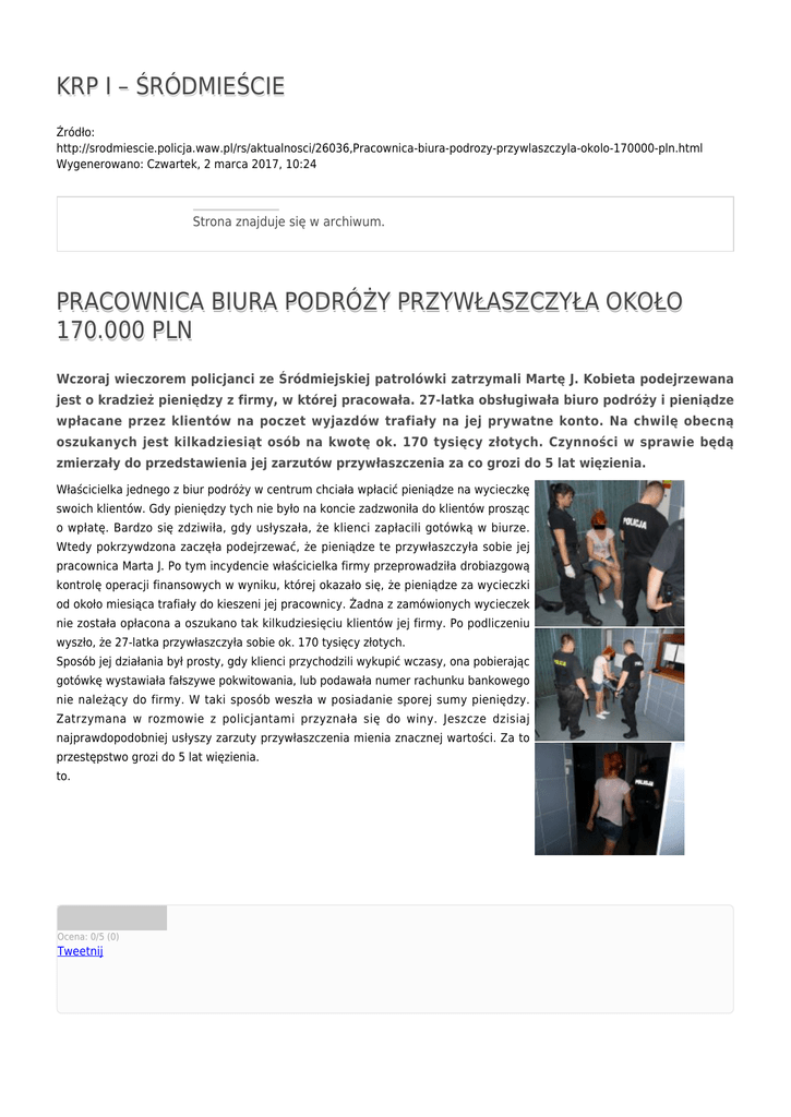 KRP I – ŚRÓDMIEŚCIE Źródło: http://srodmiescie.policja.waw.pl/rs/aktualnosci/26036,Pracownica-biura-podrozy-przywlaszczyla-okolo-170000-pln.html Wygenerowano: Czwartek, 2 marca 2017, 10:24 Strona znajduje się w archiwum. PRACOWNICA BIURA PODRÓŻY PRZYWŁASZCZYŁA OKOŁO 170.000 PLN Wczoraj wieczorem policjanci ze Śródmiejskiej patrolówki zatrzymali Martę J. Kobieta podejrzewana jest o kradzież pieniędzy z firmy, w której pracowała. 27-latka obsługiwała biuro podróży i pieniądze wpłacane przez klientów na poczet wyjazdów trafiały na jej prywatne konto. Na chwilę obecną oszukanych jest kilkadziesiąt osób na kwotę ok. 170 tysięcy złotych. Czynności w sprawie będą zmierzały do przedstawienia jej zarzutów przywłaszczenia za co grozi do 5 lat więzienia. Właścicielka jednego z biur podróży w centrum chciała wpłacić pieniądze na wycieczkę swoich klientów. Gdy pieniędzy tych nie było na koncie zadzwoniła do klientów prosząc o wpłatę. Bardzo się zdziwiła, gdy usłyszała, że klienci zapłacili gotówką w biurze. Wtedy pokrzywdzona zaczęła podejrzewać, że pieniądze te przywłaszczyła sobie jej pracownica Marta J. Po tym incydencie właścicielka firmy przeprowadziła drobiazgową kontrolę operacji finansowych w wyniku, której okazało się, że pieniądze za wycieczki od około miesiąca trafiały do kieszeni jej pracownicy. Żadna z zamówionych wycieczek nie została opłacona a oszukano tak kilkudziesięciu klientów jej firmy. Po podliczeniu wyszło, że 27-latka przywłaszczyła sobie ok. 170 tysięcy złotych. Sposób jej działania był prosty, gdy klienci przychodzili wykupić wczasy, ona pobierając gotówkę wystawiała fałszywe pokwitowania, lub podawała numer rachunku bankowego nie należący do firmy. W taki sposób weszła w posiadanie sporej sumy pieniędzy. Zatrzymana w rozmowie z policjantami przyznała się do winy. Jeszcze dzisiaj najprawdopodobniej usłyszy zarzuty przywłaszczenia mienia znacznej wartości. Za to przestępstwo grozi do 5 lat więzienia. to. Ocena: 0/5 (0) Tweetnij