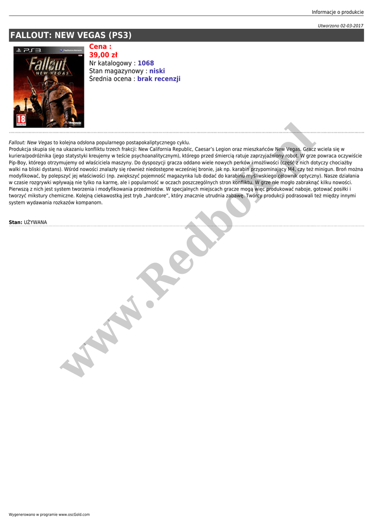 Informacje o produkcie Utworzono 02-03-2017 FALLOUT: NEW VEGAS (PS3) Cena : 39,00 zł Nr katalogowy : 1068 Stan magazynowy : niski Średnia ocena : brak recenzji oX .p l Fallout: New Vegas to kolejna odsłona popularnego postapokaliptycznego cyklu. Produkcja skupia się na ukazaniu konfliktu trzech frakcji: New California Republic, Caesar’s Legion oraz mieszkańców New Vegas. Gracz wciela się w kuriera/podróżnika (jego statystyki kreujemy w teście psychoanalitycznym), którego przed śmiercią ratuje zaprzyjaźniony robot. W grze powraca oczywiście Pip-Boy, którego otrzymujemy od właściciela maszyny. Do dyspozycji gracza oddano wiele nowych perków i możliwości (część z nich dotyczy chociażby walki na bliski dystans). Wśród nowości znalazły się również niedostępne wcześniej bronie, jak np. karabin przypominający M4, czy też minigun. Broń można modyfikować, by polepszyć jej właściwości (np. zwiększyć pojemność magazynka lub dodać do karabinu myśliwskiego celownik optyczny). Nasze działania w czasie rozgrywki wpływają nie tylko na karmę, ale i popularność w oczach poszczególnych stron konfliktu. W grze nie mogło zabraknąć kilku nowości. Pierwszą z nich jest system tworzenia i modyfikowania przedmiotów. W specjalnych miejscach gracze mogą więc produkować naboje, gotować posiłki i tworzyć mikstury chemiczne. Kolejną ciekawostką jest tryb „hardcore”, który znacznie utrudnia zabawę. Twórcy produkcji podrasowali też między innymi system wydawania rozkazów kompanom. w w w .R ed b Stan: UŻYWANA Wygenerowano w programie www.oscGold.com