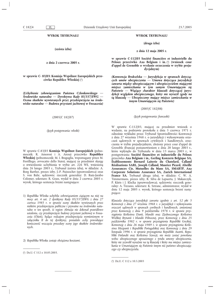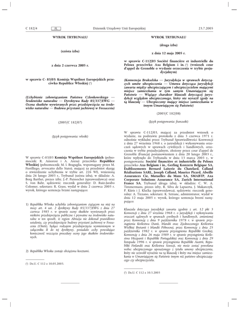 C 182/4 Dziennik Urzędowy Unii Europejskiej PL WYROK TRYBUNAŁU 23.7.2005 WYROK TRYBUNAŁU (druga izba) (szósta izba) z dnia 2 czerwca 2005 r. w sprawie C- 83/03: Komisja Wspólnot Europejskich przeciwko Republice Włoskiej (1) (Uchybienie zobowiązaniom Państwa Członkowskiego — Środowisko naturalne — Dyrektywa Rady 85/337/EWG — Ocena skutków wywieranych przez przedsięwzięcia na środowisko naturalne — Budowa przystani jachtowej w Fossacesia) z dnia 12 maja 2005 r. w sprawie C-112/03 Société financière et industrielle du Peloux przeciwko Axa Belgium i in. (1) (wniosek cour d'appel de Grenoble o wydanie orzeczenia w trybie prejudycjalnym) (Konwencja Brukselska — Jurysdykcja w sprawach dotyczących umów ubezpieczenia — Umowa dotycząca jurysdykcji zawarta między ubezpieczającym i ubezpieczycielem mającymi miejsce zamieszkania w tym samym Umawiającym się Państwie — Wiążący charakter klauzuli dotyczącej jurysdykcji względem ubezpieczonego, który nie wyraził zgody na tą klauzulę — Ubezpieczony mający miejsce zamieszkania w innym Umawiającym się Państwie) (2005/C 182/08) (2005/C 182/07) (Język postępowania: włoski) W sprawie C-83/03 Komisja Wspólnot Europejskich (pełnomocnik: R. Amorosi i A. Aresu) przeciwko Republice Włoskiej (pełnomocnik: M. I. Braguglia, wspomagany przez M. Fiorilliego, avvocatto dello Stato), mającej za przedmiot skargę o stwierdzenie uchybienia w trybie art. 226 WE, wniesioną dnia 26 lutego 2003 r., Trybunał (szósta izba), w składzie: A. Borg Barthet, prezes izby, J.-P. Puissochet (sprawozdawca) oraz S. von Bahr, sędziowie; rzecznik generalny: D. Ruiz-Jarabo Colomer, sekretarz: R. Grass, wydał w dniu 2 czerwca 2005 r. wyrok, którego sentencja brzmi następująco: 1) Republika Włoska uchybiła zobowiązaniom ciążącym na niej na mocy art. 4 ust. 2 dyrektywy Rady 85/337/EWG z dnia 27 czerwca 1985 r. w sprawie oceny skutków wywieranych przez niektóre przedsięwzięcia publiczne i prywatne na środowisko naturalne w ten sposób, iż region Abruzja nie dokonał prawidłowo ustalenia, czy przedsięwzięcie budowy przystani jachtowej w Fossacesia (Chieti), będące rodzajem przedsięwzięcia wymienionym w załączniku II do tej dyrektywy, posiadało cechy powodujące konieczność wszczęcia procedury oceny jego skutków środowiskowych. 2) Republika Włoska zostaje obciążona kosztami. (Język postępowania: francuski) W sprawie C-112/03, mającej za przedmiot wniosek o wydanie, na podstawie protokołu z dnia 3 czerwca 1971 r. odnośnie wykładni przez Trybunał Sprawiedliwości Konwencji z dnia 27 września 1968 r. o jurysdykcji i wykonywaniu orzeczeń sądowych w sprawach cywilnych i handlowych, orzeczenia w trybie prejudycjalnym, złożony przez cour d'appel de Grenoble (Francja) postanowieniem z dnia 20 lutego 2003 r., które wpłynęło do Trybunału w dniu 13 marca 2003 r., w postępowaniu: Société financière et industrielle du Peloux przeciwko Axa Belgium i in., Gerling Konzern Belgique SA, Établissements Bernard Laiterie du Chatelard, Calland Réalisations SARL, Joseph Calland, Maurice Picard, Abeille Assurances Cie, Mutuelles du Mans SA, SMABTP, Axa Corporate Solutions Assurance SA, Zurich International France SA, Trybunał (druga izba), w składzie: C. W. A. Timmermans, prezes izby, R. Silva de Lapuerta, J. Makarczyk, P. Kūris i J. Klučka (sprawozdawca), sędziowie; rzecznik generalny: A. Tizzano, sekretarz: K. Sztranc, administrator, wydał w dniu 12 maja 2005 r. wyrok, którego sentencja brzmi następująco: Klauzula dotycząca jurysdykcji zawarta zgodnie z art. 12 pkt 3 Konwencji z dnia 27 września 1968 r. o jurysdykcji i wykonywaniu orzeczeń sądowych w sprawach cywilnych i handlowych, zmienionej przez Konwencję z dnia 9 października 1978 r. w sprawie przystąpienia Królestwa Danii, Irlandii oraz Zjednoczonego Królestwa Wielkiej Brytanii i Irlandii Północnej, przez Konwencję z dnia 25 października 1982 r. w sprawie przystąpienia Republiki Greckiej, Konwencję z dnia 26 maja 1989 r. w sprawie przystąpienia Królestwa Hiszpanii i Republiki Portugalskiej oraz Konwencję z dnia 29 listopada 1996 r. w sprawie przystąpienia Republiki Austrii, Republiki Finlandii oraz Królestwa Szwecji, nie może zostać powołana wobec ubezpieczonego uposażonego z tytułu umowy ubezpieczenia, który nie zezwolił wyraźnie na tą klauzulę i który ma miejsce zamieszkania w Umawiającym się Państwie innym niż państwo ubezpieczającego czy ubezpieczyciela. (1) Dz.U. C 112 z 10.05.2003. (1) Dz.U. C 112 z 10.5.2003