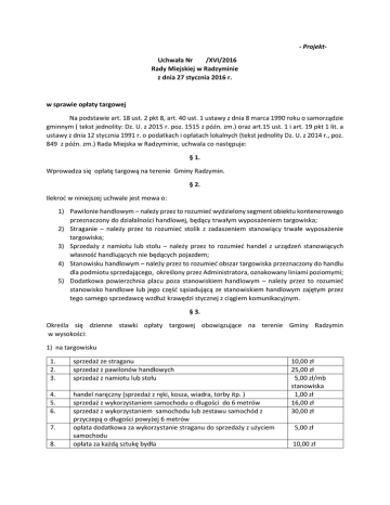- ProjektUchwała Nr /XVI/2016 Rady Miejskiej w Radzyminie z dnia 27 stycznia 2016 r. w sprawie opłaty targowej Na podstawie art. 18 ust. 2 pkt 8, art. 40 ust. 1 ustawy z dnia 8 marca 1990 roku o samorządzie gminnym ( tekst jednolity: Dz. U. z 2015 r. poz. 1515 z późn. zm.) oraz art.15 ust. 1 i art. 19 pkt 1 lit. a ustawy z dnia 12 stycznia 1991 r. o podatkach i opłatach lokalnych (tekst jednolity Dz. U. z 2014 r., poz. 849 z późn. zm.) Rada Miejska w Radzyminie, uchwala co następuje: § 1. Wprowadza się opłatę targową na terenie Gminy Radzymin. § 2. Ilekroć w niniejszej uchwale jest mowa o: 1) Pawilonie handlowym – należy przez to rozumieć wydzielony segment obiektu kontenerowego przeznaczony do działalności handlowej, będący trwałym wyposażeniem targowiska; 2) Straganie – należy przez to rozumieć stolik z zadaszeniem stanowiący trwałe wyposażenie targowiska; 3) Sprzedaży z namiotu lub stołu – należy przez to rozumieć handel z urządzeń stanowiących własność handlujących nie będących pojazdem; 4) Stanowisku handlowym – należy przez to rozumieć obszar targowiska przeznaczony do handlu dla podmiotu sprzedającego, określony przez Administratora, oznakowany liniami poziomymi; 5) Dodatkowa powierzchnia placu poza stanowiskiem handlowym – należy przez to rozumieć stanowisko handlowe lub jego część sąsiadującą ze stanowiskiem handlowym zajętym przez tego samego sprzedawcę wzdłuż krawędzi stycznej z ciągiem komunikacyjnym. § 3. Określa się dzienne stawki opłaty targowej obowiązujące na terenie Gminy Radzymin w wysokości: 1) na targowisku 1. 2. 3. sprzedaż ze straganu sprzedaż z pawilonów handlowych sprzedaż z namiotu lub stołu 4. 5. 6. handel naręczny (sprzedaż z ręki, kosza, wiadra, torby itp. ) sprzedaż z wykorzystaniem samochodu o długości do 6 metrów sprzedaż z wykorzystaniem samochodu lub zestawu samochód z przyczepą o długości powyżej 6 metrów opłata dodatkowa za wykorzystanie straganu do sprzedaży z użyciem samochodu opłata za każdą sztukę bydła 7. 8. 10,00 zł 25,00 zł 5,00 zł/mb stanowiska 1,00 zł 16,00 zł 30,00 zł 5,00 zł 10,00 zł 9. zajęcie dodatkowej powierzchni placu poza stanowiskiem handlowym 5,00 zł/ mb stanowiska 2) przy cmentarzu ( sprzedaż zniczy, kwiatów, wiązanek itp. ) 1. sprzedaż z namiotu, stolika, kosza 7,00 zł /m2 (minimalna opłata za 1m2) 3) w pozostałych miejscach 1. sprzedaż z namiotu, stolika, kosza, 7,00 zł/m2 (minimalna opłata za 1m2) § 4. Dzienna stawka opłaty targowej nie może przekroczyć kwoty 758,47 zł. § 5. Terminem płatności opłaty targowej jest dzień, w którym dokonywana jest sprzedaż. § 6. Zarządza się pobór opłaty targowej w drodze inkasa. § 7. Wykonanie uchwały powierza się Burmistrzowi Radzymina. § 8. Z dniem wejścia w życie niniejszej uchwały, traci moc Uchwała Nr 375/XXIX/20051 Rady Miejskiej w Radzyminie z dnia 20 grudnia 2005 r. w sprawie opłaty targowej. § 9. Uchwała wchodzi w życie po upływie 14 dni od ogłoszenia w Dzienniku Urzędowym Województwa Mazowieckiego. 1 Zmieniona Uchwałą Nr 599/XLII/2010 Rady Miejskiej w Radzyminie z dnia 8 października 2010 r. w sprawie zmiany uchwały Nr 375/XXIX/2005 z dnia 20 grudnia 2005 r. w sprawie stawek opłaty targowej. Uzasadnienie do uchwały Rady Miejskiej w Radzyminie w sprawie opłaty targowej Przedstawiony projekt uchwały w sprawie opłaty targowej podyktowany jest koniecznością zmiany stawek opłaty targowej, które w obecnej wysokości obowiązują od 2005 roku. Dlatego istnieje potrzeba aktualizacji rodzaju i wysokości stawek oraz określenie zasad i ustalenie poboru opłaty targowej. W celu doprecyzowania podstawy stosowania stawek opłaty targowej konieczne jest także doprecyzowanie definicji przedmiotów będących podstawą zastosowania stawek opłaty targowej. Dotychczasowe stawki opłaty targowej w stopniu znaczącym opierały się o kryterium ładowności pojazdów. Niniejszy projekt uchwały przewiduje uproszczenie zasad poboru opłat za samochody polegający na wprowadzeniu dwóch stawek zależnych od długości, co w znaczny sposób ułatwi egzekwowanie należności. Jednocześnie projekt uchwały przewiduje wprowadzenie jasnych zasad zajmowania stanowisk handlowych jak i opłat za dodatkową powierzchnię przeznaczoną do handlu, co było przyczyną wielu konfliktów. Wobec powyższego uzasadnione jest przyjęcie uchwały w proponowanym kształcie.