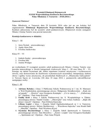 Protokół Eliminacji Rejonowych XXXII Wojewódzkiego Konkursu Recytatorskiego Pałac Młodzieży w Tarnowie – 29.04.2016 r. Szanowni Państwo! Pałac Młodzieży w Tarnowie dnia 29 kwietnia 2016 roku już po raz kolejny był organizatorem Eliminacji Rejonowych Wojewódzkiego Konkursu Recytatorskiego. Konkurs adresowany był do uczniów szkół podstawowych. Obejmował swoim zasięgiem Miasto i Gminę Tarnów oraz powiat tarnowski. Komisja konkursowa w składzie: Klasy I – III 1. Jerzy Świtek – przewodniczący 2. Agata Abou Dan 3. Ewelina Janikowska Klasy IV – VI 1. Izabela Surdej – przewodnicząca 2. Ewelina Miś 3. Joanna Wielgus po wysłuchaniu 25 wystąpień uczniów szkół podstawowych Miasta i Gminy Tarnów oraz powiatu tarnowskiego w dwóch kategoriach wiekowych: klasy I - III oraz klasy IV – VI, kierując się takimi kryteriami jak: dobór repertuaru (wartość artystyczna i wychowawcza utworu, oraz dostosowanie do możliwości wykonawczych uczestnika), interpretacja, kultura słowa i ogólny wyraz artystyczny, do przesłuchań finałowych w „Miasteczku Galicyjskim” w Nowym Sączu ul. Lwowska 226 dnia 18 maja 2016 r. postanowiła zakwalifikować następujące osoby: Klasy I - III 1. Adriana Rybaka z klasy 2 Publicznej Szkoły Podstawowej nr 1 im. H. Marusarz w Woli Rzędzińskiej, prezentującego utwory: Małgorzaty Strzałkowskiej – „Rady nie od parady” - „Drzewo” oraz Grzegorza Kasdepke – „Co to znaczy...” – „Farbowany lis”. Opiekun – Pani Anna Krzyżak. 2. Emilię Król z klasy 3 Szkoły Podstawowej im. S. Wyspiańskiego w Żabnie, prezentującą utwory: Natalii Usenko – „Obowiązki” oraz Artura Andrusa – „Bajki dla dzieci i innych”. Opiekun – Pani Elżbieta Kijowska. 3. Lilianę Legieć z klasy 1 Zespołu Szkół Ogólnokształcących nr 1 w Tarnowie, prezentującą utwory: Heleny Bechlerowej – „ Wierzbowa bajeczka” oraz Roald Dahl – „Matylda”. Opiekun – Pani Wiesława Krysa. 4. Szymona Bryniarskiego z klasy 1 Zespołu Szkół Sportowych w Tarnowie, prezentującego utwory: Jana Brzechwy – „Żuraw i czapla” oraz Grzegorza Kasdepke – „ Spóźnianie się”. Opiekun – Pani Anna Wójcik 1 Klasy IV - VI 1. Oliwię Lisowską z klasy 5 Szkoły Podstawowej w Rzuchowej , prezentującą utwory: Danuty Wawiłow – „Szybko” oraz Ireny Landau –„Kto to widział?” – „Amelka” Opiekun – Pani Diana Lisowska. 2. Hannę Białas z klasy 5 Szkoły Podstawowej im. S. Wyspiańskiego w Żabnie, prezentującą utwory: Stanisława Wyspiańskiego – „I ciągle widzę ich twarze” oraz Ireny Landau – „Jest O.K.!”. Opiekun – Pani Elżbieta Kijowska. 3. Kingę Karaś z klasy 6 Szkoły Podstawowej nr 15 w Tarnowie, prezentująca utwory: Wisławy Szymborskiej – „Album” oraz Kiery Cass – „Jedyna”. Opiekun – Pani Ewa Chochołowicz. 4. Justynę Perkman z klasy 4 Zespołu Szkoły Podstawowej i Gimnazjum w Zakliczynie, prezentującą utwory: Tadeusza Śliwiaka – „ Wilk u dentysty” oraz Lecha Witkowskiego – „ Burzliwe dzieje pirata Rabarbara”. Opiekun – Pani Anna Woźniak Komisja konkursowa za świadomość słowa, osobowość i potencjał recytatorski, postanowiła wyróżnić: 1. Lenę Pietruszkę z klasy 3 Szkoły Podstawowej nr 17 w Tarnowie, prezentującą utwory: Katarzyny Szyngiera – „Dzień wiosny” oraz Astrid Lindgren – „Dzieci z ulicy Awanturników”. Opiekun – Pani Agnieszka Bigos. 2. Bartłomieja Kubonia z klasy 5 Szkoły Podstawowej im. T. Kościuszki w Łętowicach, prezentującego utwory: Michała Jankowiaka – „Pszczoła” oraz R. Goscinny, J.J. Sempe – „Mikołajek i inne chłopaki”. Opiekun – Pani Grażyna Sęk. Uwagi końcowe: Jury z zadowoleniem odnotowuje stałe zainteresowanie konkursem. Sugeruje, aby opiekunowie i instruktorzy stale wspierali recytatorów w doborze właściwego do ich wieku i możliwości interpretacyjnych repertuaru. Zachęca również do poszukiwania nowych środków wyrazu scenicznego, dalszej pracy nad doskonaleniem warsztatu, poprawnością dykcyjną i interpretacyjną prezentowanych tekstów. Jury wysoko ocenia poziom organizacji eliminacji i wspaniałą atmosferę, jaką stworzyli organizatorzy. Organizatorzy serdecznie dziękują uczniom za udział, a nauczycielom i opiekunom za przygotowanie uczestników do eliminacji. Na tym protokół zakończono i podpisano. Eliminacje rejonowe realizowane we współpracy z Urzędem Miasta Tarnowa i Starostwem Powiatowym w Tarnowie. 2