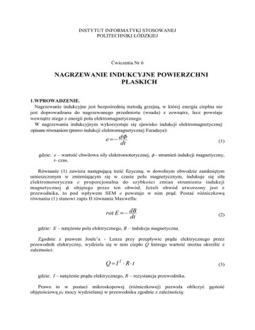 INSTYTUT INFORMATYKI STOSOWANEJ POLITECHNIKI ŁÓDZKIEJ Ćwiczenia Nr 6 NAGRZEWANIE INDUKCYJNE POWIERZCHNI PŁASKICH 1.WPROWADZENIE. Nagrzewanie indukcyjne jest bezpośrednią metodą grzejną, w której energia cieplna nie jest doprowadzana do nagrzewanego przedmiotu (wsadu) z zewnątrz, lecz powstaje wewnątrz niego z energii pola elektromagnetycznego. W nagrzewaniu indukcyjnym wykorzystuje się zjawisko indukcji elektromagnetycznej opisane równaniem (prawo indukcji elektromagnetycznej Faradaya): e dΦ dt (1) gdzie: e – wartość chwilowa siły elektromotorycznej, - strumień indukcji magnetyczny, t- czas. Równanie (1) zawiera następującą treść fizyczną: w dowolnym obwodzie zamkniętym umieszczonym w zmieniającym się w czasie polu magnetycznym, indukuje się siła elektromotoryczna e proporcjonalna do szybkości zmian strumienia indukcji magnetycznej . objętego przez ten obwód. Jeżeli obwód utworzony jest z przewodnika, to pod wpływem SEM e powstaje w nim prąd. Postać różniczkową równania (1) stanowi zapis II równania Maxwella: rot E dB dt (2) gdzie: E – natężenie pola elektrycznego, B – indukcja magnetyczna. Zgodnie z prawem Joule’a - Lenza przy przepływie prądu elektrycznego przez przewodnik elektryczny, wydziela się w nim ciepło Q którego wartość można określić z zależności: Q I 2 R t (3) gdzie: I – natężenie prądu elektrycznego, R – rezystancja przewodnika. Prawo to w postaci mikroskopowej (różniczkowej) pozwala obliczyć gęstość objętościową pV mocy wydzielanej w przewodniku zgodnie z zależnością: pV J 2 (4) gdzie: J – gęstość prądu w przewodniku, - rezystywność materiału przewodnika. Związek między gęstością prądu J indukowanego w przewodniku przenikanym zmiennym polem magnetycznym, a przestrzenną zmianą natężeniem H tego pola określony jest pierwszym równaniem Maxwell'a, które dla ośrodków dobrze przewodzących przybiera postać: rot H J (5) Równanie (5) jest różniczkowym zapisem prawa przepływu: H dl J dS (6) S gdzie: S – jest powierzchnią objęto zamkniętą drogą całkowania po dl. Równania (2), (4) i (5) opisują całokształt zjawisk elektromagnetycznych zachodzących przy nagrzewaniu indukcyjnym. Teoria nagrzewania indukcyjnego zajmuje się między innymi rozwiązywaniem tych równań, tzn. wyznaczaniem rozkładu gęstości prądu . natężenia pola magnetycznego i gęstości objętościowej pV wydzielanej mocy w różnych przypadkach konfiguracyjnych układów grzejnych spotykanych w praktyce. Źródłem zmiennego pola magnetycznego jest w praktyce zespół przewodów, zasilanych prądem przemiennym, najczęściej o przebiegu sinusoidalnym. Ten zespół przewodów nazywany jest wzbudnikiem. Wzbudnik wraz z nagrzewanym metalem, który nosi nazwę wsadu, tworzy tzw. indukcyjny układ grzejny. Wzbudnik wykonywany jest wyłącznie z miedzi elektrolitycznej o rezystywności w temperaturze 20°C nie większej niż 1,7610-8 m. Ze względu na duże gęstości prądu wzbudnik w większości przypadków jest chłodzony wodą. Jak wynika ze wzoru (l) siłą elektromotoryczna, a więc i gęstość prądu oraz moc indukowana we wsadzie rosną ze wzrostem częstotliwości pola magnetycznego, dlatego w grzejnictwie indukcyjnym mają zastosowanie prądy o częstotliwościach podwyższonych (do 10 kHz) i wielkich od 70 kHz do kilku MHz. Stosowanie takich częstotliwości wymaga użycia przetworników częstotliwości dużych mocy. Pociąga to za sobą wzrost kosztów inwestycyjnych oraz nieuniknione straty energii związane z przemianą częstotliwości. Z tego też względu w grzejnictwie indukcyjnym wykorzystuje się również częstotliwość 50 Hz, ale tylko do nagrzewania wsadów o stosunkowo dużych wymiarach. Jednym z podstawowych parametrów wsadu przy nagrzewaniu indukcyjnym jest tzw. głębokość wnikania . Od strony fizycznej głębokości wnikania oznacza drogę we wsadzie na jakiej (przy padaniu fali płaskiej na wsad w postaci półprzestrzeni) wartość natężenia pola magnetycznego padającej na wsad fali zmniejszy się e (podstawa logarytmu naturalnego) krotnie. Wartość głębokości wnikania zależy od własności wsadu oraz częstotliwości pola i jest określona zależnością: 2 (7) gdzie: - rezystywność wsadu, - przenikalność magnetyczna wsadu, - pulsacja pola. Głębokość wnikania jest miarą tłumienia fali elektromagnetycznej we wsadzie. Dla wsadu "grubego" (w porównaniu z głębokością wnikania ) fala we wsadzie praktycznie zanika na głębokości kilku . Na głębokości natężenie pola magnetycznego oraz gęstości prądu indukowanego maleje e-krotnie w stosunku do wartości na powierzchni wsadu. Gęstość objętościowa mocy pV maleje aż e2-krotnie, czyli zmniejsza się o ok. 86%. Zarówno rozkład pola magnetycznego i gęstości J indukowanego prądu, jak i gęstości objętościowej pV wydzielanej we wsadzie mocy jest silnie nierównomierny, przy czym maksymalne wartości wymienione wielkości przyjmują na powierzchni wsadu . W miarę posuwania się w głąb wsadu amplitudy tych wielkości maleją, a równomierne nagrzewanie skrośne można uzyskać dzięki dobrej przewodności cieplnej wsadu oraz przy właściwie dobranym czasie nagrzewania. Na rys. l przedstawiono rozkłady H, J i pV odniesione do wartości jakie przyjmują te wielkości na powierzchni wsadu. Przy średnicy wsadu d znacznie większej od głębokości wnikania prądy wirowe płyną tylko w cienkiej warstwie przypowierzchniowej i w tej warstwie wydziela się niemal cała moc grzejna. Jeżeli stosunek d/ jest mały (d/ < 5) rozkład pola magnetycznego staje się bardziej równomierny co, zgodnie z (5) prowadzi do zmniejszenia J, a więc w konsekwencji do zmniejszenia gęstości mocy pV i sprawności nagrzewania. Rys. l. Rozkład gęstości prądu (1), natężenia pola magnetycznego (2) oraz gęstości objętościowej mocy (3) we wsadzie . Zjawisko to najlepiej obrazują zależności