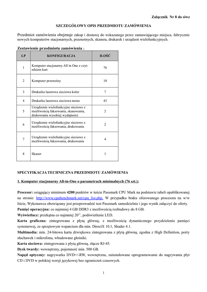Załącznik Nr 8 do siwz SZCZEGÓŁOWY OPIS PRZEDMIOTU ZAMÓWIENIA Przedmiot zamówienia obejmuje zakup i dostawę do wskazanego przez zamawiającego miejsca, fabrycznie nowych komputerów stacjonarnych, przenośnych, skanera, drukarek i urządzeń wielofunkcyjnych. Zestawienie przedmiotu zamówienia : LP KONFIGURACJA ILOŚĆ 1 Komputer stacjonarny All in One z czytnikiem kart 76 2 Komputer przenośny 10 3 Drukarka laserowa sieciowa kolor 7 4 Drukarka laserowa sieciowa mono 43 5 Urządzenie wielofunkcyjne sieciowe z możliwością faksowania, skanowania, drukowania wysokiej wydajności 2 6 Urządzenie wielofunkcyjne sieciowe z możliwością faksowania, drukowania 2 7 Urządzenie wielofunkcyjne sieciowe z możliwością faksowania, drukowania 4 8 Skaner 1 SPECYFIKACJA TECHNICZNA PRZEDMIOTU ZAMÓWIENIA 1. Komputer stacjonarny All-in-One o parametrach minimalnych (76 szt.): Procesor: osiągający minimum 4200 punktów w teście Passmark CPU Mark na podstawie tabeli opublikowanej na stronie: http://www.cpubenchmark.net/cpu_list.php. W przypadku braku oferowanego procesora na w/w liście, Wykonawca obowiązany jest przeprowadzić test Passmark samodzielnie i jego wynik załączyć do oferty. Pamięć operacyjna: co najmniej 4 GB DDR3 z możliwością rozbudowy do 8 GB. Wyświetlacz: przekątna co najmniej 20’’, podświetlenie LED. Karta graficzna: zintegrowana z płytą główną, z możliwością dynamicznego przydzielenia pamięci systemowej, ze sprzętowym wsparciem dla min. DirectX 10.1, Shader 4.1. Multimedia: min. 24-bitowa karta dźwiękowa zintegrowana z płytą główną, zgodna z High Definition, porty słuchawek i mikrofonu, wbudowane głośniki. Karta sieciowa: zintegrowana z płytą główną, złącze RJ-45. Dysk twardy: wewnętrzny, pojemność min. 500 GB. Napęd optyczny: nagrywarka DVD+/-RW, wewnętrzna, zainstalowane oprogramowanie do nagrywania płyt CD i DVD w polskiej wersji językowej bez ograniczeń czasowych. 1 Klawiatura: przewodowa, układ klawiszy QWERTY. Mysz: optyczna, interfejs USB, 2 przyciski i rolka przewijania, podkładka. Zewnętrzne porty I/O: min. 4xUSB (w tym co najmniej dwa porty USB 3.0). Czytnik kart mikroprocesorowych: zewnętrzny, podłączany przez port USB, zgodny ze standardem PC/SC, zgodny z Microsoft WHQL (Windows Hardware Quality Labs). Odczyt dostępnych na rynku kart kryptograficznych zgodnych z normą ISO-7816, a w szczególności współpraca z kartami w standardzie PKCS#11 co najmniej w wersji 2.01. Współpraca z obecnie użytkowanymi w Policji kartami CRYPTOTECH MULTI SIGN, OBERTUR ID ONE ENCARD. Sterowniki do systemu Windows XP, Windows Vista, Windows 7 32/64-bit. Sterowniki czytnika zainstalowane w systemie operacyjnym. Czytnik musi współpracować z posiadanym przez Policję systemem Bezpiecznego Trybu Uwierzytelniania Użytkowników funkcjonującym w Policyjnej Sieci Transmisji Danych. Zamawiający dopuszcza zastosowanie czytnika wbudowanego w klawiaturę. System operacyjny: Microsoft Windows 7 Professional 64-bit PL wraz z najnowszą obowiązująca wersją Service Pack (lub równoważny), dołączona licencja i nośnik instalacyjny; system operacyjny powinien zostać zainstalowany (wraz z aktualizacjami dostepnymi na dzień podpisania umowy) na mniejszej partycji; sprzęt powinien posiadać zainstalowane wszystkie sterowniki do wszystkich podzepołów komputera. W przypadku zaproponowania równoważnego systemu operacyjnego należy podać pełną nazwę i wersję systemu. Jeżeli Wykonawca nie poda nazwy równoważnego systemu operacyjnego Zamawiający uzna, że przedmiotem oferty jest system operacyjny wskazany przez Zamawiającego. Za oprogramowanie równoważne do Microsoft Windows 7 Professional PL 64 BIT uznaje się takie, które posiada wbudowane mechanizmy, bez użycia dodatkowych aplikacji, zapewniające: o polska wersja językowa o możliwość instalacji i poprawnego działania oprogramowania dostępnego w ramach posiadanych przez Zamawiającego licencji: Microsoft Office 2010 Std i Office 2010 Pro o możliwość instalacji i poprawnego działania aplikacji wykorzystywanych przez Zamawiającego, tj.: systemy klasy SWD wraz z Uniwersalnym Modułem Mapowym; aplikacje umożliwiające współpracę z Krajowym Systemem Informacyjnym Policji; IBM Lotus Notes. iBase o graficzne środowisko instalacji i konfiguracji. o zapewnienie wsparcia dla większości powszechnie używanych urządzeń (drukarek, urządzeń sieciowych, standardów USB, urządzeń Plug & Play, WiFi). o wyposażenie systemu w zintegrowaną zaporę sieciową wraz z konsolą do zarządzania ustawieniami i regułami IP v4 i v6. o wyposażenie systemu w graficzny interfejs użytkownika w języku polskim. o zintegrowanie w systemie modułu pomocy dla użytkownika w języku polskim. o zabezpieczony hasłem hierarchiczny dostęp do systemu, konta i profile użytkowników zarządzane zdalnie; praca systemu w trybie ochrony kont użytkowników. o zintegrowane z systemem operacyjnym narzędzia zwalczające złośliwe oprogramowanie; aktualizacja dostępna u producenta nieodpłatnie bez ograniczeń czasowych. 2 o licencja na system operacyjny musi być nieograniczona w czasie, pozwalać na wielokrotne instalowanie systemu na oferowanym sprzęcie bez konieczności kontaktowania się przez Zamawiającego z producentem systemu lub sprzętu. o oprogramowanie powinno zawierać certyfikat autentyczności lub unikalny kod aktywacyjny. o zamawiający nie dopuszcza w systemie możliwości instalacji dodatkowych narzędzi emulujących działanie systemów; Certyfikaty i standardy o Certyfikat ISO9001 lub równoważny dla producenta sprzętu, o Deklaracja zgodności CE, o Potwierdzenie spełnienia kryteriów środowiskowych, w tym zgodności z dyrektywą RoHS Unii Europejskiej o eliminacji substancji niebezpiecznych w postaci oświadczenia producenta jednostki. o Zgodność z normą Energy Star 5.0. 2. Komputer przenośny o parametrach minimalnych (10 szt.): Procesor: osiągaj