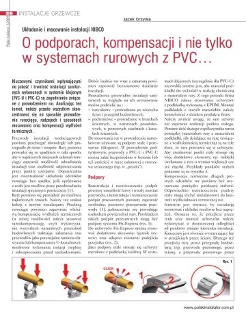 Polski Instalator 2/2009 26 instalacje grzewcze Jacek Grzywa Układanie i mocowanie instalacji NIBCO O podporach, kompensacji i nie tylko w systemach rurowych z PVC… Kluczowymi czynnikami wpływającymi na jakość i trwałość instalacji sanitarnych wykonanych w systemie klejonym (PVC-U i PVC-C) są zagadnienia związane z prowadzeniem rur. Analizując ten temat, należy przede wszystkim skoncentrować się na sposobie prowadzenia rurociągu, rodzajach i sposobach mocowania oraz kompensacji wydłużeń termicznych. Przewody instalacji wodociągowych powinny przebiegać równolegle lub prostopadle do ścian i stropów. Rury poziome prowadzi się ze spadkiem w taki sposób, aby w najniższych miejscach załamań rurociągu zapewnić możliwość odwadniania instalacji oraz możliwość odpowietrzania przez punkty czerpalne. Dopuszczalna jest ewentualność układania odcinków rurociągu bez spadku, jeśli opróżnianie z wody jest możliwe przez przedmuchanie instalacji sprężonym powietrzem [1]. Rury powinno się prowadzić po możliwie najkrótszych trasach. Należy też unikać kolizji z innymi instalacjami. Przebieg rurociągu powinien zapewniać właściwą kompensację wydłużeń termicznych (w miarę możliwości należy stosować samokompensację, czyli wykorzystanie wszystkich naturalnych przeszkód budowlanych traktując załamania tras przewodów jako potencjalne ramiona elastyczne lub kompensatory U-kształtowe), możliwość wykonania izolacji cieplnej i zabezpieczenia przed uszkodzeniami. Dobór średnic rur wraz z armaturą powinien zapewnić bezszumowe działanie instalacji. Prowadzenia przewodów instalacji sanitarnych ze względu na ich usytuowanie można podzielić na : – natynkowe – prowadzone po wierzchu ścian i przegród budowlanych; – podtynkowe – prowadzone w bruzdach ściennych, w warstwach posadzkowych, w pionowych szachtach i kanałach ściennych. Do mocowania rur w prowadzeniu natynkowym używane są podpory stałe i przesuwne (ślizgowe). W prowadzeniu podtynkowym, przewody z PVC-U i PVC-C można zalać bezpośrednio w betonie lub też umieścić w rurze osłonowej z tworzywa sztucznego (np. w „peszlu”). Podpory Konstrukcja i rozmieszczenie podpór powinny umożliwić łatwy i trwały montaż przewodu, a konstrukcja i rozmieszczenie podpór przesuwnych powinny zapewnić swobodne, poosiowe przesuwanie przewodu [1], jednocześnie nie powodując uszkodzeń powierzchni rury. Przykładem takich podpór przesuwnych mogą być podpory systemu Fix-Express (rys. 1). Do uchwytów Fix-Express można stosować dodatkowe akcesoria: łącznik szynowy oraz adapter rozstawu podejścia grzejnika (rys. 2). Jako podpory stałe stosuje się uchwyty metalowe z podkładką ściśliwą. W syste mach klejonych (szczególnie dla PVC-C) niezwykle istotne jest, aby materiał podkładki nie wchodził w reakcję chemiczną z materiałem rury. Z tego powodu firma NIBCO zaleca stosowanie uchwytów z podkładką wykonaną z EPDM. Montaż podkładek z innych materiałów należy konsultować z działem produktu firmy. Należy zwrócić uwagę, że sam uchwyt nie zapewnia realizacji punktu stałego. Pomimo dość dużego współczynnika tarcia pomiędzy materiałem rury a materiałem podkładki, siły działające na rurę (związane z wydłużalnością termiczną) są na tyle duże, że rura przesuwa się w uchwycie. Aby zrealizować punkt stały stosuje się więc dodatkowe elementy, np. naklejki (wykonane z rury o wymiar większej) czy też złączki. Przykłady punktów stałych pokazane są na rysunku 3. Kompensacje termiczne długich prostych odcinków rur powinny być usytuowane pomiędzy punktami stałymi. Odpowiednio rozmieszczone punkty stałe mogą służyć instalatorowi do kontroli wydłużalności termicznej rur. Istotnym jest również, by instalację montować i układać możliwie bez naprężeń. Oznacza to, że przejścia przez tynk oraz montaż uchwytów należy wykonywać w dostatecznej odległości od punktów zmiany kierunku instalacji. Konieczny jest również wystarczający luz w przejściach przez ściany. Dlatego też przejściu rury przez przegrodę budowlaną (np. przewodu poziomego, przez ścianę, a przewodu pionowego przez Rys. 1 www.polskiinstalator.com.pl 27 Rys. 2 Rys. 3 Rys. 4 1 2 Rys. 5 3 1. Zastosowanie dwóch naklejek wykonanych z rury o większej średnicy 2. Zastosowanie dwóch złączek 3. Zastosowanie złączki i dwóch uchwytów strop) należy stosować przepust w tulei ochronnej. Tuleja ochronna powinna być dłuższa niż grubość przegrody pionowej o około 2 cm z każdej strony, a przechodząc przez strop, powinna wystawać około 2 cm powyżej posadzki i około 1 cm poniżej tynku na stropie [1]. W systemie klejonym NIBCO jako tuleje ochronne stosuje się rurę taką samą jak przewód tyle, że o większej średnicy – minimum 2 cm przy przejściu przez przegrodę pionową i minimum 1 cm przy przejściu przez strop (rys. 4). Ważne jest, żeby przepustu przez przegrody budowlane nie traktować jako podpory przesuwnej. W tulei ochronnej nie powinno też znajdować się żadne połączenie przewodu [1]. W trasach pionowych i rozgałęzieniach na piętra prowadzonych szachtami instalacyjnymi należy zwrócić uwagę na to, żeby odgałęzienie miało zapewnioną możliwość kompensowania zmian długości trasy pionowej. Uzyskuje się to przez odpowiednią lokalizację pionowej rury w kanale (rys. 5a), odpowiednio przewymiarowany otwór dla wyprowadzenia [email protected] odgałęzienia (rys. 5b) lub przez montaż ramienia kompensującego (rys. 5c). Dla zapewnienia poprawnej pracy rur ich mocowanie powinno mieć miejsce w określonych odstępach. Rozwiązanie i rozmieszczenie zarówno podpór stałych, jak i przesuwnych powinno być zgodne z projektem technicznym. Nie należy zmieniać rozmieszczenia i rodzaju podpór bez akceptacji projektanta instalacji, nawet jeśli nie zmienia to zaprojektowanego układu kompensacji wydł