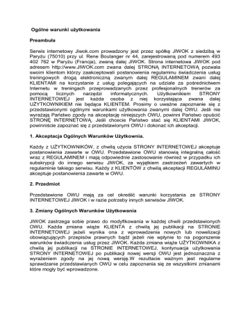Ogólne warunki użytkowania Preambuła Serwis internetowy Jiwok.com prowadzony jest przez spółkę JIWOK z siedzibą w Paryżu (75010) przy ul. Rene Boulanger nr 44, zarejestrowaną pod numerem 493 402 762 w Paryżu (Francja), zwaną dalej JIWOK. Strona internetowa JIWOK pod adresem http://www.JIWOK.com zwana dalej STRONĄ INTERNETOWĄ pozwala swoim klientom którzy zaakceptowali postanowienia regulaminu świadczenia usług treningowych drogą elektroniczną zwanym dalej REGULAMINEM zwani dalej KLIENTAMI na korzystanie z usług polegających na udziale za pośrednictwem Internetu w treningach przeprowadzanych przez profesjonalnych trenerów za pomocą licznych narzędzi informatycznych. Użytkownikiem STRONY INTERNETOWEJ jest każda osoba z niej korzystająca zwana dalej UŻYTKOWNIKIEM nie będąca KLIENTEM. Prosimy o uważne zapoznanie się z przedstawionymi ogólnymi warunkami użytkowania zwanymi dalej OWU. Jeśli nie wyrażają Państwo zgody na akceptację niniejszych OWU, powinni Państwo opuścić STRONĘ INTERNETOWĄ. Jeśli chcecie Państwo stać się KLIENTAMI JIWOK, powinniście zapoznać się z przedstawionymi OWU i dokonać ich akceptacji. 1. Akceptacja Ogólnych Warunków Użytkownia. Każdy z UŻYTKOWNIKÓW, z chwilą użycia STRONY INTERNETOWEJ akceptuje postanowienia zawarte w OWU. Przedstawione OWU stanowią integralną całość wraz z REGULAMINEM i mają odpowiednie zastosowanie również w przypadku ich subskrypcji do innego serwisu JIWOK, za wyjątkiem zastrzeżeń zawartych w regulaminie takiego serwisu. Każdy z KLIENTÓW z chwilą akceptacji REGULAMINU akceptuje postanowienia zawarte w OWU. 2. Przedmiot Przedstawione OWU mają za cel określić warunki korzystania ze STRONY INTERNETOWEJ JIWOK i w razie potrzeby innych serwisów JIWOK. 3. Zmiany Ogólnych Warunków Użytkowania JIWOK zastrzega sobie prawo do modyfikowania w każdej chwili przedstawionych OWU. Każda zmiana wiąże KLIENTA z chwilą jej publikacji na STRONIE INTERNETOWEJ jeżeli wynika ona z wprowadzenia nowych lub nowelizacji obowiązujących przepisów prawnych bądź jeżeli nie wpłynie to na pogorszenie warunków świadczenia usług przez JIWOK. Każda zmiana wiąże UŻYTKOWNIKA z chwilą jej publikacji na STRONIE INTERNETOWEJ, kontynuacja użytkowania STRONY INTERNETOWEJ po publikacji nowej wersji OWU jest jednoznaczna z wyrażeniem zgody na jej nową wersję.W rezultacie ważnym jest regularne sprawdzanie przedstawianych OWU w celu zapoznania się ze wszystkimi zmianami które mogły być wprowadzone. 4. Kwalifikowanie Rejestracja na STRONIE INTERNETOWEJ JIWOK jako KLIENT może być uznana za nieważną jeśli nie zostaną spełnione poniższe warunki. UŻYTKOWNIK STRONY INTERNETOWEJ JIWOK deklaruje i gwarantuje, że: a) Wszystkie dane podane w czasie rejestracji są prawdziwe i poprawne. b) Wszelkie zmiany danych zostaną wprowadzone na indywidualnym koncie. c) Jest osobą pełnoletnią. d) Użytkowanie STRONY INTERNETOWEJ nie stanowi naruszenia powszechnie obowiązujących przepisów prawa lub REGULAMINU. e)Używanie STRONY INTERNETOWEJ JIWOK odbywa się zgodnie z jej przeznaczeniem. Indywidualne konto i świadczone usługi mogą zostać zawieszone bez uprzedzenia jeśli JIWOK podejmie informację o nieprawdziwości podanych danych. 5. Identyfikator Podczas rejestracji należy wybrać identyfikator składający się z adresu e-mail i hasła. KLIENT jest całkowicie odpowiedzialny za poufność w/w identyfikatora. W żadnym wypadku nie należy używać konta lub identyfikatora innego KLIENTA oraz udostępniać identyfikatora osobom trzecim. Jeśli zaistnieje podejrzenie nieautoryzowanego użytkowania konta lub dostępu do identyfikatora należy natychmiast powiadomić o tym JIWOK lub osobę uprawnioną do konta. 6. Odpowiedzialność JIWOK JIWOK nie ponosi odpowiedzialności za skutki użytkowania STRONY INTERNETOWEJ w celu i sposób inny niż w przewidziany w OWU oraz w REGULAMINIE. JIWOK angażuje wszystkie swoje siły by zapewnić UŻYTKOWNIKOWI i KLIENTOWI informacje oraz usługi w pełni zweryfikowane.JIWOK zastrzega sobie prawo do czasowego zawieszenia dostępu do swoich usług w związku z dokonaniem koniecznych czynności konserwacyjnych. JIWOK zobowiązuje się do udostępnienia z odpowiednim wyprzedzeniem informacji o planowanym terminie przerwy oraz czasie jej trwania. JIWOK zobowiązuje się do użycia wszelkich środków, aby skrócić do minimum czas trwania przerwy.JIWOK zobowiązuje się wdrożyć stosowne środki w celu zapewnienia bezpieczeństwa i poufności danych przekazanych JIWOK poprzez STRONĘ INTERNETOWĄ. 7. Prawa autorskie do zawartości STRONY INTERNETOWEJ przysługujące JIWOK – ograniczenia w korzystaniu z licencji. Elementy STRONY INTERNETOWEJ takie jak grafika, logo, rysunki, teksty, ikonki, skrypty, aplikacje, oprogramowanie, funkcje jak również wszelkie ich kombinacje, z wyłączeniem treści przekazanych przez KLIENTA (zwane dalej wspólnie „ZAWARTOŚCIĄ STRONY”) są wyłączną własnością JIWOK i jej udziałowców. ZAWARTOŚĆ STRONY nie może być modyfikowana, kopiowana, dystrybuowana, wstawiana, reprodukowana, przesyłana, publikowana, transmitowana lub sprzedawana w jakiejkolwiek formie lub w jakikolwiek sposób, w całości lub częściowo, bez uprzedniej zgody JIWOK. UŻYTKOWNIK i KLIENT jest uprawniony do korzystania z ZAWARTOŚCI STRONY na warunkach przewidzianych w niniejszych OWU. Korzystanie ze STRONY INTERNETOWEJ inne niż przewidziane niniejszymi OWU lub z naruszeniem przepisów prawa lub praw osób trzecich jest zabronione i pociąga za sobą pozbawienie prawa do dalszego użytkowania STRONY INTERNETOWEJ JIWOK. 8. Muzyka JIWOK oddaje do bezpłatnego korzystania katalog fragmentów muzyki mające charakter „dobra wspólnego”. Fragmenty tej muzyki są zapisane w prywatnym folderze KLIENTA i są do jego całkowitej dyspozycji. Może on ich używać do wygenerowania treningów w Mp3 oraz/lub tworzyć osobne pliki muzyczne. W 