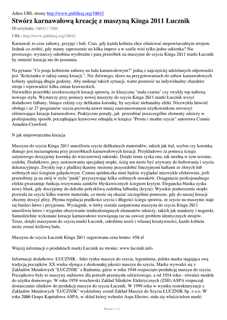 Adres URL strony http://www.publikuj.org/10842 Stwórz karnawałową kreację z maszyną Kinga 2011 Łucznik ID artykułu: 10842 / 1908 URL: http://www.publikuj.org/10842 Karnawał, to czas zabawy, przyjęć i bali. Czas, gdy każda kobieta chce olśniewać niepowtarzalnym strojem. Jednak co zrobić, gdy mamy zaproszenie na kilka imprez a w szafie wisi tylko jedna sukienka? Nic prostszego, wystarczy odrobina wyobraźni i parę przeróbek na maszynie do szycia Kinga 2011 marki Łucznik by zmienić kreację nie do poznania. Na pytanie "Co psuje kobietom zabawę na balu karnawałowym?" jedną z najczęściej udzielanych odpowiedzi jest "Koleżanka w takiej samej kreacji.". Nic dziwnego, skoro na przygotowaniach do zabaw karnawałowych kobiety spędzają długie godziny. Aby uniknąć takich sytuacji, warto postawić na indywidualny charakter stroju i wprowadzić kilka zmian krawieckich. Niewielkie przeróbki zeszłorocznych kreacji sprawią, że klasyczna "mała czarna" czy zwykły top nabiorą nowego stylu. Wystarczy przy pomocy nowej maszyny do szycia Kinga 2011 marki Łucznik wszyć dodatkowe falbany, lśniące cekiny czy delikatna koronkę, by uzyskać niebanalny efekt. Niezwykła łatwość obsługi i aż 27 programów szycia pozwolą nawet mniej zaawansowanym użytkownikom stworzyć olśniewające kreacje karnawałowe. Praktyczne porady, jak przerabiać poszczególne elementy odzieży w profesjonalny sposób, początkujące krawcowe odnajdą w książce "Proste i modne szycie" autorstwa Connie Amaden-Crawford. N jak niepowtarzalna kreacja Maszyna do szycia Kinga 2011 umożliwia szycie delikatnych materiałów, takich jak tiul, szyfon czy koronka, dlatego jest niezastąpiona przy przeróbkach karnawałowych kreacji. Przykładowo za pomocą ściegu satynowego doszyjemy koronkę do wieczorowej sukienki. Dzięki temu zyska ona, tak modną w tym sezonie, ozdobę. Dodatkowo, przy zastosowaniu specjalnej stopki, ścieg ten może być używany do haftowania i szycia dekoracyjnego. Zwykły top z gładkiej tkaniny możemy przyozdobić finezyjnymi haftami ze złotych lub srebrnych nici ściegiem gałązkowym. Czarna spódniczka mini będzie wyglądać niezwykle efektownie, jeśli przerobimy ja na strój w stylu "punk" przyszywając kilka srebrnych suwaków. Osiągnięcie profesjonalnego efektu gwarantuje funkcja wszywania zamków błyskawicznych ściegiem krytym. Elegancka bluzka zyska nowy blask, gdy doszyjemy do dekoltu połyskliwą ozdobną falbankę (kryzę). Wysokie podnoszenie stopki pozwala na szycie kilku warstw materiału, co może się okazać szczególnie pomocne, gdy do naszej kreacji chcemy doszyć plisy. Płynna regulacja prędkości szycia i długości ściegu sprawia, że szycie na maszynie staje się bardzo łatwe i przyjemne. Wysięgnik, w który została zaopatrzona maszyna do szycia Kinga 2011 umożliwia łatwe i wygodne obszywanie trudnodostępnych elementów odzieży, takich jak mankiety i nogawki. Samodzielnie wykonane kreacje karnawałowe rozwiązują raz na zawsze problem identycznych strojów. Teraz, dzięki maszynom do szycia marki Łucznik, odrobinie teorii i własnej kreatywności, każda kobieta może zostać królową balu. Maszyna do szycia Łucznik Kinga 2011 sugerowana cena brutto: 450 zł Więcej informacji o produktach marki Łucznik na stronie: www.lucznik.info Informacje dodatkowe: ŁUCZNIK - lider rynku maszyn do szycia, legendarna, polska marka sięgająca swą tradycją początków XX wieku słynąca z doskonałej jakości maszyn do szycia. Marka wywodzi się z Zakładów Metalowych "ŁUCZNIK" z Radomia, gdzie w roku 1948 rozpoczęto produkcję maszyn do szycia. Początkowo były to maszyny stębnowe dla potrzeb przemysłu odzieżowego, a od 1954 roku - również modele do użytku domowego. W roku 1958 wrocławski Zakład Silników Elektrycznych (ZSE) ASPA rozpoczął dostarczanie silników do produkcji maszyn do szycia Łucznik. W 1999 roku w wyniku restrukturyzacji z Zakładów Metalowych "ŁUCZNIK" wydzielony został Zakład Maszyn do Szycia ŁUCZNIK Sp. z o.o. W roku 2006 Grupa Kapitałowa ASPA, w skład której wchodzi Aspa Electro, stała się właścicielem marki Strona 1 / 2 ŁUCZNIK, kontynuując długoletnią tradycję produkcji polskich maszyn do szycia. Obecnie wiodącymi odbiorcami produktów marki ŁUCZNIK są największe sieci elektromarketów i hipermarketów oraz sklepy specjalistyczne. W roku 2010 produkty marki ŁUCZNIK pojawiły się w sprzedaży w Czechach, na Słowacji, w Rumunii, Bułgarii i Irlandii. W roku 2011 produkty Łucznika pojawią się na Ukrainie i Białorusi. Od czterech lat ŁUCZNIK notuje stały wzrost sprzedaży. W 2010 roku wzrost wartości sprzedaży produktów z marką Łucznik wyniósł 5%. Co druga maszyna do szycia kupiona w Polsce nosi logo Łucznika. Aktywacja: 13/01/11 15:12, odsłony: 815 Strona 2 / 2