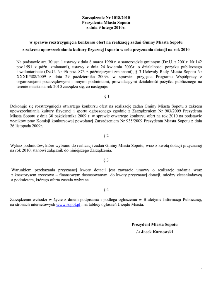 Zarządzenie Nr 1018/2010 Prezydenta Miasta Sopotu z dnia 9