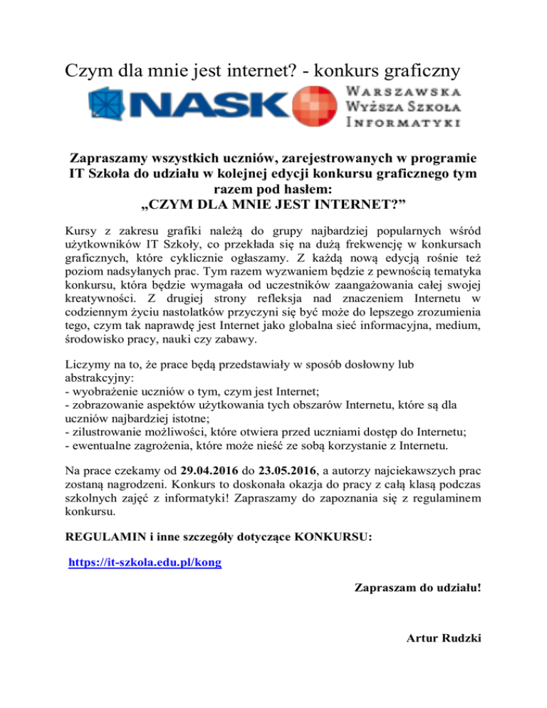 Czym dla mnie jest internet? - konkurs graficzny Zapraszamy wszystkich uczniów, zarejestrowanych w programie IT Szkoła do udziału w kolejnej edycji konkursu graficznego tym razem pod hasłem: „CZYM DLA MNIE JEST INTERNET?” Kursy z zakresu grafiki należą do grupy najbardziej popularnych wśród użytkowników IT Szkoły, co przekłada się na dużą frekwencję w konkursach graficznych, które cyklicznie ogłaszamy. Z każdą nową edycją rośnie też poziom nadsyłanych prac. Tym razem wyzwaniem będzie z pewnością tematyka konkursu, która będzie wymagała od uczestników zaangażowania całej swojej kreatywności. Z drugiej strony refleksja nad znaczeniem Internetu w codziennym życiu nastolatków przyczyni się być może do lepszego zrozumienia tego, czym tak naprawdę jest Internet jako globalna sieć informacyjna, medium, środowisko pracy, nauki czy zabawy. Liczymy na to, że prace będą przedstawiały w sposób dosłowny lub abstrakcyjny: - wyobrażenie uczniów o tym, czym jest Internet; - zobrazowanie aspektów użytkowania tych obszarów Internetu, które są dla uczniów najbardziej istotne; - zilustrowanie możliwości, które otwiera przed uczniami dostęp do Internetu; - ewentualne zagrożenia, które może nieść ze sobą korzystanie z Internetu. Na prace czekamy od 29.04.2016 do 23.05.2016, a autorzy najciekawszych prac zostaną nagrodzeni. Konkurs to doskonała okazja do pracy z całą klasą podczas szkolnych zajęć z informatyki! Zapraszamy do zapoznania się z regulaminem konkursu. REGULAMIN i inne szczegóły dotyczące KONKURSU: https://it-szkola.edu.pl/kong Zapraszam do udziału! Artur Rudzki