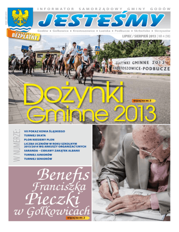 Samo r z ądow y Gm I ny Go dów ISSN 1429-6721 I n fo r mato r Godów ● Gołkowice ● Krostoszowice ● Łaziska ● Podbucze ● Skrbeńsko ● Skrzyszów LIPIEC/SIERPIEŃ2013| NR 4 (98) Dożynki w numerze: Gminne 2013 VII POKAZ KONIA ŚLĄSKIEGO TURNIEJ SKATA PLON NIESIEMY PLON LICZBA UCZNIÓW W ROKU SZKOLNYM 2013/2014 WG ARKUSZY ORGANIZACYJNYCH SARANDA – CIEKAWY ZAKĄTEK ALBANII TURNIEJ JUNIORÓW TURNIEJ SENIORÓW Benefis Franciszka Pieczki w Gołkowicach więcej na str. 2 więcej na str. 5 tŁuMy puBLiCZnoŚCi i wZruSZEniE na BEnEFiSiE Przyjazd Franciszka Pieczki Składanie życzeń przez włodarzy gminy Godowski, a właściwie gołkowicki benefis aktora Franciszka Pieczki, który odbył się 25 sierpnia w sali kinowej Ośrodka Kultury w Gołkowicach, przyciągnął tłumy mieszkańców naszej gminy. I nikt nie żałował tego, że przyszedł,gdyż benefis miał niezwykle ciekawy przebieg, o co zadbali pracownicy Gminnego Centrum Kultury, Sportu i Turystyki w Godowie. Benefis zorganizowany został z okazji 85. urodzin Franciszka Pieczki oraz 60-lecia jego pracy artystycznej. Kilka jego momentów miało szczególnie wzruszający charakter – tak dla Pana Franciszka, który nie krył zaskoczenia ogromną frekwencją, jak i dla gości. Wszystkich wzruszył pokaz slajdów z życia Beneficjenta do piosenki krakowskieP. Wawrzyczny w hołdzie dla Mistrza go artysty Juliana Mere „Franek i Elwry”, napisanej specjalnie dla boF. Pieczka z J. Cnotą hatera benefisu.Na pewno wzruszający był występ młodego artysty Pawła Wawrzycznego ze Skrzyszowa. 11-latek, który gra główną rolę w spektaklu „Mały Książę” w Teatrze Muzycznym w Gliwicach, przedstawił kilka, skierowanych do Pana Franciszka, monologów z granej przez siebie sztuki. Organizatorzy przygotowali też filmik z sondą przeprowadzoną wśród mieszkańców gminy na temat Jubilata i jego twórczości oraz z życzeniami od mieszkańców gminy. Usłyszałem tu na swój temat tyle dobrych słów, że chyba musiałaby mi na stare lata uderzyć do głowy woda sodowa. Ale, proszę się nie obawiać. Nie uderzy – powiedział w swoim stylu Franciszek Pieczka. Niespodzianką dla Pana Franka było spotkanie z innym aktorem, Jerzym Cnotą, urodzonym w sąsiadującym z naszą gminą Jastrzębiu-Zdroju. Obaj aktorzy spotkali się dawno temu na planie filmu „Perła w koronie”. Życzę Ci, Franku, 200 lat życia – mówił Jerzy Cnota, najbardziej kojarzony chyba z rolą zbójnika Gąsiora w „Janosiku”. Na beneTłumnie zgromadzona publiczność fisie obecny był również inny znany aktor Marian Dziędziel. Gdyby nie Franek Pieczka, nie byłbym dziś w tym miejscu życia zawodowego, w którym jestem – powiedział Dziędziel, rodowity gołkowiczanin, obecnie jeden z najbardziej wyrazistych i znanych polskich aktorów. Na benefisie zarecytował on Pieczce Mickiewiczowskie „Stepy Akermańskie” - w tej samej śląskiej wersji, jaką przed wielu laty usłyszeli egzaminujący Dziędziela i osłupiali z wrażenia profesorowie szkoły teatralnej, kiedy zdawał on egzaminy wstępne do krakowskiej PWST. Niespodzianką dla widzów benefisu był film, w którym wspólnie - obok Pieczki – zagrali również Marian Dziędziel, Józef Musioł i Krystian Tesarczyk. Aktorzy wystąpili na... ławeczce rodem z serialu „Ranczo”. Podziękowanie za zorganizowanie Zespół Redakcyjny Trzej koledzy po fachu – F. Pieczka, M. Dziędziel, J. Cnota benefisu sprawy samorządowe LIPIEC / SIERPIeń 2013 W 22 dniu lipca 2013 roku odbyła się XXXVI sesja Rady Gminy Godów. Podjęto uchwały w następujących sprawach: fot. arch. UG Godów Szanowni mieszkańcy gminy godów! • Zmiany Wieloletniej Prognozy Finansowej Gminy Godów na lata 2013-2017; • Zmian w budżecie Gminy Godów na 2013 rok; • Zaciągnięcia kredytu długoterminowego; Dla sfinansowania deficytu budżetu, który wynika z realizowanych przez Gminę Godów zadań inwestycyjnych – między innymi budowa sali gimnastycznej z oddziałami przedszkolnymi oraz budowa kanalizacji sanitarnej, na którą dotacja jest przyznana na rok 2014, zaciągnięcie przedmiotowego kredytu jest konieczne ze względu na potrzebę zapewnienia środków finansowych na zapłatę zobowiązań. • Realizacji projektu „Ja też chcę być przedszkolakiem” w ramach Programu Operacyjnego Kapitał Ludzki; • Realizacji projektu „Przyjazne przedszkole” w ramach Programu Operacyjnego Kapitał Ludzki; W związku z zatwierdzeniem przez Zarząd Województwa Śląskiego listy dotyczącej realizacji projektów w ramach konkursu „ Zmniejszenie nierówności w stopniu upowszechniania edukacji przedszkolnej” Programu Operacyjnego Kapitał Ludzki w Województwie Śląskim, obydwa projekty złożone przez naszą gminę pn. „ Ja też chcę być przedszkolakiem” i „Przyjazne przedszkole” zostały zarekomendowane do dofinansowania. Przyjęcie przedmiotowych uchwał było niezbędne w celu rozpoczęcia realizacji tych projektów w przedszkolach. W 02 dniu września 2013 roku odbyła się XXXVII sesja Rady Gminy Godów. Podjęto uchwały w następujących sprawach: • Udzielenia pomocy finansowej Powiatowi Wodzisławskiemu na realizację zadania w sprawach zarządzania kryzysowego; Ustawa o zarządzaniu kryzysowym oraz o stanie klęski żywiołowej zobowiązuje zarówno Wójta Gminy jak i Starostę Powiatu do prowadzenia działań w sytuacjach kryzysowych oraz w celu zapobieżenia skutkom klęski żywiołowej lub ich usunięcia. Dofinansowanie ma na celu doposażenie magazynu w sprzęt niezbędny do realizacji zadania. Przekazanie środków finansowych w kwocie 6.577,00 zł następuje w formie uchwały. Zgodnie z ustawą o rachunkowości roczne sprawozdania finansowe, między innymi instytucji kultury, podlegają zatwierdzeniu przez organ stanowiący. • Udzielenia pomocy finansowej dla Gminy Lelów poszkodowanej w wyniku powodzi; Pismem z dnia 11.07.2013 r. Wójt Gminy Lelów zwrócił się