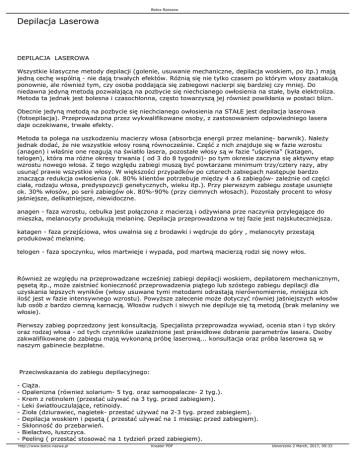 Botox Rzeszow Depilacja Laserowa DEPILACJA LASEROWA Wszystkie klasyczne metody depilacji (golenie, usuwanie mechaniczne, depilacja woskiem, po itp.) mają jedną cechę wspólną - nie dają trwałych efektów. Różnią się nie tylko czasem po którym włosy zaatakują ponownie, ale również tym, czy osoba poddająca się zabiegowi nacierpi się bardziej czy mniej. Do niedawna jedyną metodą pozwalającą na pozbycie się niechcianego owłosienia na stałe, była elektroliza. Metoda ta jednak jest bolesna i czasochłonna, często towarzyszą jej również powikłania w postaci blizn. Obecnie jedyną metodą na pozbycie się niechcianego owłosienia na STAŁE jest depilacja laserowa (fotoepilacja). Przeprowadzona przez wykwalifikowane osoby, z zastosowaniem odpowiedniego lasera daje oczekiwane, trwałe efekty. Metoda ta polega na uszkodzeniu macierzy włosa (absorbcja energii przez melaninę- barwnik). Należy jednak dodać, że nie wszystkie włosy rosną równocześnie. Część z nich znajduje się w fazie wzrostu (anagen) i właśnie one reagują na światło lasera, pozostałe włosy są w fazie "uśpienia" (katagen, telogen), która ma różne okresy trwania ( od 3 do 8 tygodni)- po tym okresie zaczyna się aktywny etap wzrostu nowego włosa. Z tego względu zabiegi muszą być powtarzane minimum trzy/cztery razy, aby usunąć prawie wszystkie włosy. W większości przypadków po czterech zabiegach następuje bardzo znacząca redukcja owłosienia (ok. 80% klientów potrzebuje między 4 a 6 zabiegów- zależnie od części ciała, rodzaju włosa, predyspozycji genetycznych, wieku itp.). Przy pierwszym zabiegu zostaje usunięte ok. 30% włosów, po serii zabiegów ok. 80%-90% (przy ciemnych włosach). Pozostały procent to włosy jaśniejsze, delikatniejsze, niewidoczne. anagen - faza wzrostu, cebulka jest połączona z macierzą i odżywiana prze naczynia przylegające do mieszka, melanocyty produkują melaninę. Depilacja przeprowadzona w tej fazie jest najskuteczniejsza. katagen - faza przejściowa, włos uwalnia się z brodawki i wędruje do góry , melanocyty przestają produkować melaninę. telogen - faza spoczynku, włos martwieje i wypada, pod martwą macierzą rodzi się nowy włos. Również ze względu na przeprowadzane wcześniej zabiegi depilacji woskiem, depilatorem mechanicznym, pęsetą itp., może zaistnieć konieczność przeprowadzenia piątego lub szóstego zabiegu depilacji dla uzyskania lepszych wyników (włosy usuwane tymi metodami odrastają nierównomiernie, mniejsza ich ilość jest w fazie intensywnego wzrostu). Powyższe zalecenie może dotyczyć równiej jaśniejszych włosów lub osób z bardzo ciemną karnacją. Włosów rudych i siwych nie depiluje się tą metodą (brak melaniny we włosie). Pierwszy zabieg poprzedzony jest konsultacją. Specjalista przeprowadza wywiad, ocenia stan i typ skóry oraz rodzaj włosa - od tych czynników uzależnione jest prawidłowe dobranie parametrów lasera. Osoby zakwalifikowane do zabiegu mają wykonaną próbę laserową... konsultacja oraz próba laserowa są w naszym gabinecie bezpłatne. Przeciwskazania do zabiegu depilacyjnego: - Ciąża. Opalenizna (również solarium- 5 tyg. oraz samoopalacze- 2 tyg.). Krem z retinolem (przestać używać na 3 tyg. przed zabiegiem). Leki światłouczulające, retinoidy. Zioła (dziurawiec, nagietek- przestać używać na 2-3 tyg. przed zabiegiem). Depilacja woskiem i pęsetą ( przestać używać na 1 miesiąc przed zabiegiem). Skłonność do przebarwień. Bielactwo, łuszczyca. Peeling ( przestać stosować na 1 tydzień przed zabiegiem). http://www.botox.nazwa.pl Kreator PDF Utworzono 2 March, 2017, 09:33 Botox Rzeszow Opis postępowania przed zabiegiem - Pierwszy zabieg poprzedzony jest konsultacją lekarską. Przed zabiegiem skóra powinna być ogolona, umyta i niczym nieposmarowana. Po opalaniu zabieg można przeprowadzić dopiero po ustąpieniu świeżej opalenizny. Nie wyrywać włosów minimum 4 tygodnie przed zabiegiem. Nie stosować kremów depilujących 1 tydzień przed zabiegiem. Nie wolno stosować: 1. Leków uczulających na słońce np.: antybiotyki- zabieg najwcześniej po tygodniu od zakończenia leczenia; 2. Dziurawca, nagietka (uwagi j/w); 3. Kosmetyków i leków złuszczających - min 1 tydzień przed zabiegiem; 4. Kremów zawierających retinol, isotretinoinę, kwasy owocowe, witaminę C itp. min 1 miesiąc przed zabiegiem; 5. Herbatki wyszczuplającej (np. Figura 2). Zasady postępowania po zabiegu depilacji laserowej: - Zabiegi należy powtarzać, co 6-9 tygodni (zależnie od części ciała oraz cech indywidualnych). Znaczące wydłużenie lub skrócenie przerwy między zabiegami może spowodować słabszy efekt zabiegu. - Nie opalać się. Bezwzględnie chronić skórę przed słońcem minimum przez 2 tygodnie po zabiegu. - Nie wolno stosować: 1. Leków uczulających na słońce; 2. Dziurawca, nagietka; 3. Kosmetyków i leków złuszczających- min do 2 tygodnie po zabiegu; - Przez kilka dni po zabiegu: 1. Nie stosować mydła, spirytusu, toników na bazie alkoholu, dezodorantów, itp.; 2. Nie podrażniać skóry w okolicy zabiegu; 3. 2-3 razy dziennie stosować krem alantan lub bepanten; - Nie wyrywać włosów minimum 6 tygodni (twarz minimum 4 tygodnie). Każda skóra w sposób indywidualny reaguje na przeprowadzony zabieg. Może wystąpić zaczerwienie lub niewielkie podrażnienie okołomieszkowe, bardzo rzadko mogą wystąpić miejscowe przebarwienia lub odbarwienia, które ustępują po kilku dniach. Przy wyjątkowej nadwrażliwości mogą się utrzymywać do kilku tygodni/miesięcy. DLACZEGO LASER LightSheer™ ? Wybór najlepszego urządzenia zajął nam wiele czasu. Na rynku jest dostępnych co najmniej kilka systemów do depilacji (opartych na różnej technologii), a ich skuteczność znacząco się różni. Chcieliśmy zaoferować Państwu usługę na najwyższym poziomie. Naszymi priorytetami przy wyborze lasera były: - najwyższ