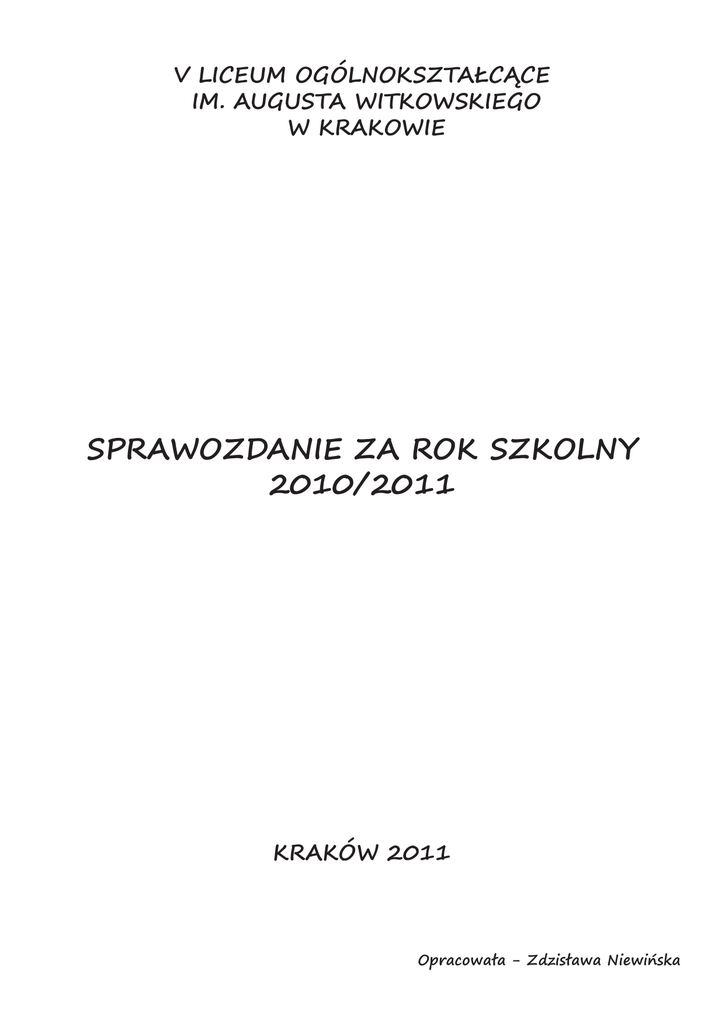 V LICEUM OGÓLNOKSZTAŁCĄCE IM. AUGUSTA WITKOWSKIEGO W KRAKOWIE SPRAWOZDANIE ZA ROK SZKOLNY 2010/2011 KRAKÓW 2011 Opracowała - Zdzisława Niewińska Regulacje V Zakładowe Nowy Rok Szkolny czas rozpocząć 1 września 2010 roku. Godz. 9.00 – Uczniowie klas II i III – spotkanie z wychowawcą w wyznaczonych salach V LO Godz. 10.00 – Msza św. w Kolegiacie św. Anny Godz. 11.00 – Uczniowie klas 1a, b, f, h – spotkanie z Dyrektorem St. Pietrasem – aula szkolna Uczniowie klas 1c, d, e, g – spotkanie z wychowawcą w salach: • 1c- sala 32 • 1d – sala 35 • 1e – sala 36 • 1g – sala 37 Godz. 12.00 – Uczniowie klas 1c, d, e, g – spotkanie z Dyrektorem St. Pietrasem – aula szkolna Uczniowie klas 1a, b, f, h - spotkanie z wychowawcą w salach: • 1a- sala 32 • 1b – sala 35 • 1f – sala 36 • 1h – sala 37 Godz. 13.00 – Egzamin kwalifikujący do grup językowych czterogodzinnych j. angielskiego, j. niemieckiego, j. francuskiego według list zamieszczonych w gablocie obok portierni. Uczniowie, którzy wykazali zerową znajomość ww. języków na zebraniu z rodzicami oraz zakwalifikowani są do grup językowych języka hiszpańskiego i włoskiego nie przystępują do egzaminu. 3 Nauczyciele i pracownicy w roku szkolnym 2010/2011 Nadzorcy Zakładu: Dyrektor: mgr Stanisław Pietras Wicedyrektorzy: dr Marcin Chruściel mgr Zdzisława Niewińska Ochronka Zakładowa mgr Irena Kamińska - pedagog mgr Michał Niewiński – psycholog Lazaret Zakładowy Małgorzata Pyzio - pielęgniarka dyplomowana Zbiory Biblioteczne mgr Urszula Alispahić mgr Danuta Kaniecka Instytut Nauk Humanistycznych Katedra Literatury i Języka Polskiego, tudzież Wiedzy o Kulturze mgr Andrzej Błaszkiewicz dr Marcin Chruściel mgr Maria Hryniewicz mgr Andrzej Kos mgr Dariusz Martynowicz mgr Bożena Ostachowska-Kos mgr Dariusz Pasieka mgr Sylwia Winiarska-Żmigrodzka mgr Dorota Szmiel Katedra Filozofii mgr Renata Skorczyńska Katedra Historii mgr Marek Choiński dr Stanisław Garlicki mgr Józef Jaworski mgr Rafał Kobylec mgr Piotr Boroń Katedra Teologii Katolickiej mgr NataliaTendaj mgr Paweł Gunia mgr Krzysztof Rudzik 4 Instytut Lingwistyczny Katedra Języka Angielskiego mgr Ewa Dudek mgr Joanna Hajda mgr Elżbieta Kandyba mgr Krystyna Klimek mgr Elżbieta Napiórkowska mgr Agnieszka Olszewska-Rabiega mgr Magdalena Płaneta mgr Anna Ostrowska-Paton mgr Maria Skrzypek mgr Agnieszka Sowińska mgr Grażyna Zagórny Katedra Języka Francuskiego mgr Katarzyna Bajer mgr Elżbieta Szewczyk-Gurgul mgr Dorota Kramarz Katedra Języka Hiszpańskiego mgr Marzena Kurzawińska mgr Renata Sokólska-Pyzik Katedra Języka Niemieckiego mgr Iwona Jankowska-Rabiega mgr Barbara Skiendzielewska-Dec mgr Monika Stanula mgr Agnieszka Wojtasiewicz mgr Maria Zborczyńska-Płodzień Katedra Języka Rosyjskiego mgr Regina Gryboś Katedra Języka Włoskiego mgr Aleksandra Bałucka-Grimaldi mgr Natalia Chwaja Instytut Nauk Matematycznych Katedra Matematyki mgr Agnieszka Borcz mgr Lucyna Cięciwa dr Jacek Dymel mgr Ryszard Gruca mgr Beata Gunia mgr Bogusław Kraszewski mgr Tadeusz Matusz 5 Katedra Informatyki i Technologii Informacyjnej mgr Agata Brezdeń dr Andrzej Dyrek mgr Agnieszka Tarnówka-Stec Instytut Nauk Przyrodniczych Katedra Biologii dr Elżbieta Ćwioro mgr Tomasz Gełdon mgr Zdzisława Niewińska mgr Elżbieta Opozda-Zuchmańska Katedra Chemii mgr Katarzyna Makyła mgr Anna Maniak mgr Łukasz Piękoś dr Wojciech Przybylski dr Anna Reizer Katedra Fizyki mgr Anna Głogowska mgr Teresa Mach mgr Barbara Matoga mgr Stanisław Pietras dr Tomasz Zając Katedra Geografii mgr Edyta Osuch mgr Paweł Słowiak Instytut Nauk Społecznych mgr Dawid Drabczyk Katedra Przedsiębiorczości mgr Monika Palonek mgr Renata Górka Katedra Przysposobienia Obronnego mgr Małgorzata Berkowicz-Małek Katedra Aktywności Fizycznej, Sportu i Turystyki mgr Monika Kabłak-Ziembicka mgr Janusz Kosiński mgr Agnieszka Kubić mgr Bogumiła Mrugalska mgr Krzysztof Stolarski mgr Jacek Studnicki 6 Wydział Administracji Sekretariat V Zakładu Kamila Tchórzewska Kinga Kanior Departament Finansów Anna Gałuszka - główna księgowa mgr Edyta Karwat - specjalista ds. płac Departament Administracji i Spraw Ludzkich mgr Natalia Karelus - specjalista ds. kadr mgr Tadeusz Kamiński - kier. administracji Departament Utrzymania Technicznego Zakładu w Stanie ‘Jako - Takim’ i Jego Dalszego ‘Płynnego Rozwoju’ Ryszard Bicz - konserwator Krystyna Hocke – woźna Krzysztof Maciukiewicz - woźny Departament Walki o Utrzymanie Czystości i Utylizacji Pozostałości po działalności V Zakładników Grażyna Grzybowska Józefa Jagocha Teresa Janus Maria Niedbała Agnieszka Sitko 7 Uczniowie w roku szkolnym 2010/2011 Klasa 1a Rozszerzony program nauczania z języka polskiego, języka obcego oraz historii (przedmiot dodatkowy filozofia) Wychowawca - mgr Agata Brezdeń Chmiel Chorąży Dąbrowski Dmitruk Doległo Dworak Frodyma Galica Giś Głownia Jach Kanicka Kmiecik Korczyk Kotlarz Krawczyk Kubik Łucka Magdalena Adrianna Bartosz Aleksander Daria Elżbieta Weronika Justyna Agnieszka Jędrzej Julia Magdalena Joanna Maksymilian Julia Daria Zuzanna Julia Łukasiewicz Michulec Noga Pałka Piastuch Pokrowiecki Pomykała Popko Półchłopek Półkoszek Prokurat Radziun Samiński Siekańska Smaza Starowicz Święchowicz Wróblewska Jakub Karolina Alicja Katarzyna Sławomir Michał Katarzyna Laura Justyna Dominika Dominika Dominika Dariusz Katarzyna Jakub Anna Weronika Emilia Klasa 1b Rozszerzony program nauczania z języka obcego, geografii, wiedzy o społeczeństwie oraz historii (przedmiot dodatkowy filozofia) Wychowawca - dr Stanisaw Garlicki Baran Bąk Bednarski Bień Bochenek Buksik Chart Cieszewska Duśko Gazda Grzywnowicz Jarosz Jędrusiak Kasperowicz Kasprzycka Korzycki Kościelniak Kruczek 8 Kacper Wiktor Rafał Katarzyna Kamil Emilia Melania Marcelina Łukasz Barbara Agata Karina Maciej Filip Marta Jakub Agnieszka Daniel Kryska Kucharczy